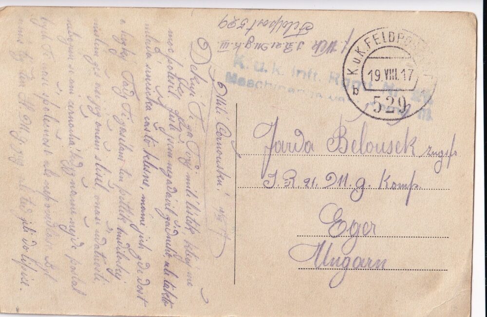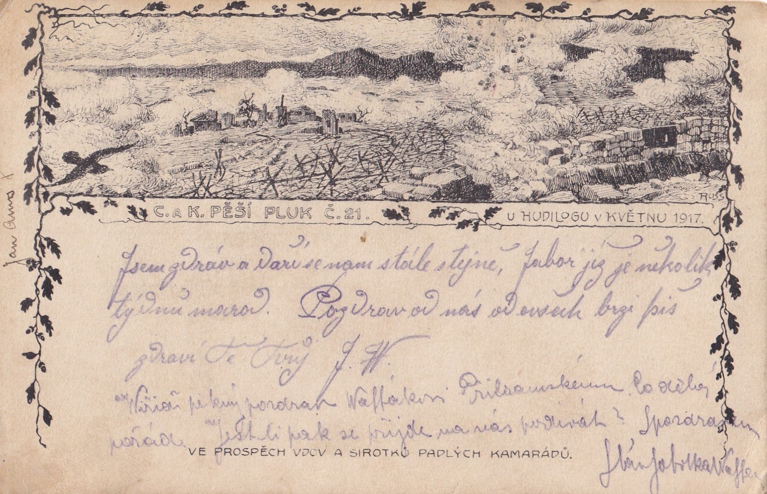 (hhk 74) MF prošlá poštou, r.1917. Ve prospěch vdov a sirotků padlých kamarádů, pěší pluk č.21. Razítko