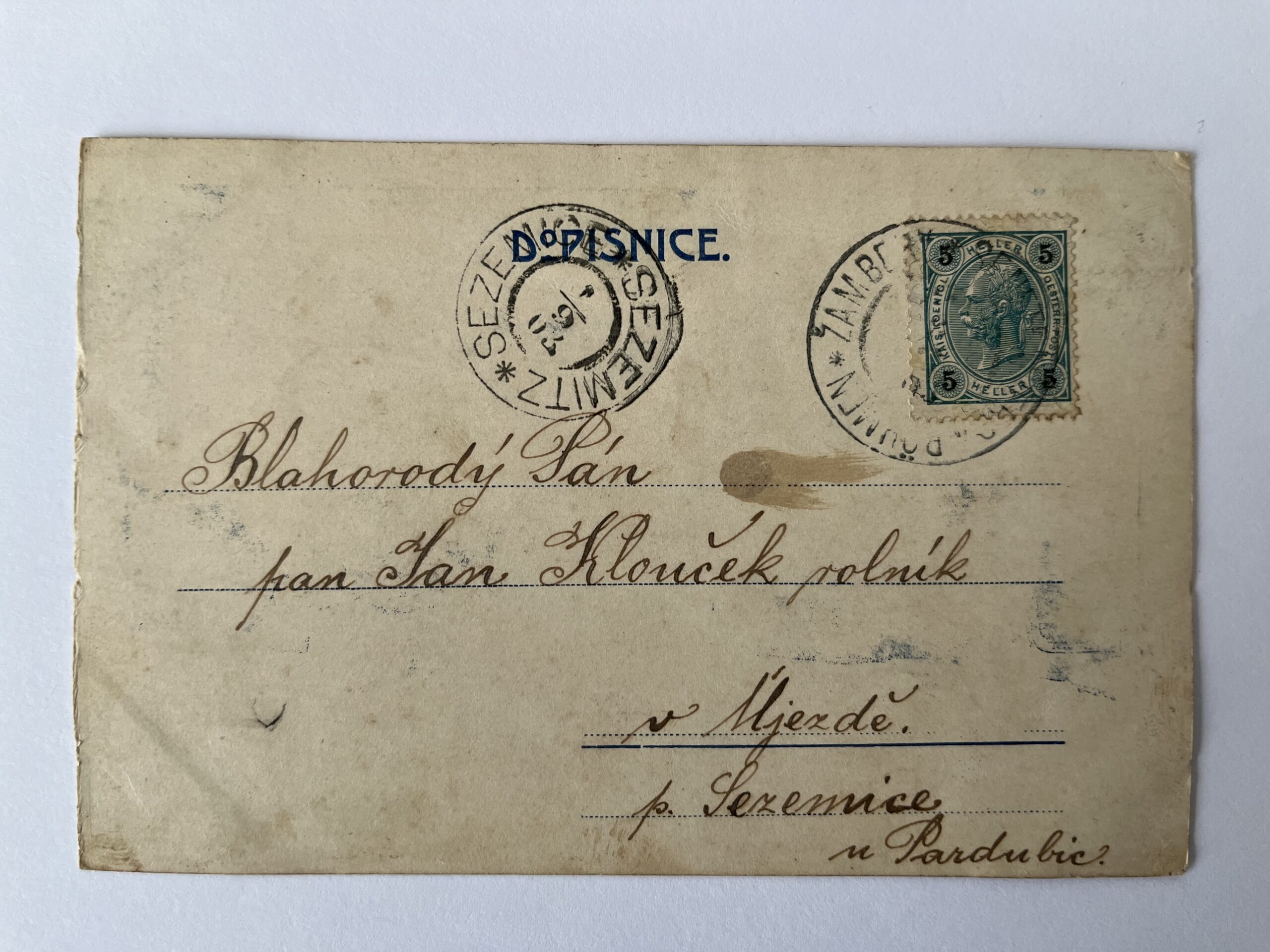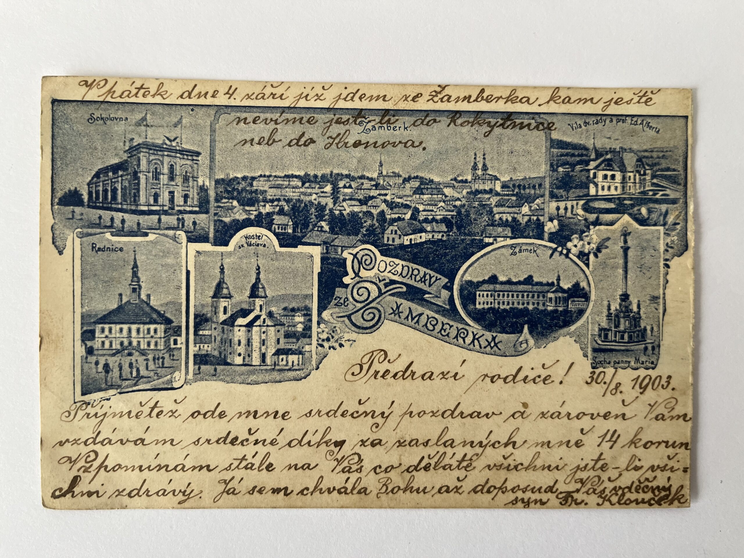 (Ústí nad Orlicí-72) Pohlednice malý formát, prošlá poštou, 1903. Žamberk – koláž. Sokolovna. Kostel. Radnice. Zámek, Socha panny Marie. Vila. Okres Ústí nad Orlicí.