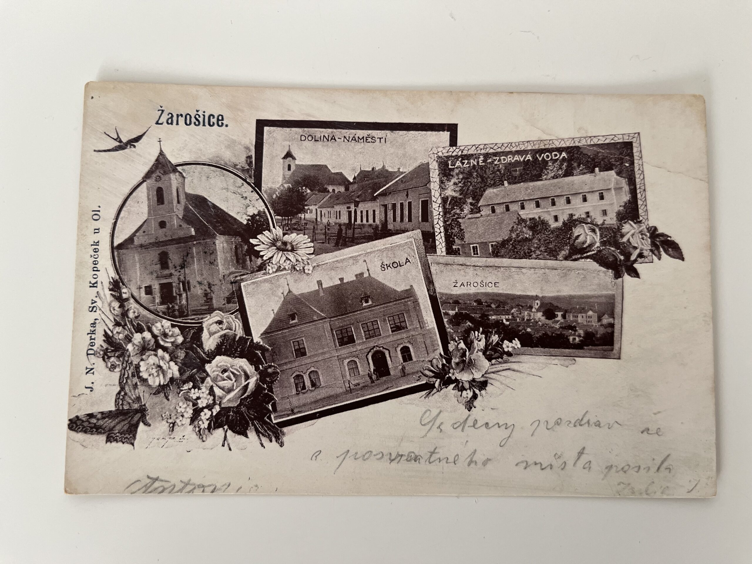 (Hodonín-25) Pohlednice malý formát, prošlá poštou. Koláž – Žarošice. Lázně – Zdravá voda. Škola. Dolina – náměstí. Kostel.