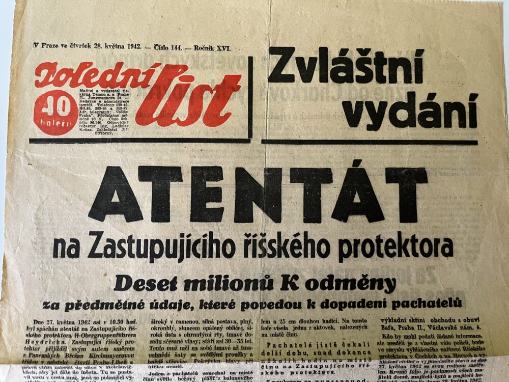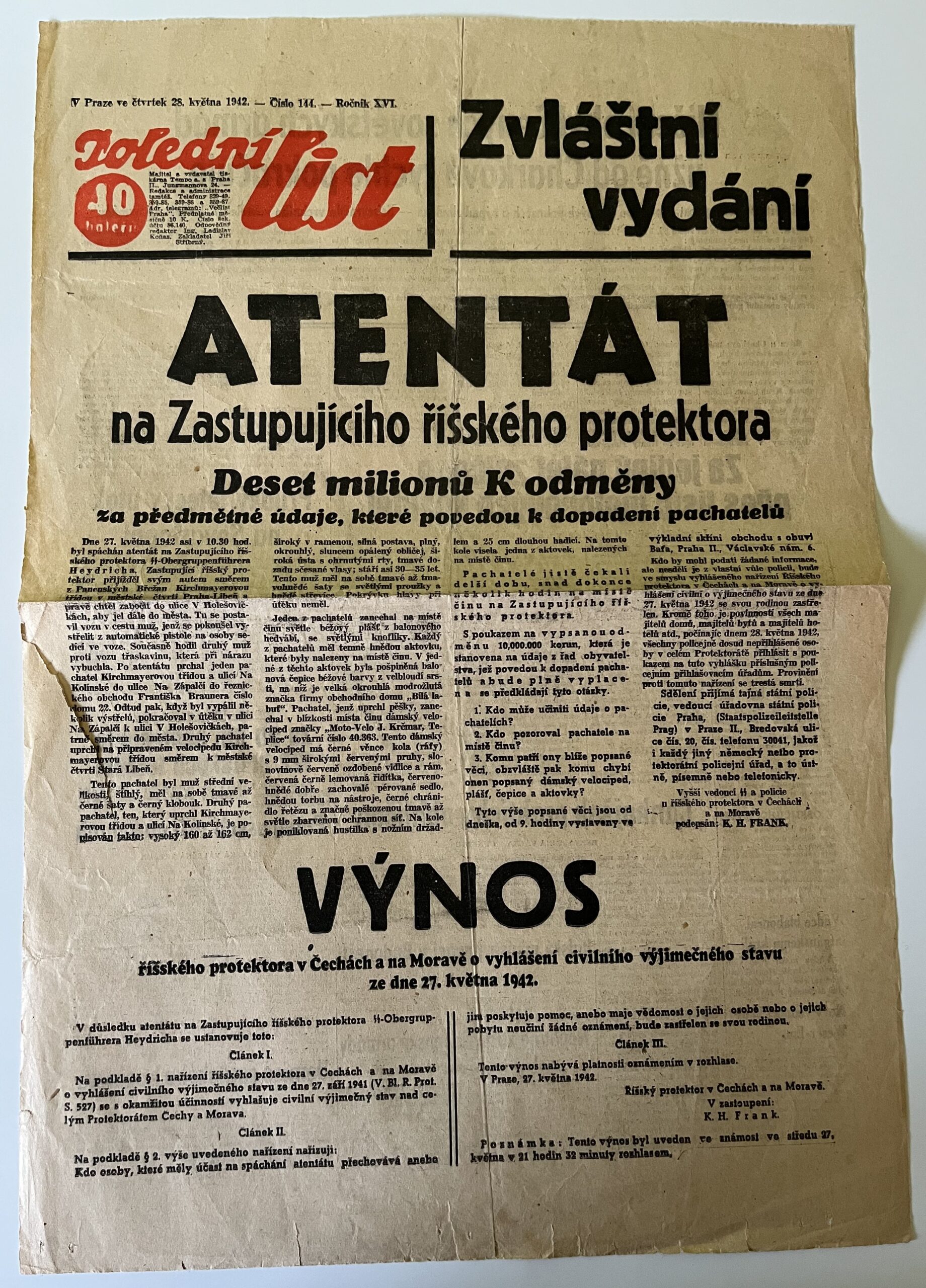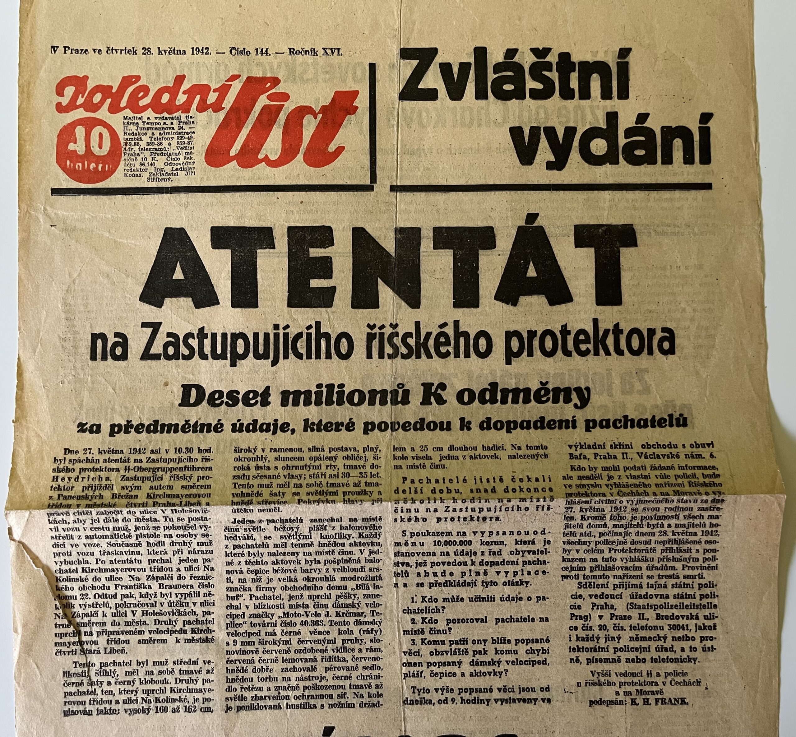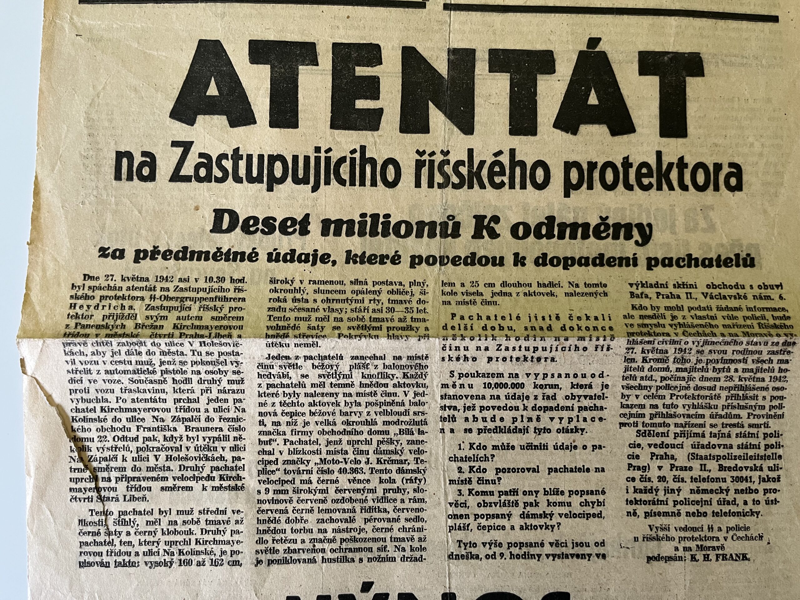 12 (K3-3) Rozměr jedné strany 32 x 47 cm. Atentát na Zastupujícího říšského protektora. Deset milionů K odměny…1 list 28.května 1942. List je natržen.