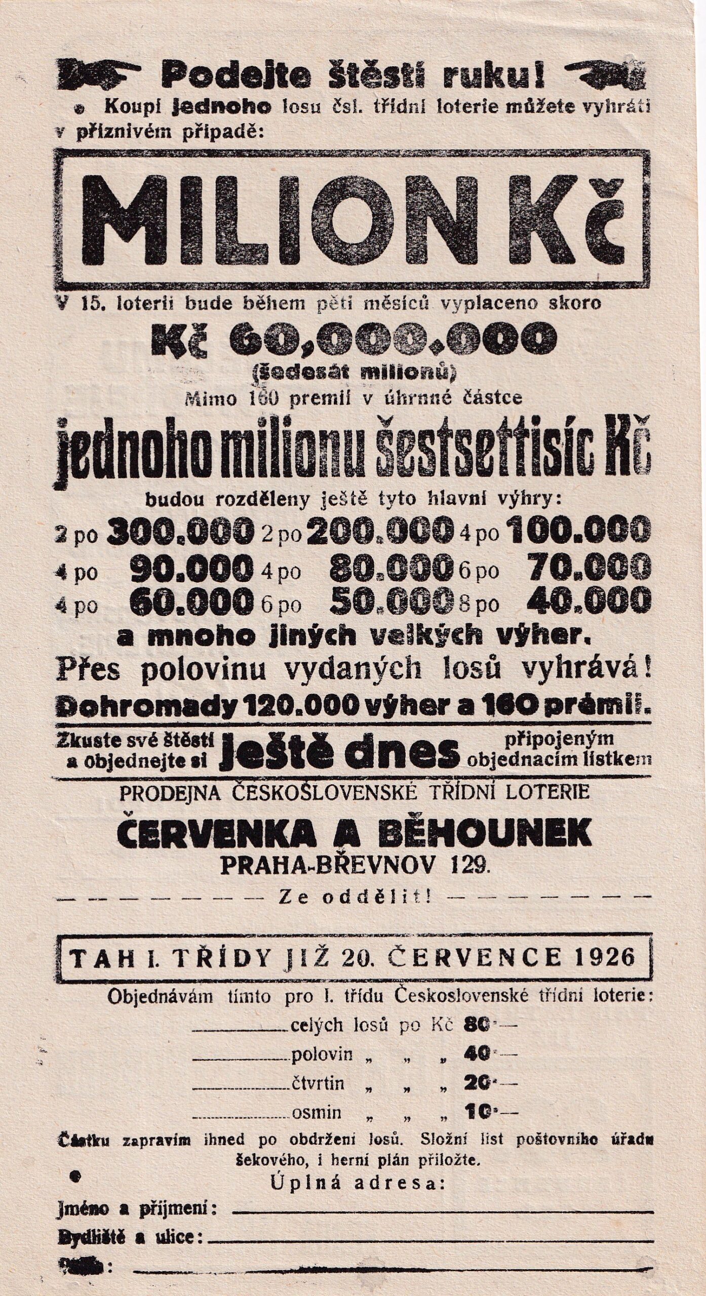 HomeObchodLetákyProdejna čsl.třídní loterie Červenka a Běhounek objednávka 1926