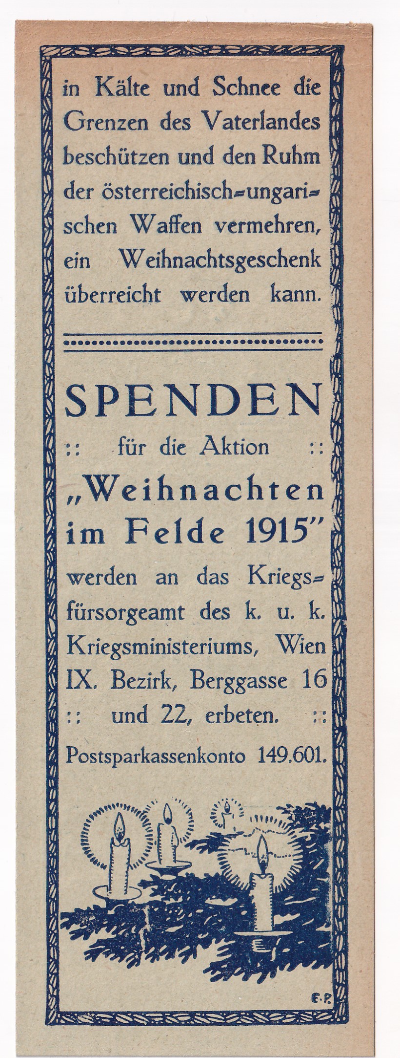 2 (K3-1) Rozměr 6,2 cm x 18 cm. Karta je oboustranná. Vzpomeňte si na naše vojáky v poli. Příspěvky na válečnou pomoc – Vánoce v terénu 1915.