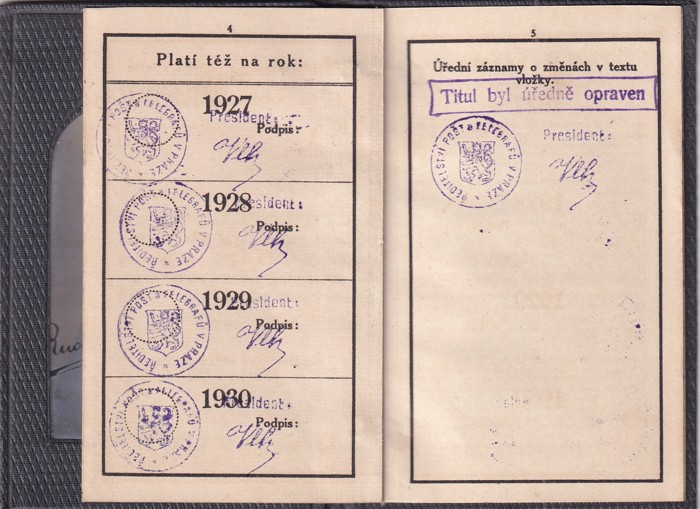 (53) Rozměr 8 x 12 cm, 9 stránek. Průkazka na jízdu, státní dráhy 1926 – telegrafní dozorce Praha. Průkazka je včetně kolku a fotografie.