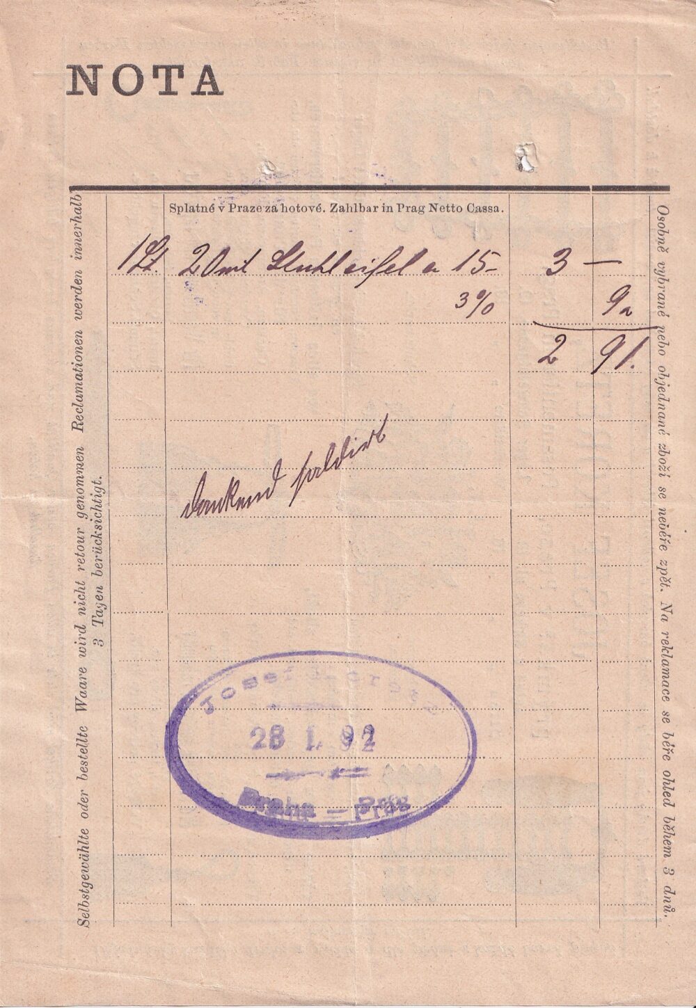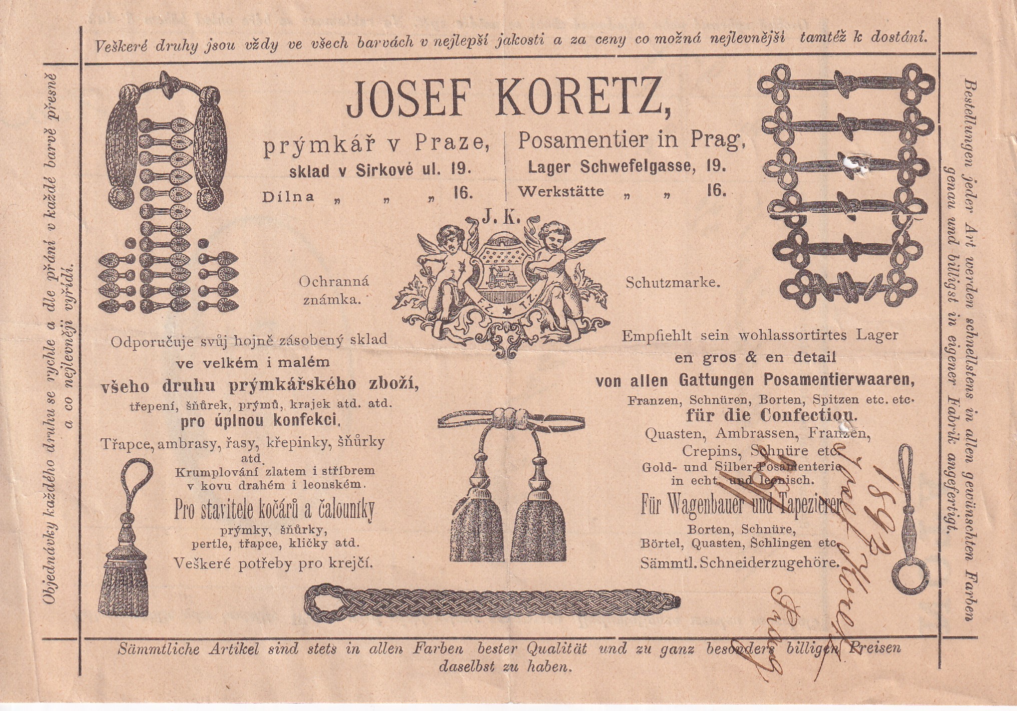 5 (K3-1) Rozměr 17,5 cm x 12 cm, leták je oboustranný. Nabízí ve velkém i malém všeho druhu prýmkařského zboží – třepení, šňůrek, krajek…pro stavitele kočárů a čalouníky, veškeré potřeby pro krejčí aj.
