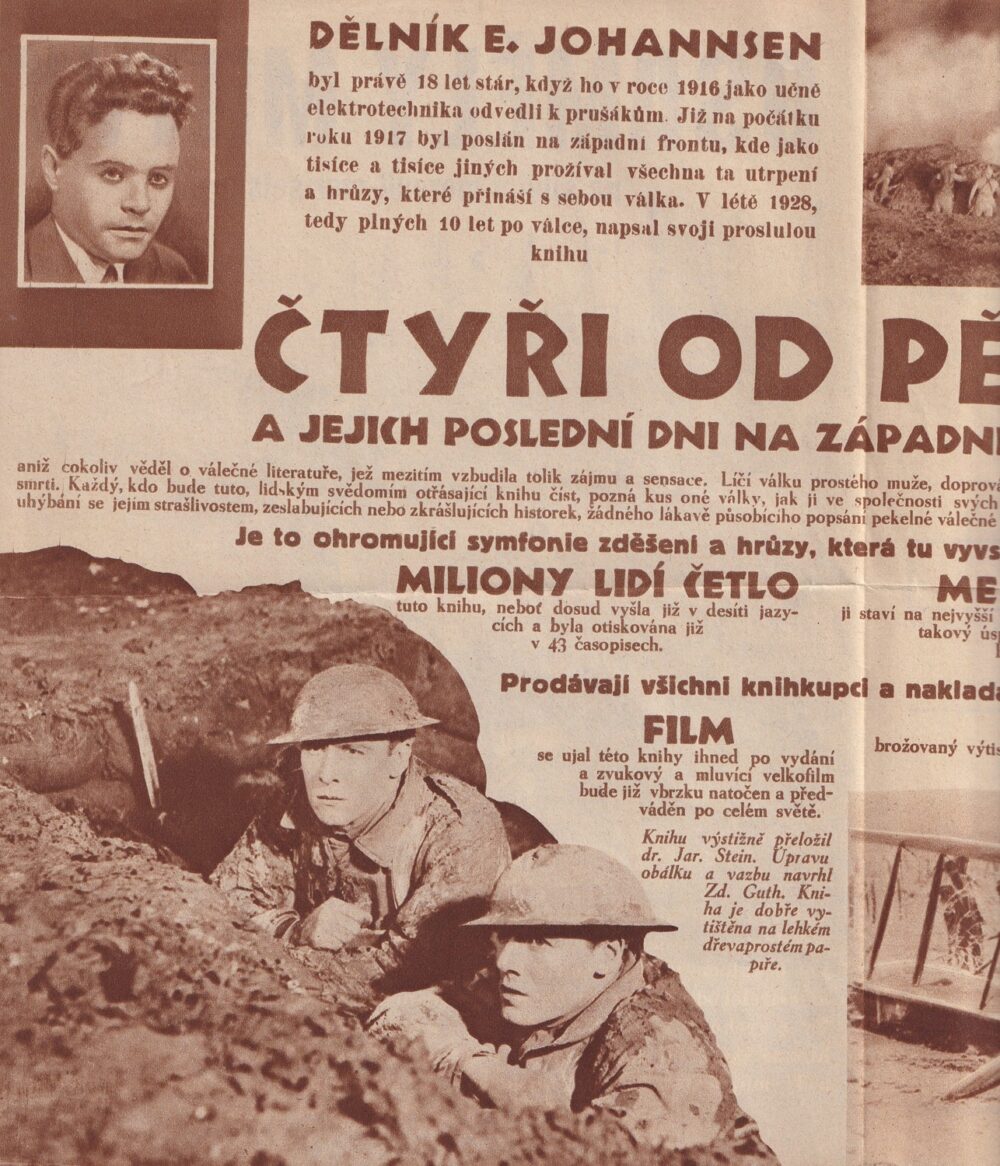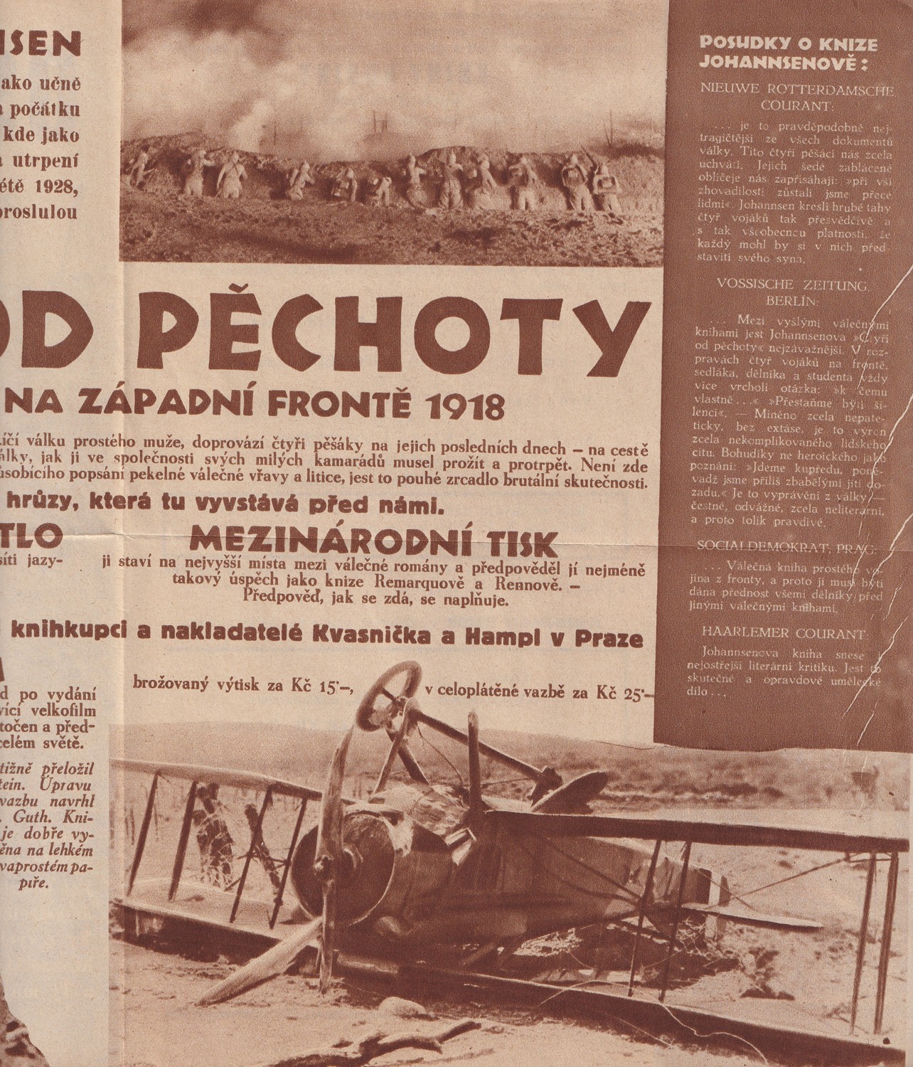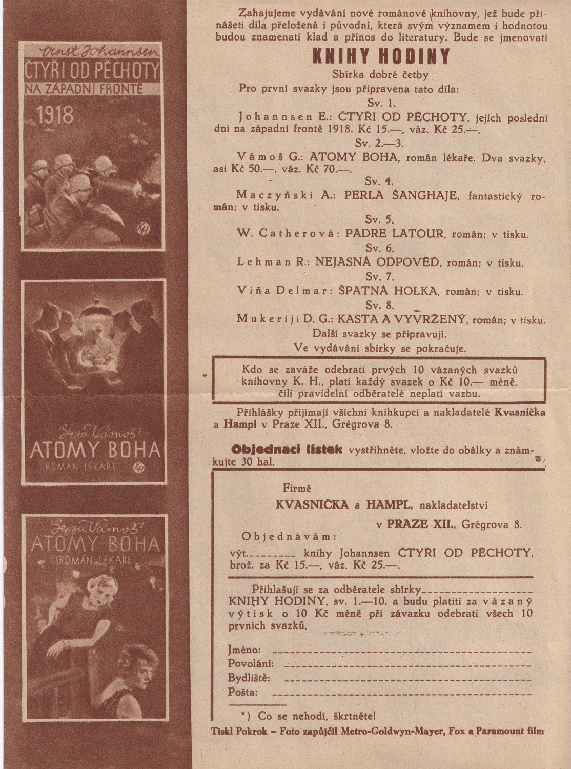 (hhj 40) Rozměr: 18,5 x 25,5 cm. Leták má 4 strany. reklama na knihy Johannsen: Čtyři od pěchoty na Západní frontě 1918. Vámoš: Atomy Boha, román lékaře. Objednací lístek.