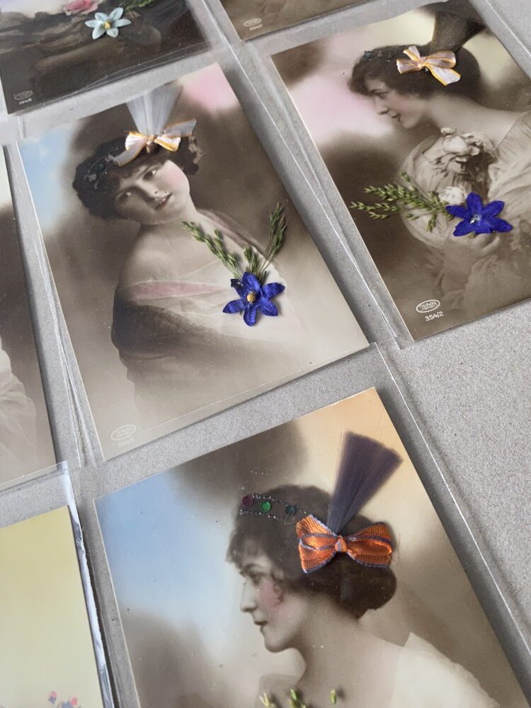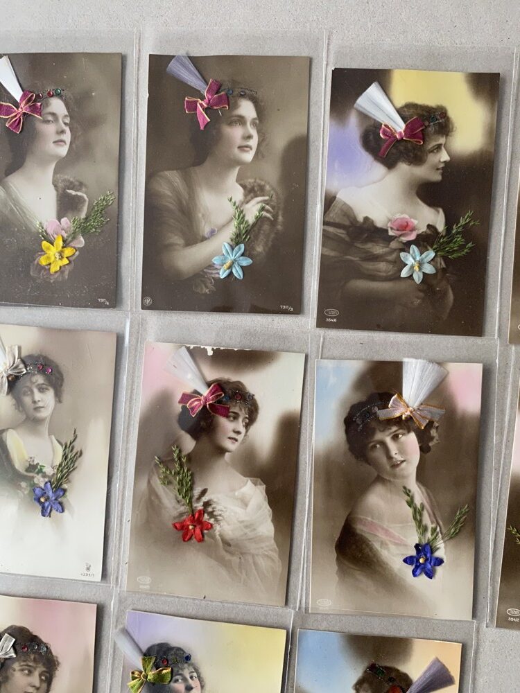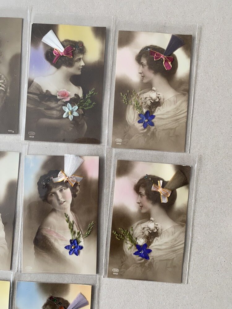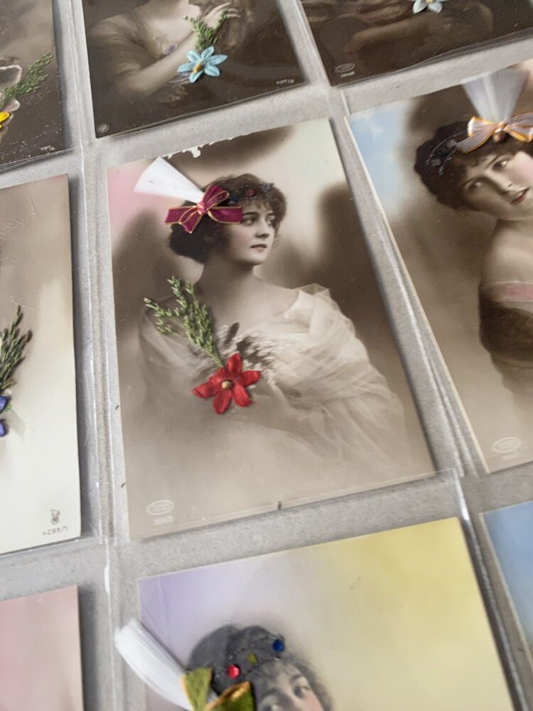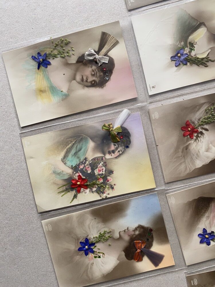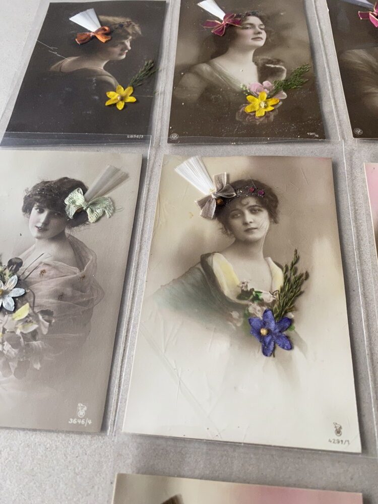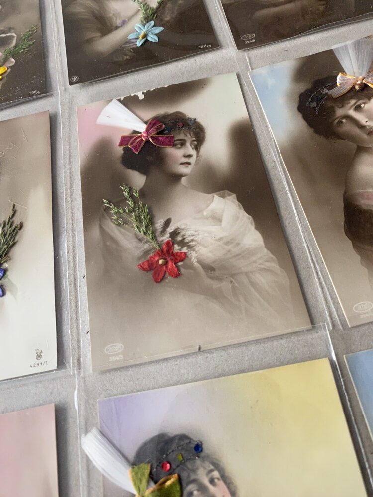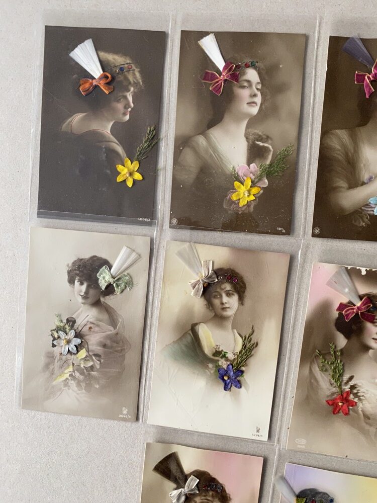 (21) Rozměr pohlednice 8,5 x 13,5 cm, ozdobná čelenka a květinka jsou nalepeny na pohlednici