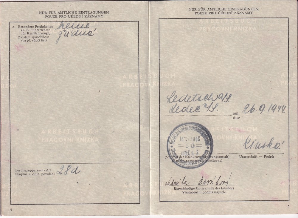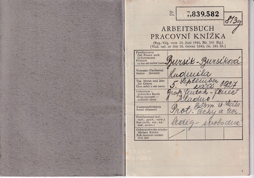 Pracovní knížka Arbeitsbuch – protektorát čechy a morava, žena strážmistra Bursíková Ludmila, v protektorátu bez pracovního zápisu