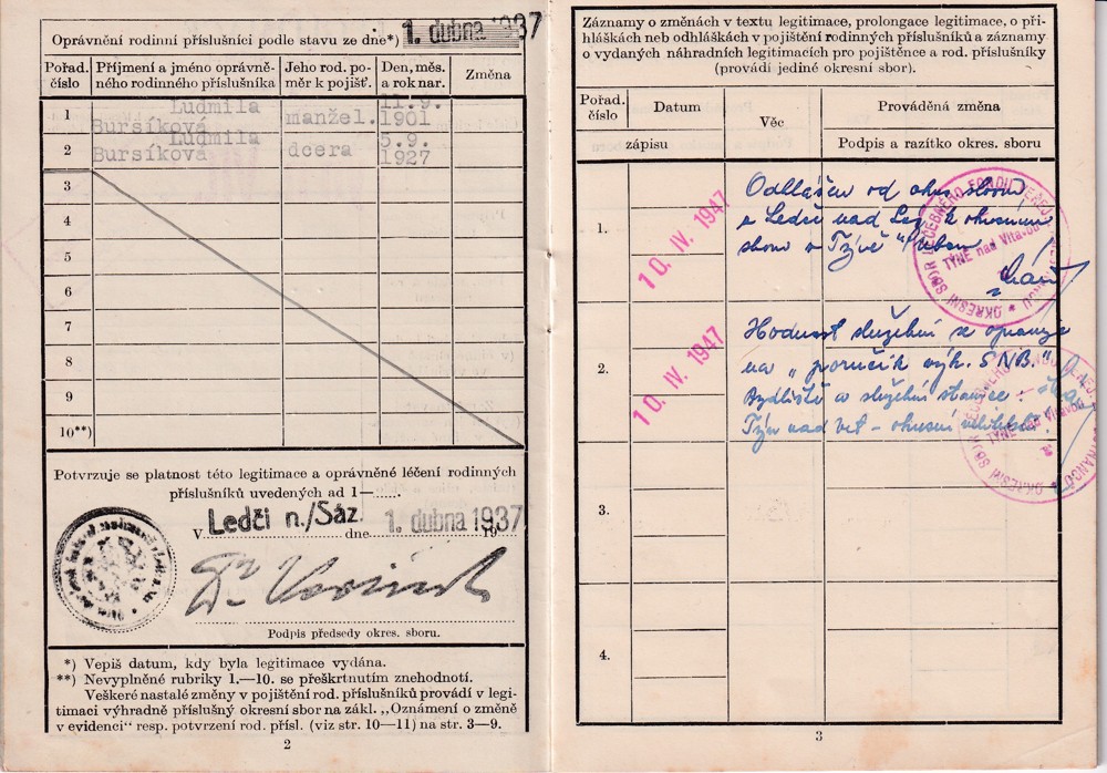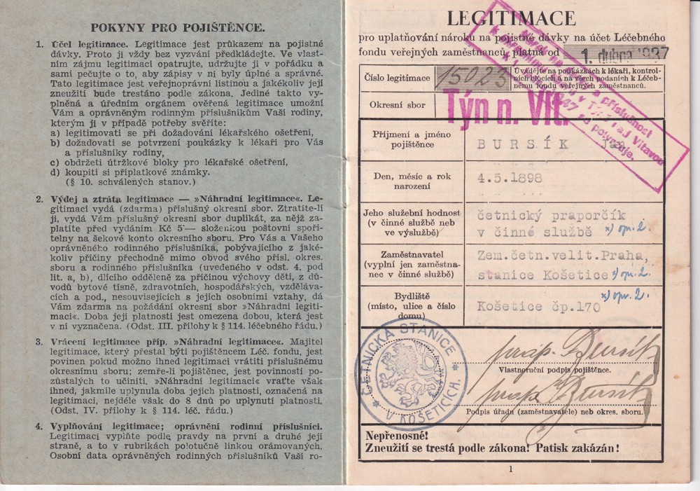 Legitimace pro uplatňování nároku na pojistné dávky na účet Léčebného fondu veřejných zaměstnanců platná od r.1937, se zápisem r.1947 služební hodnost četnický praporčík v činné službě.