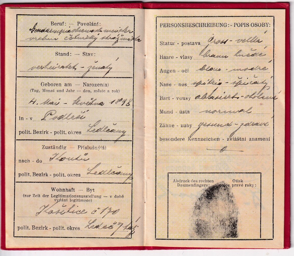 (8) Soubor obsahuje – Občanskou legitimaci z protektorátu čechy a morava s fotografií četnického strážmistra, včetně podpisu a dalších razítek, krásně zachováno, povolání: vrchní četnický strážmistr, Košetice, vydáno r.1940