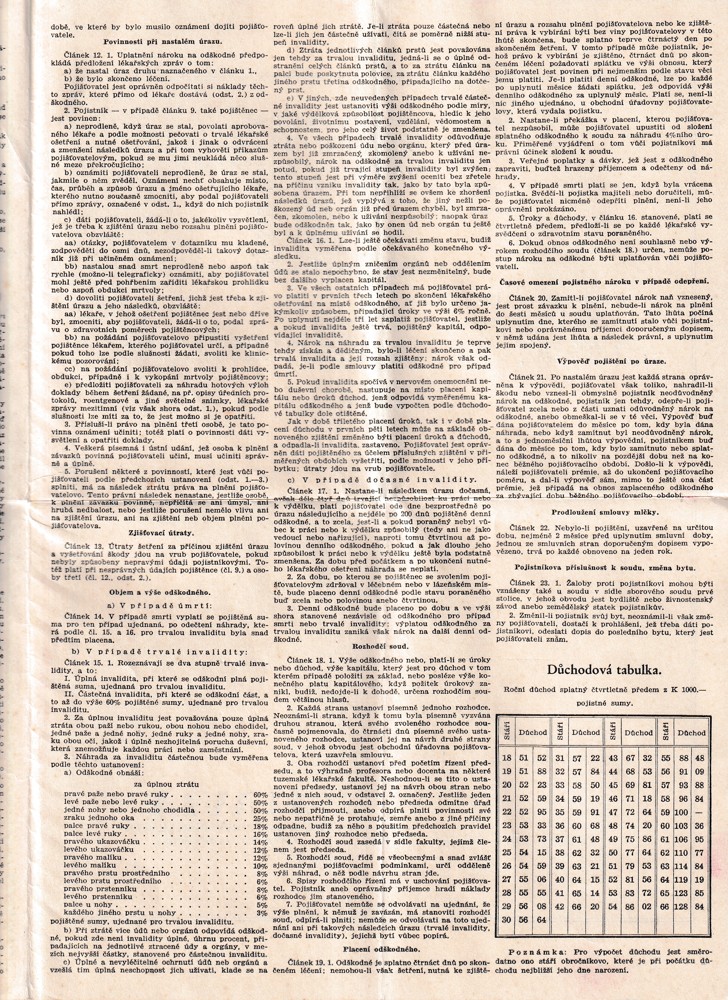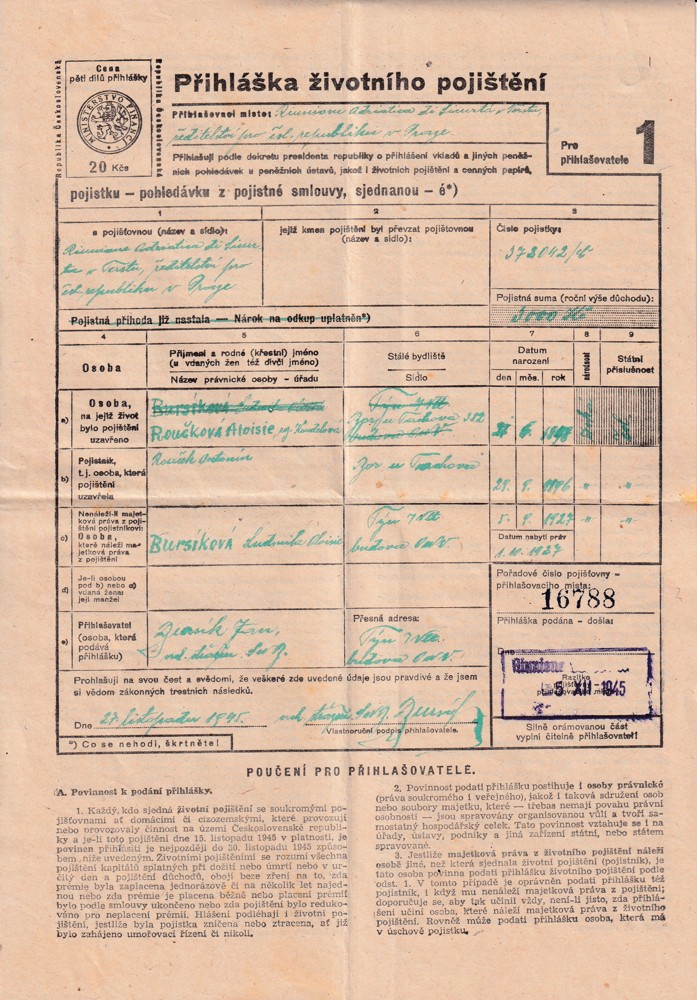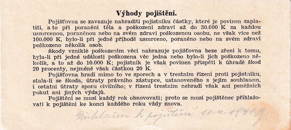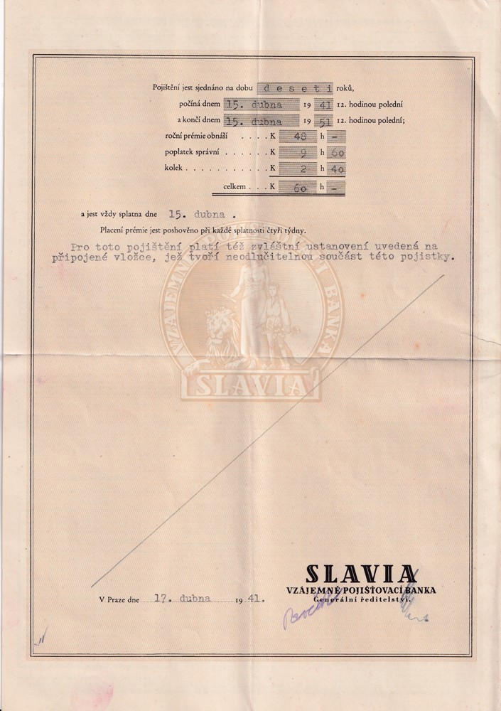 pojistku uzavřenou v pojišťovací bance Slavia za první republiky, úrazové pojištění, včetně několika stvrzenek
