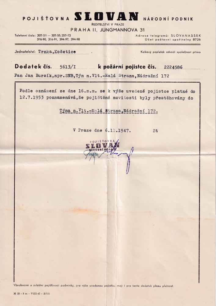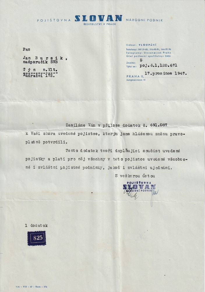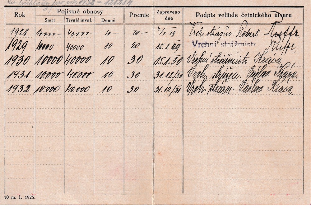 Raritní kartičkou která potvrzuje, že pan strážmistr Jan Bursík, pojištěn proti následkům tělesných úrazů na základě smlouvy ze dne 19.listopadu 1924 sjednané s ministerstvem vnitra R.Č.S. v Praze dne 21.května 1928 v Bance Slavia v Praze, určenou pro povolání vykonávající službu státu. V kartičce jsou záznamy o pojistných obnosech prémie ap. od roku 1928-1932 včetně podpisu velitele četnického útvaru.