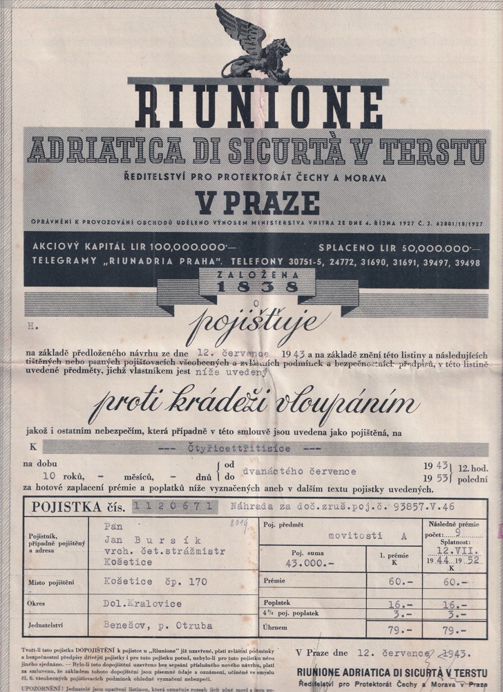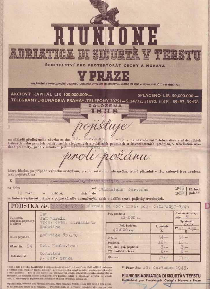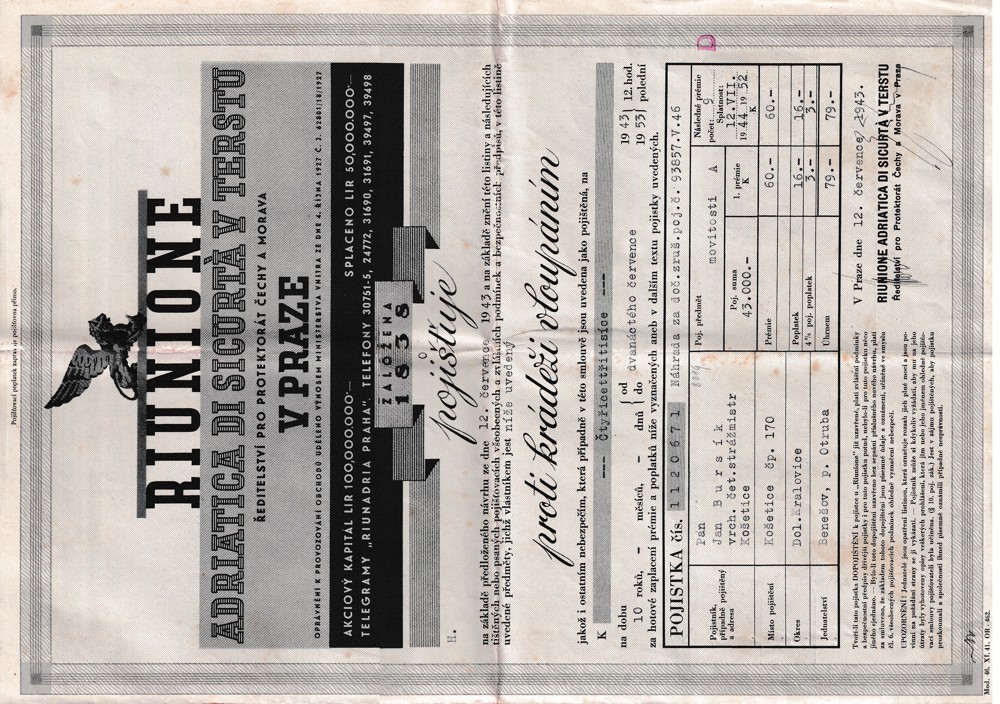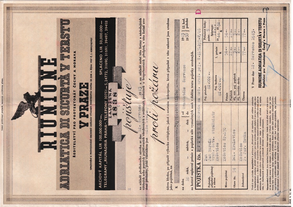 2x pojišťovací smlouva z Protektorátu Čechy a Morava uzavřená u pojišťovacího domu Riunione Adriatica di sicurta v Terstu více o tomto domu například zde:
