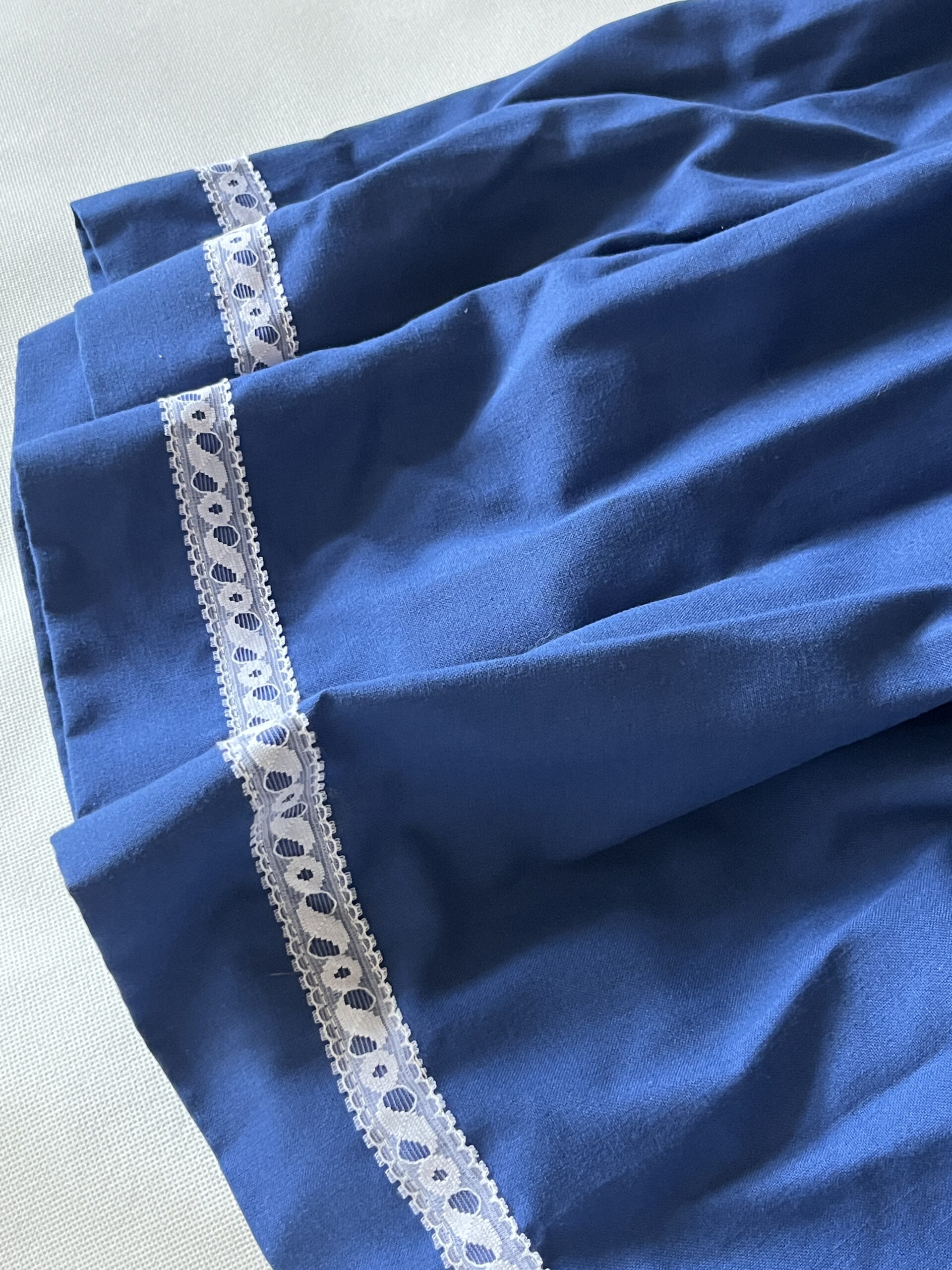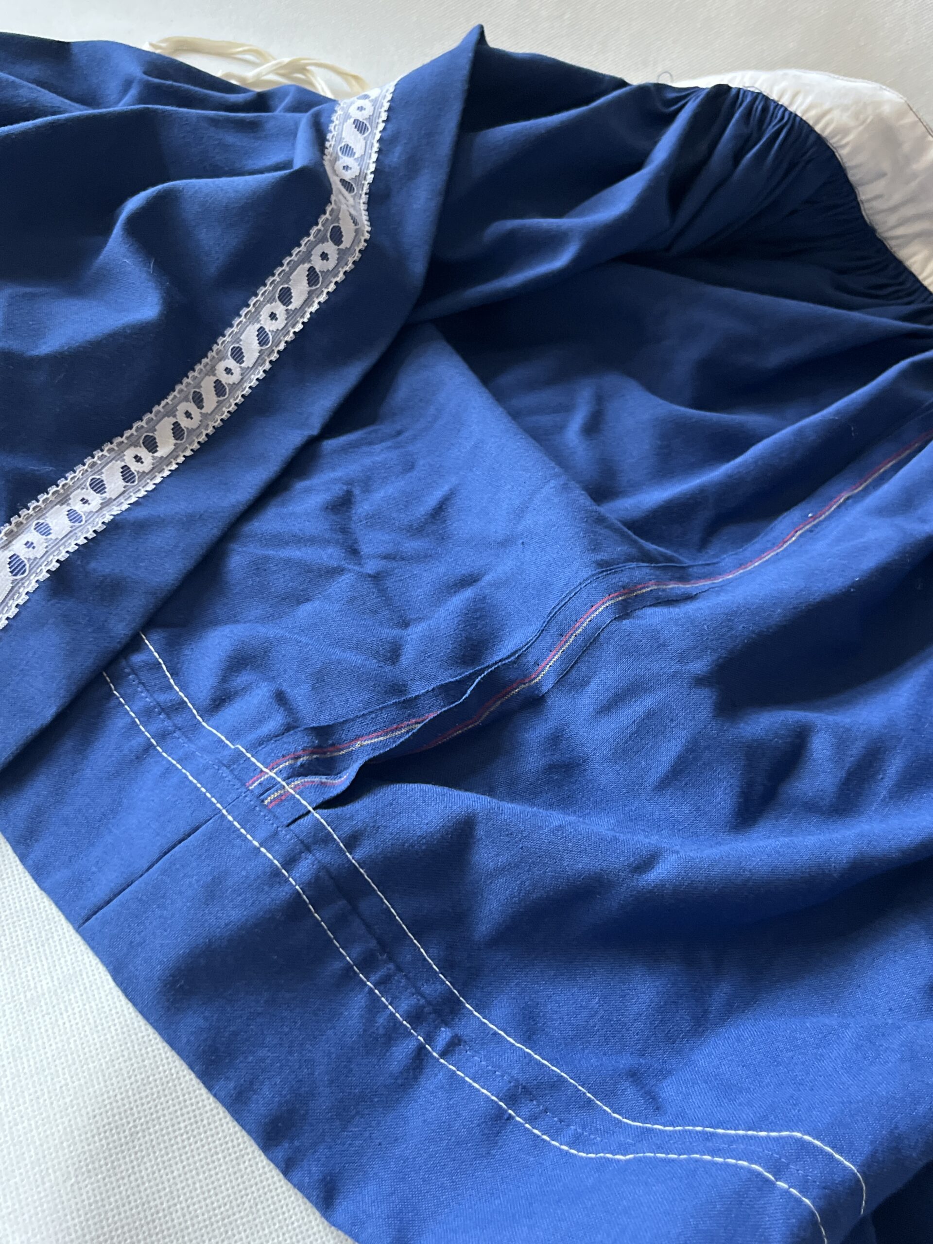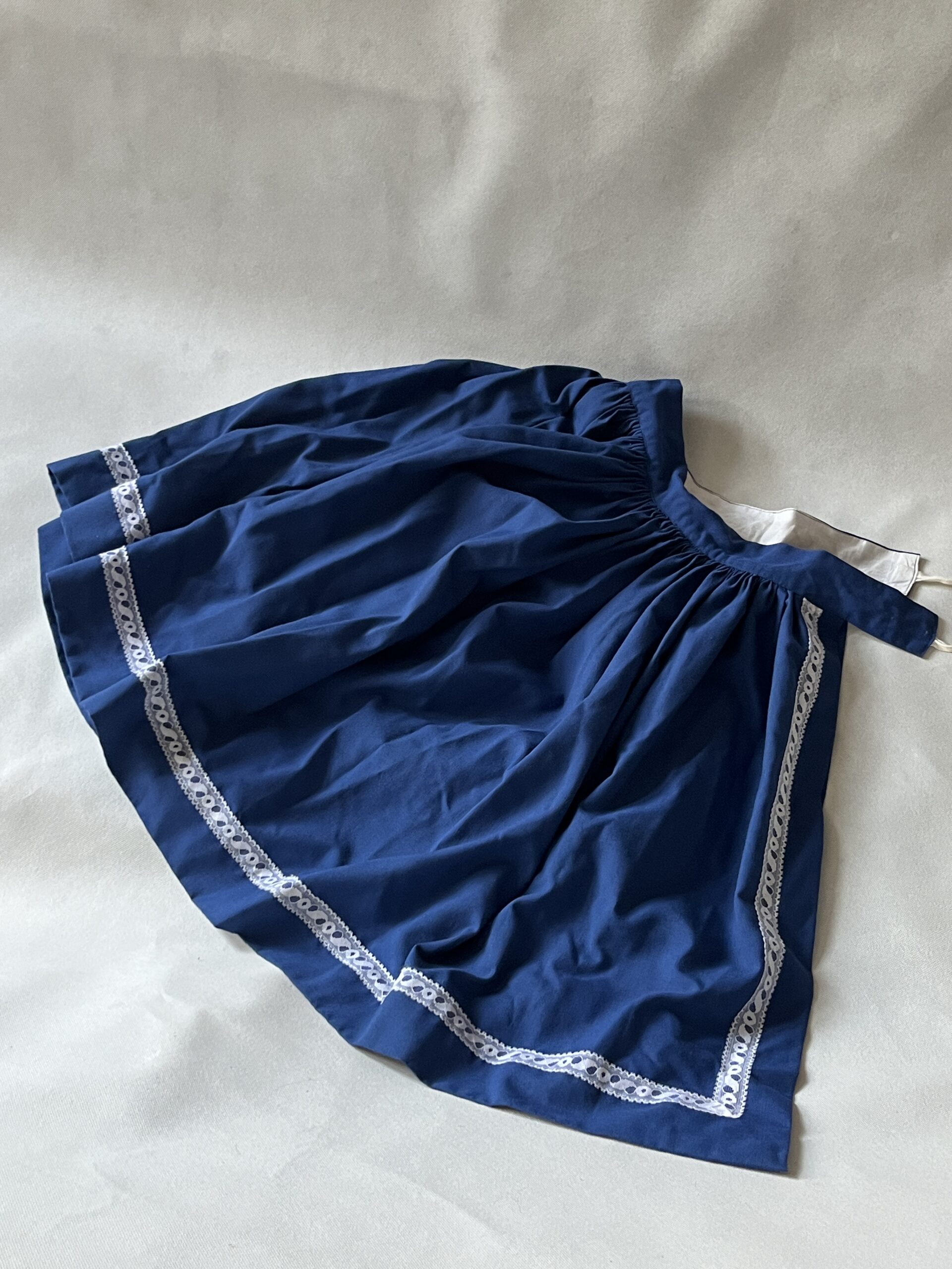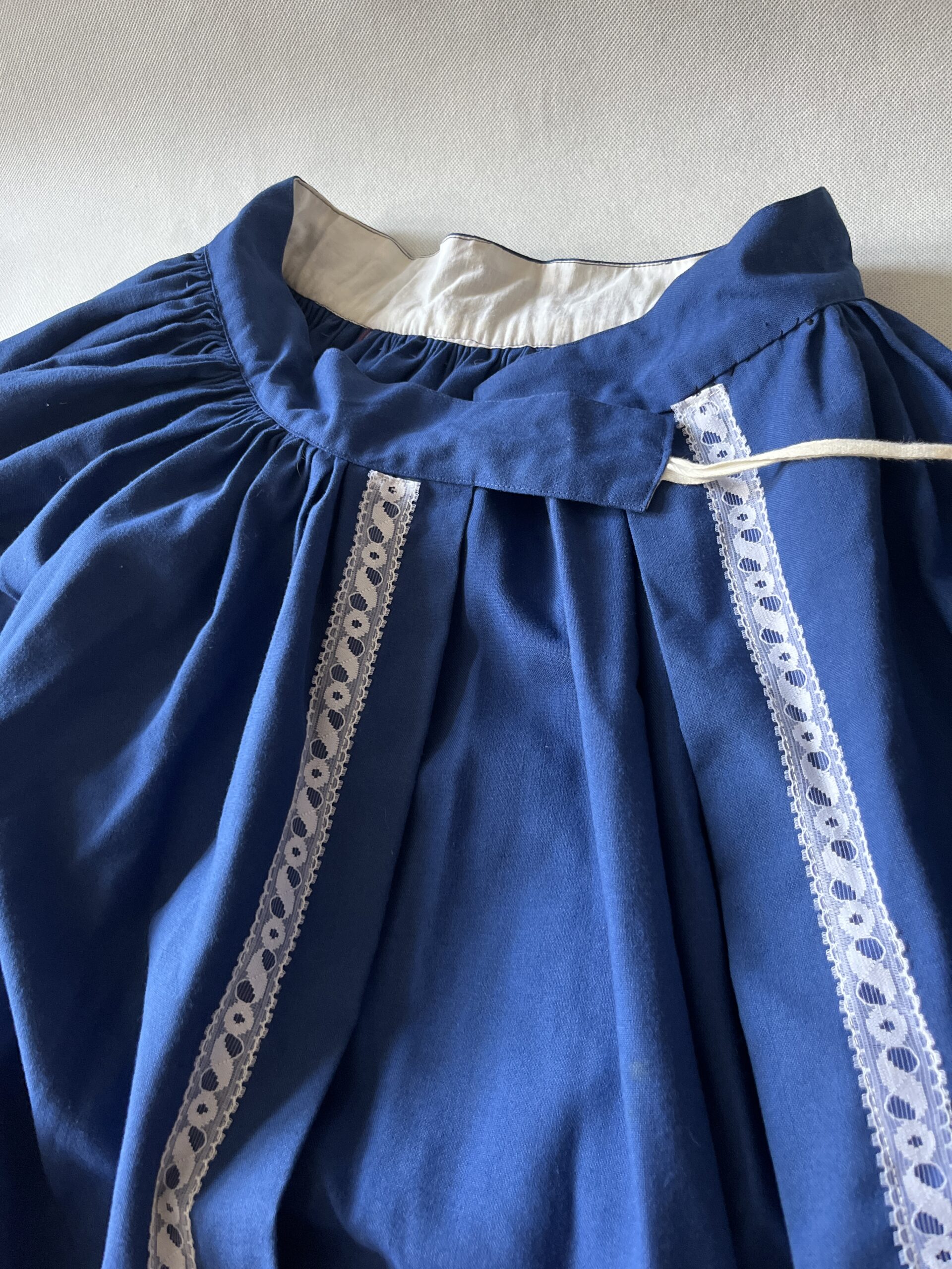 AS-1 Součást lidového oděvu. Sukně modrá s krajkou. Délka 64 cm. Obvod pasu 78 cm. Celková šíře dolní části 268 cm. Materiál bavlna.
