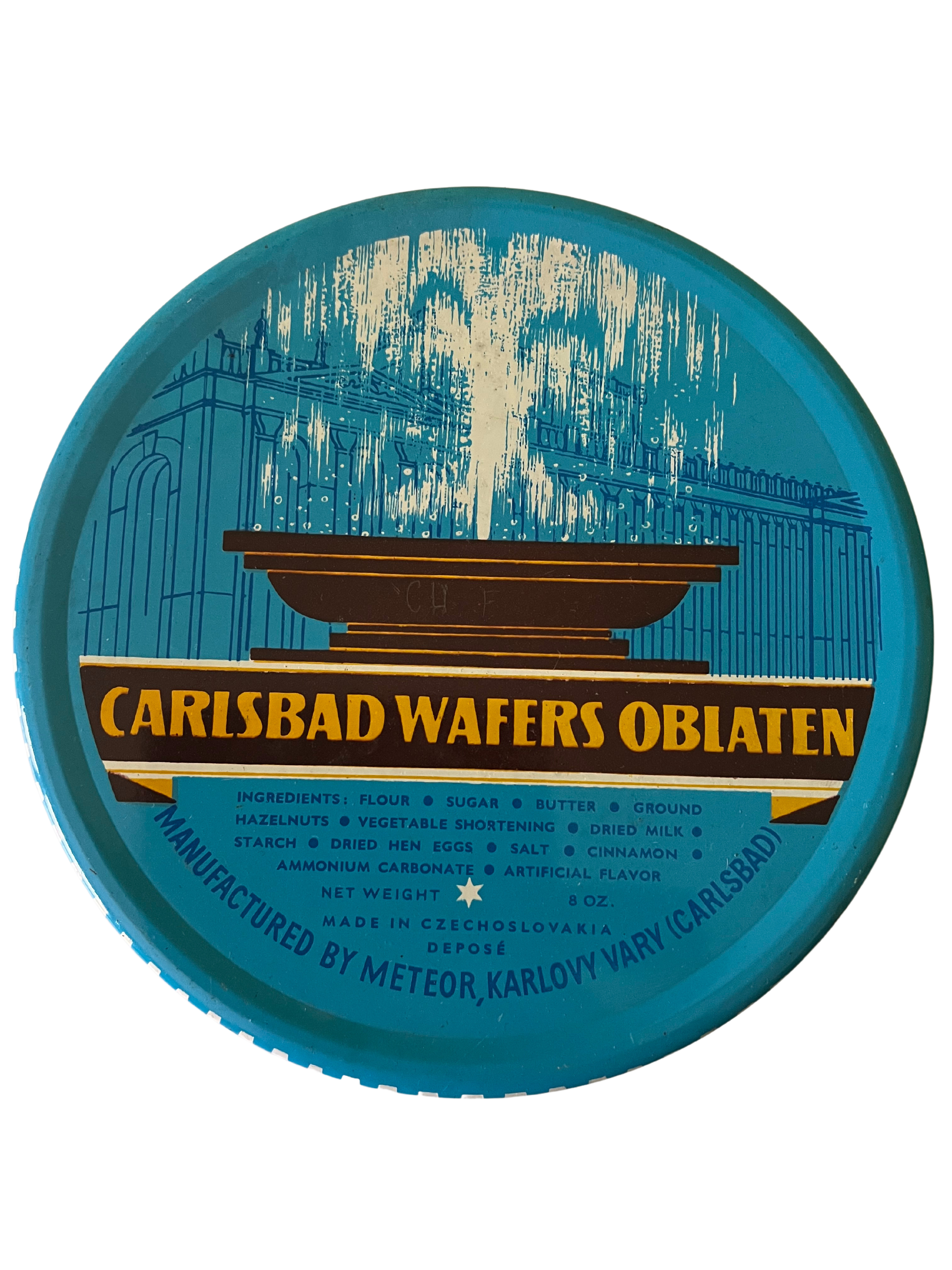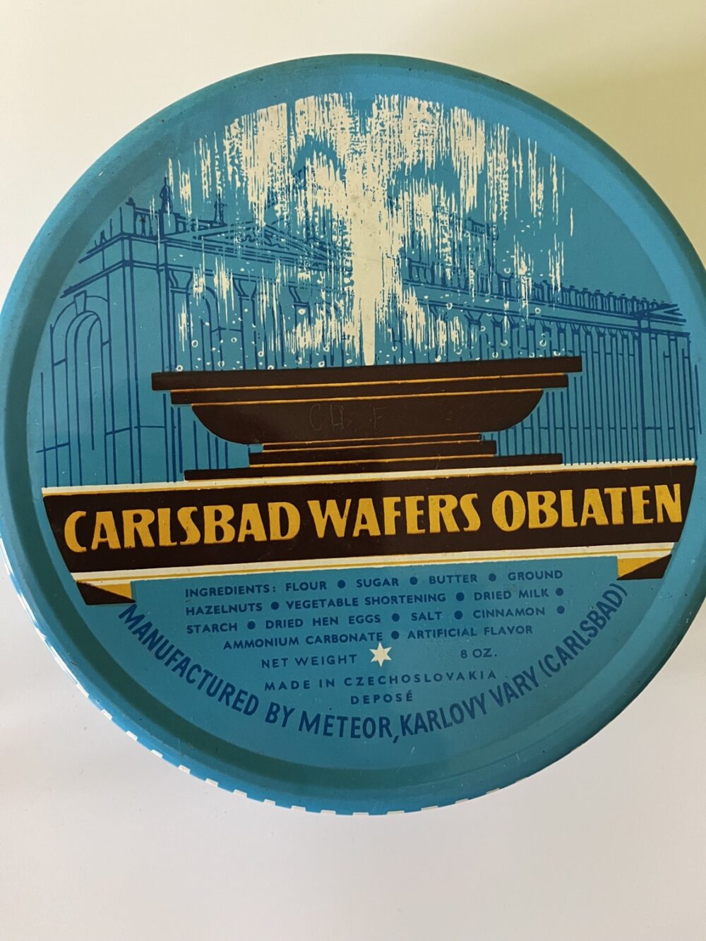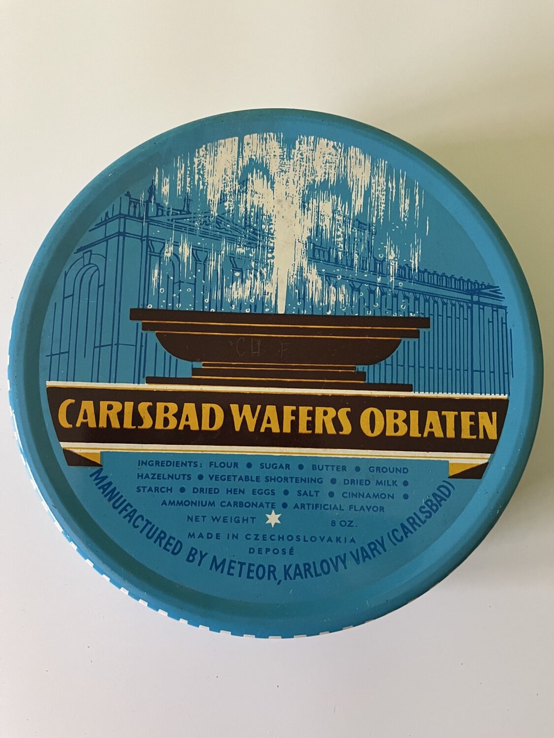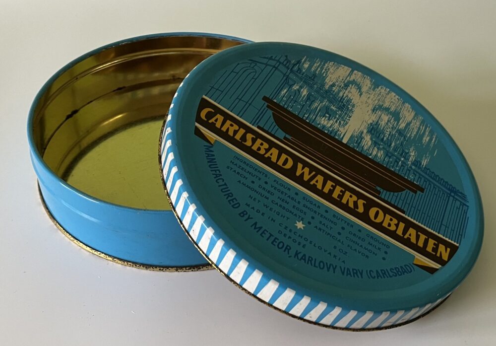 Stará plechová krabice od lázeškých oplatků, Kralovy Vary