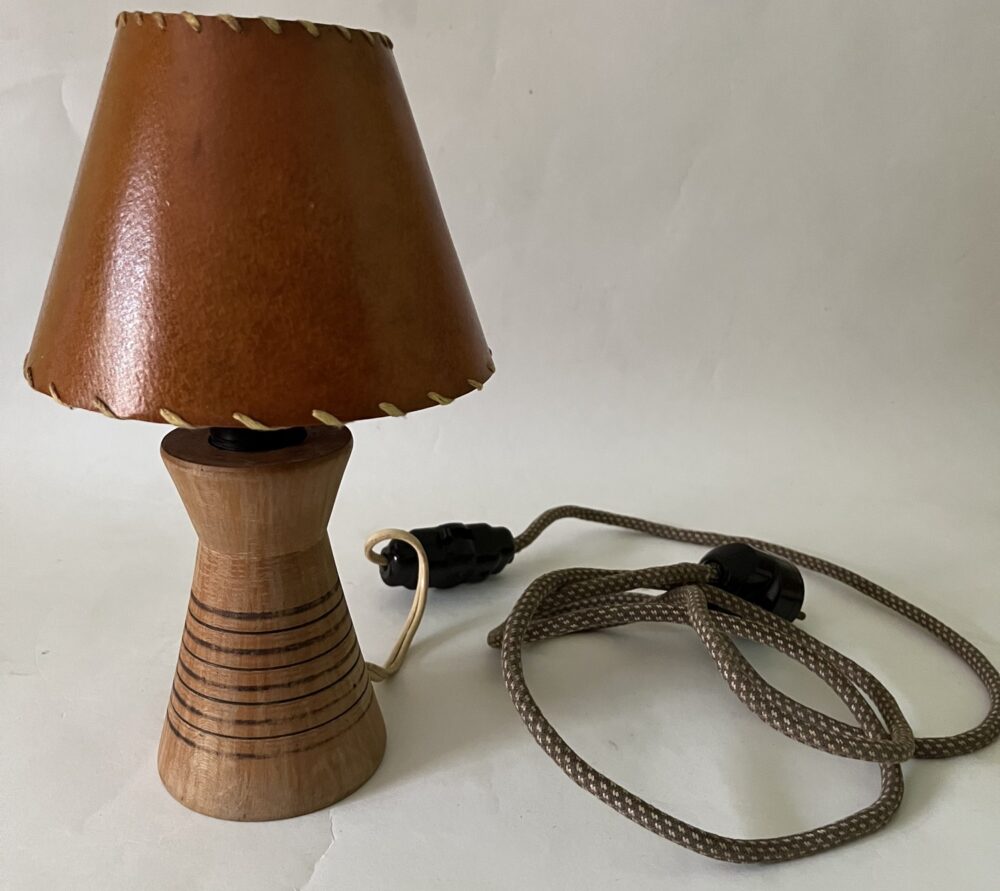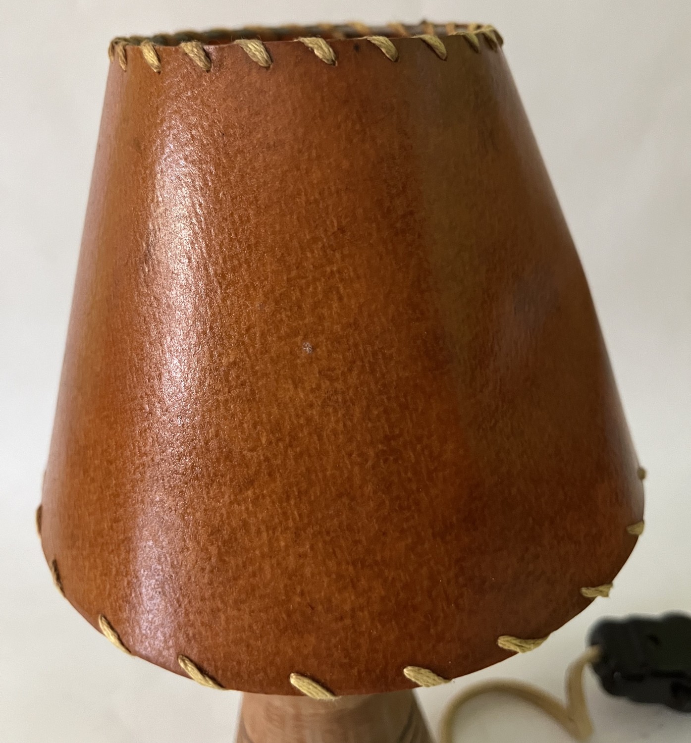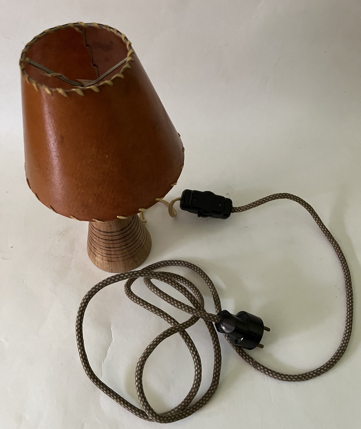 43 (t1) Rozměr: Výška 25 cm, průměr stínidla dolní část 14 cm, horní část 8 cm. Lampička je funkční, má původní šňůru a bakelitový vypínač.