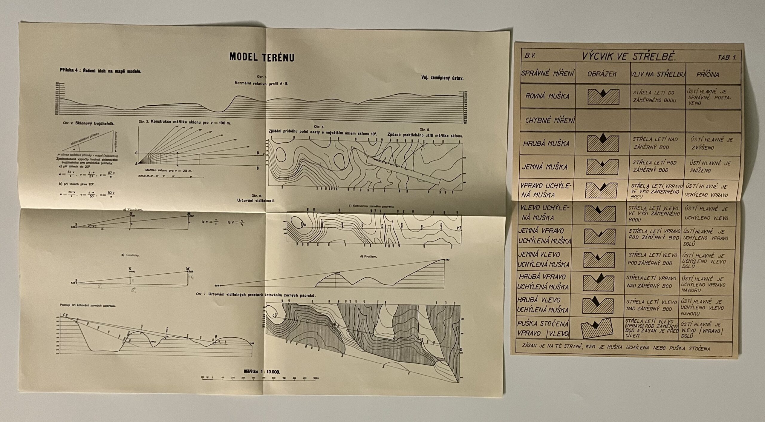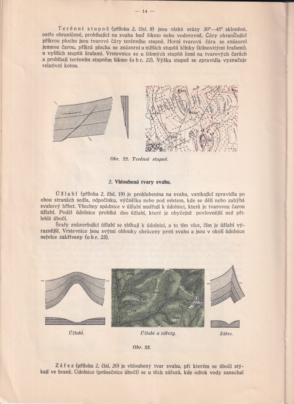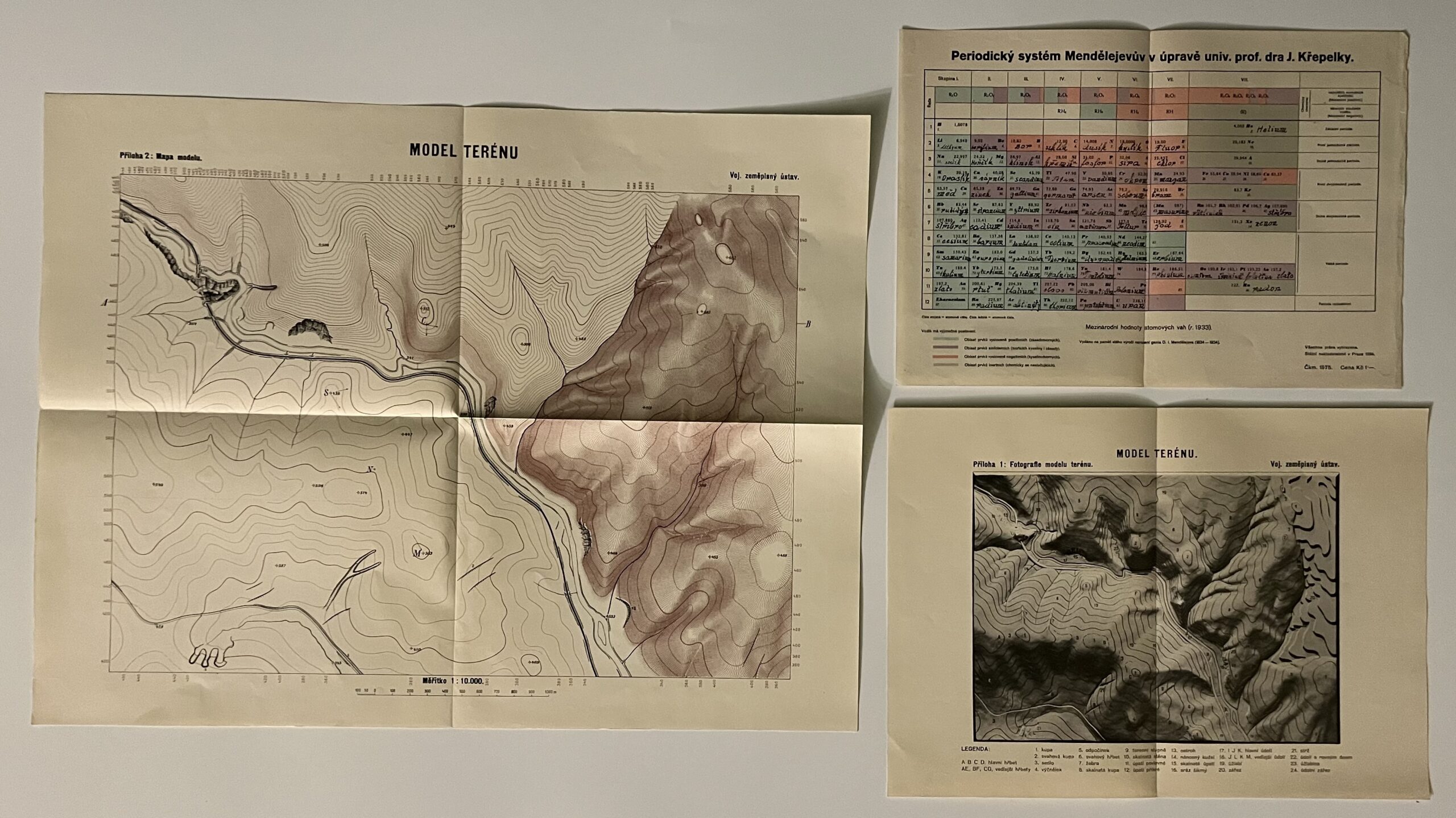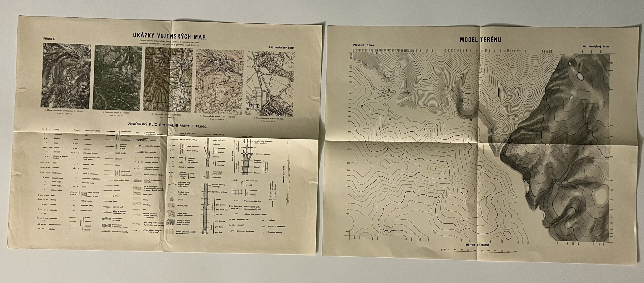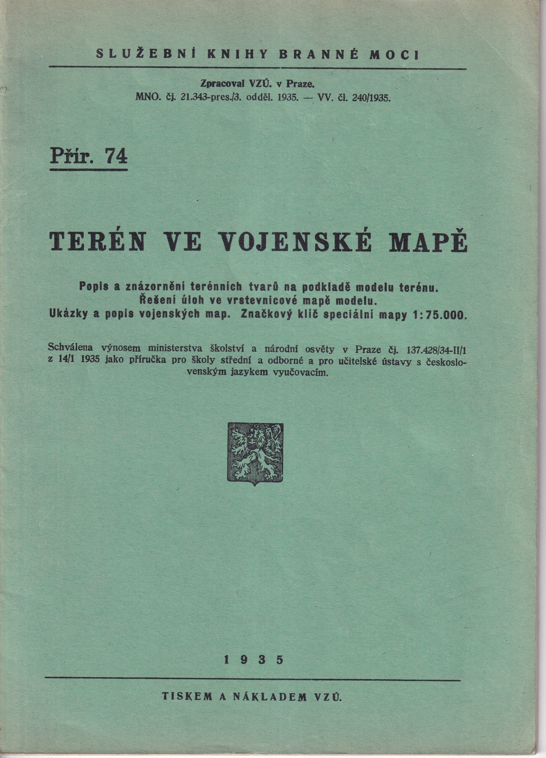 14 (K3-2) Rozměr 21 x 29,5 cm. Popis a znázornění terénních tvarů na podkladě modelu terénu. Řešení úloh ve vrstevnicové mapě modelu. Ukázky a popis vojenských map. Značkový klíč speciální mapy 1:75.000. Tiskem a nákladem VZÚ r.1935. Počet stran 26. Kniha obsahuje 36 obrázků. 1 list výcvik ve střelbě 22 x 30 cm. 1 list Periodický systém Mendělejevův v úpravě univ.prof.dra J. Křepelky, 29,5 x 20,5 cm. 1 x Ukázky vojenských map, Voj.zeměpisný ústav 47 x 36 cm. 3 x Model terénu 1 : 10.000. Voj.zeměpisný ústav 47 x 36 cm. Model terénu, Voj.zeměpisný ústav 22,5 x 31 cm.