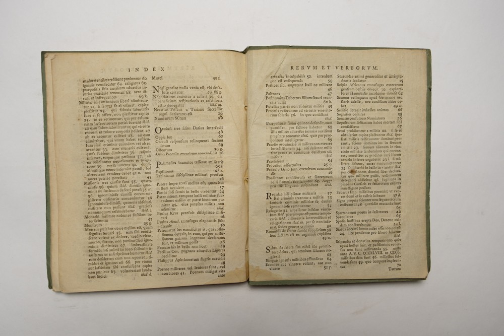 43 (ggm) s vojenskou tématikou, Vojenské zákony a rytinovými obrázky, Lisiae r.1752 Arrii Menandri … fragmenta legum de re militari, cum comm. C … Rozměr 17 x 20 cm, 74 stran + 10 stran seznam