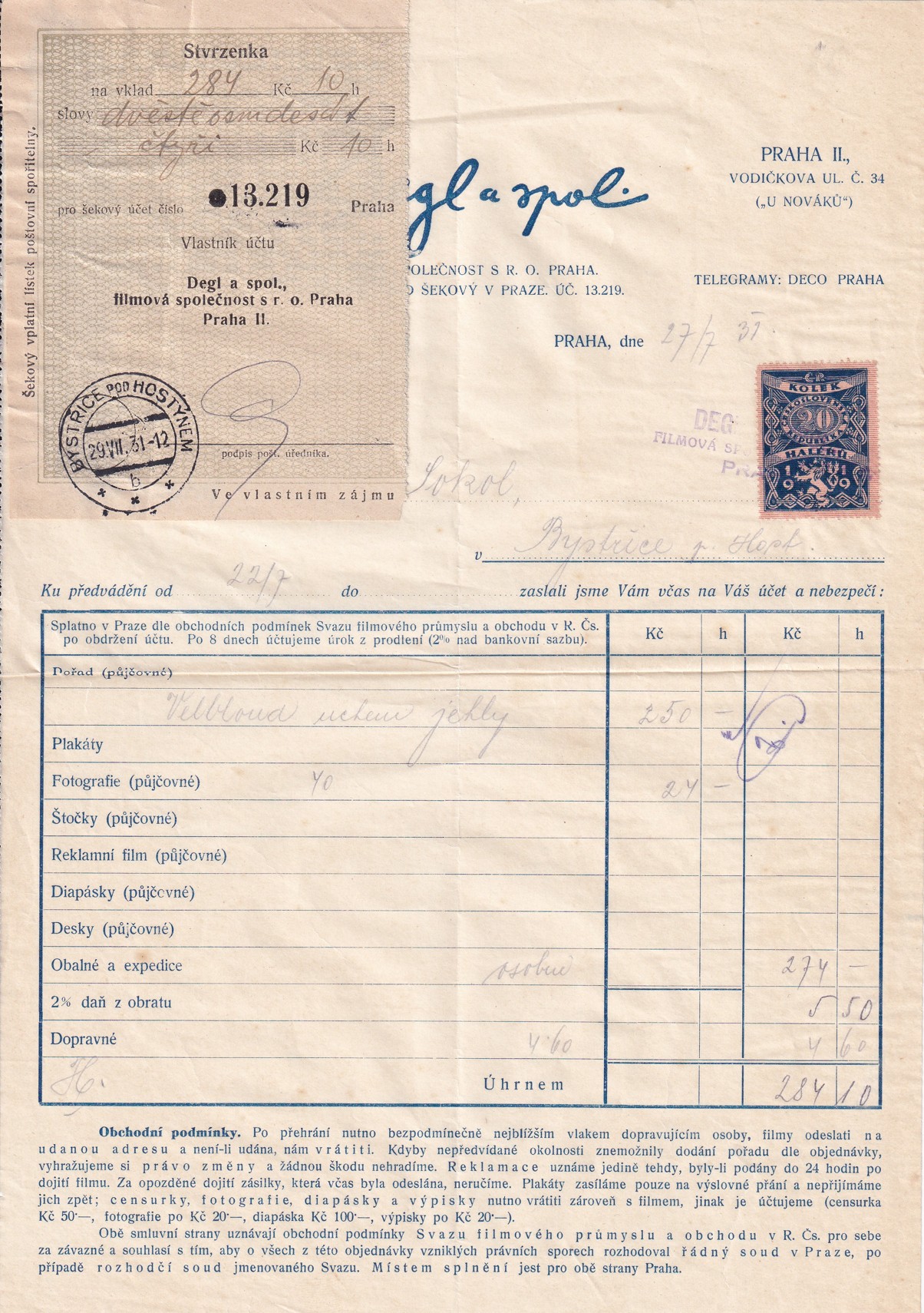 (IU-15) Rozměr: 21×30,5 cm; Vystavený pro Bio Sokol, Bystřice pod Hostýnem; dne 27. července 1931; se stvrzenkou a razítkem firmy; .jpg)