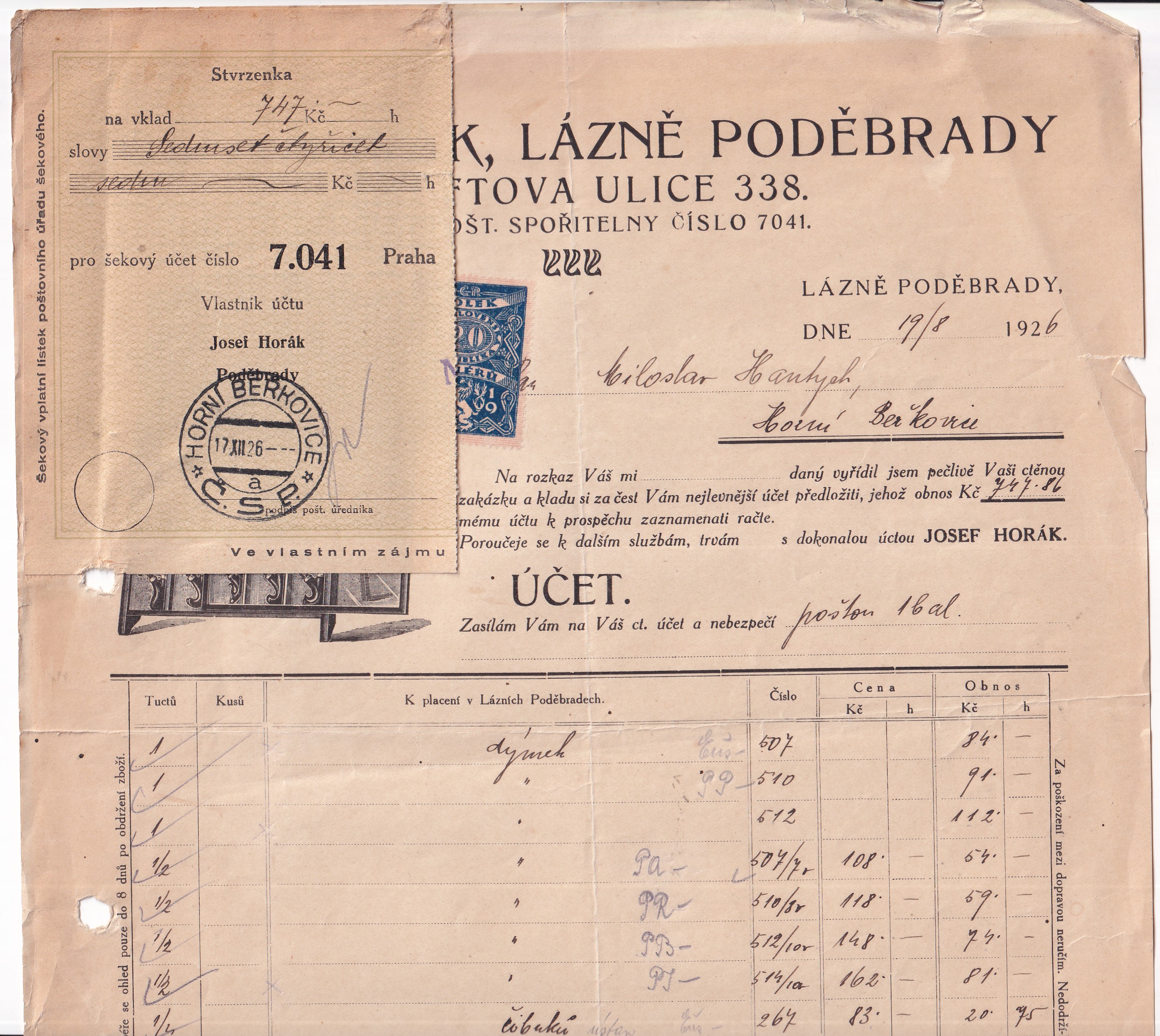 HomeObchodÚčtyÚčet, dýmky, Nymburk, 1926