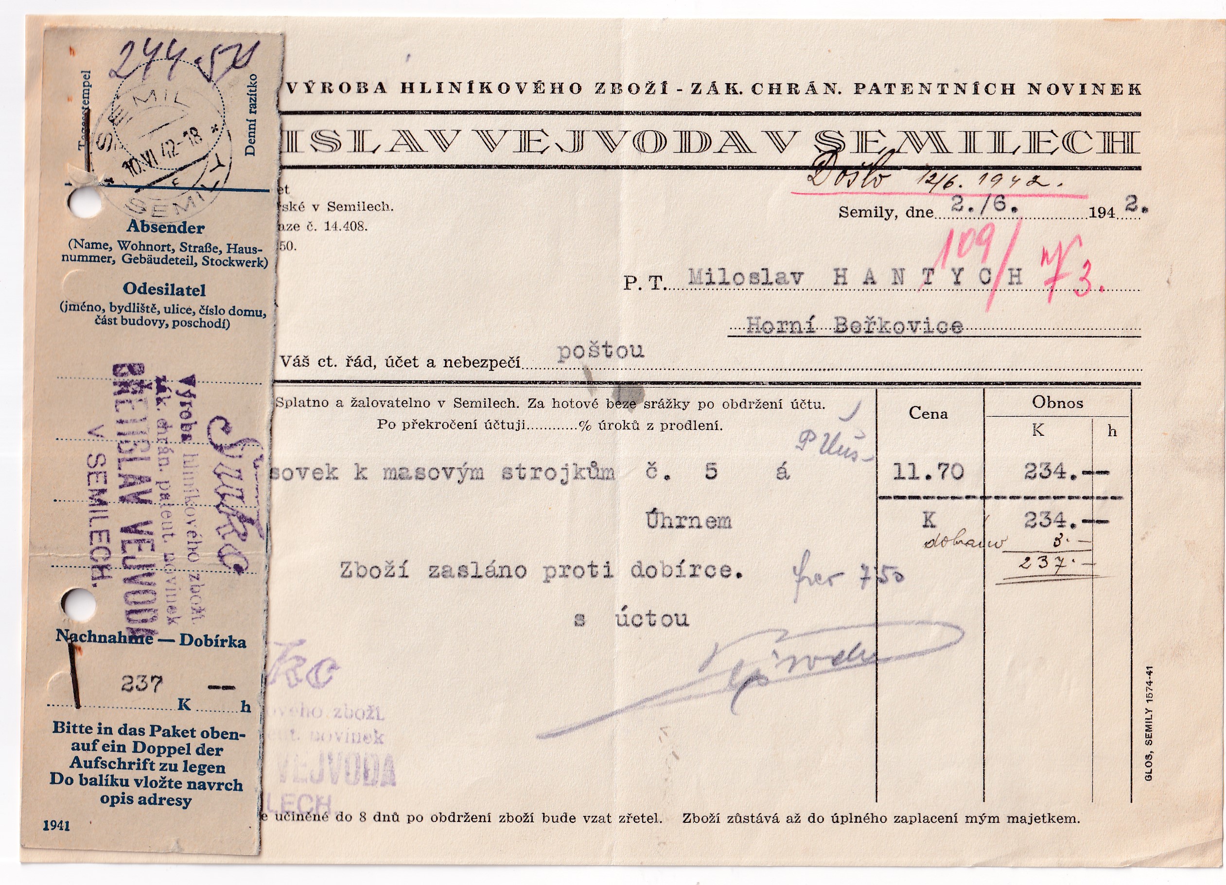 HomeObchodÚčtyÚčet, hliníkové zboží, Semily, 1942