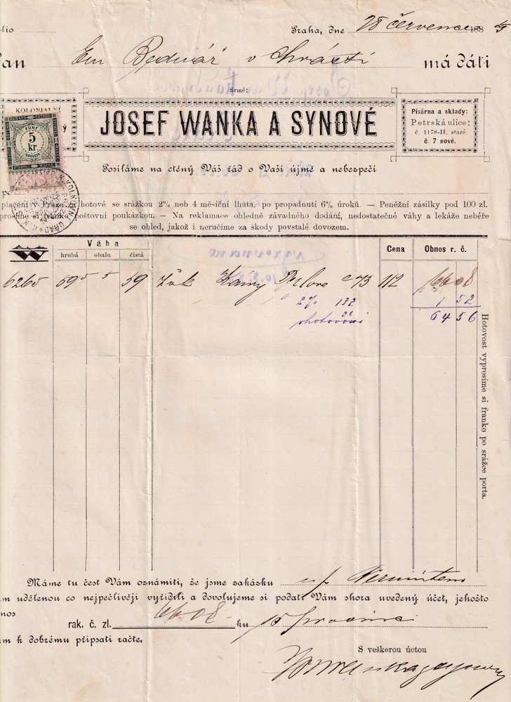 HomeObchodÚčtyÚčet, Josef Wanka a synové, Praha, 1885