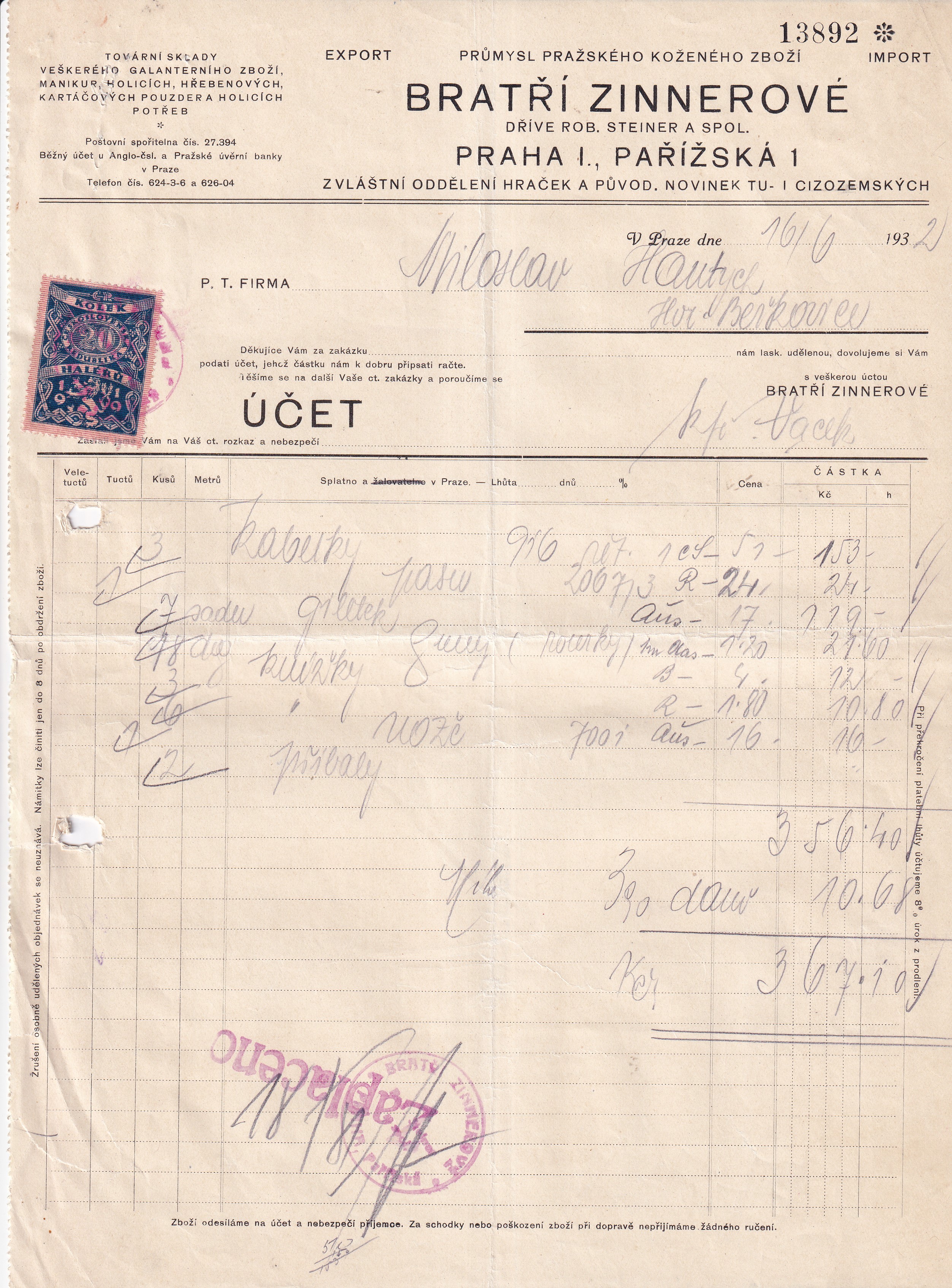 HomeObchodÚčtyÚčet, Kožené zboží, Praha, 1932
