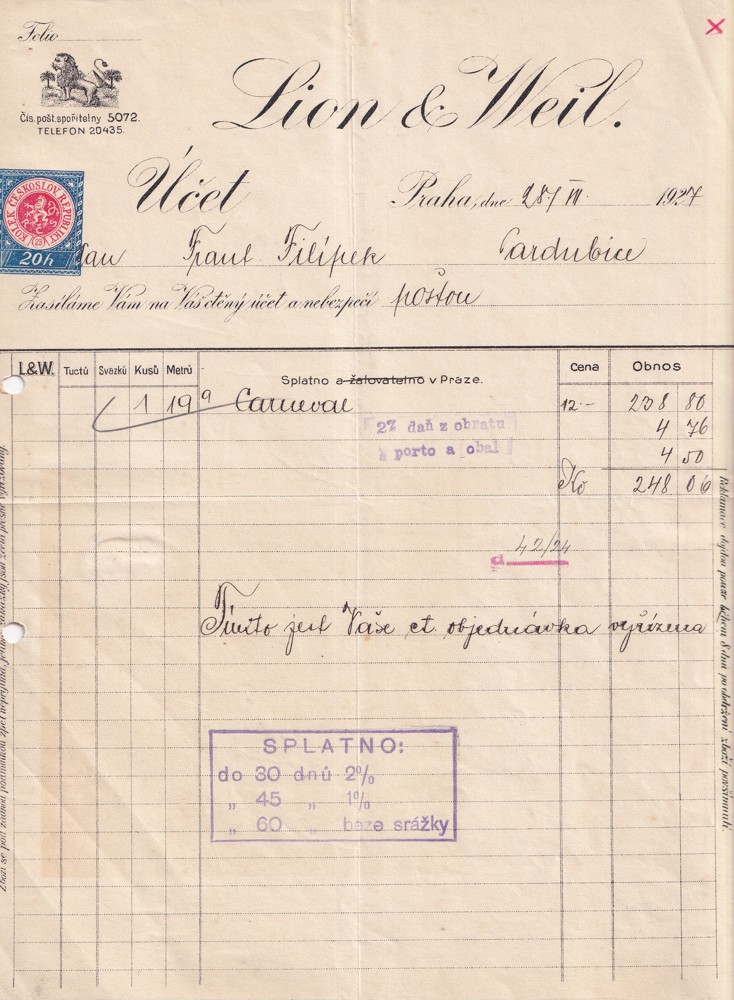 HomeObchodÚčtyÚčet, Lion and Weil, Praha, 1927