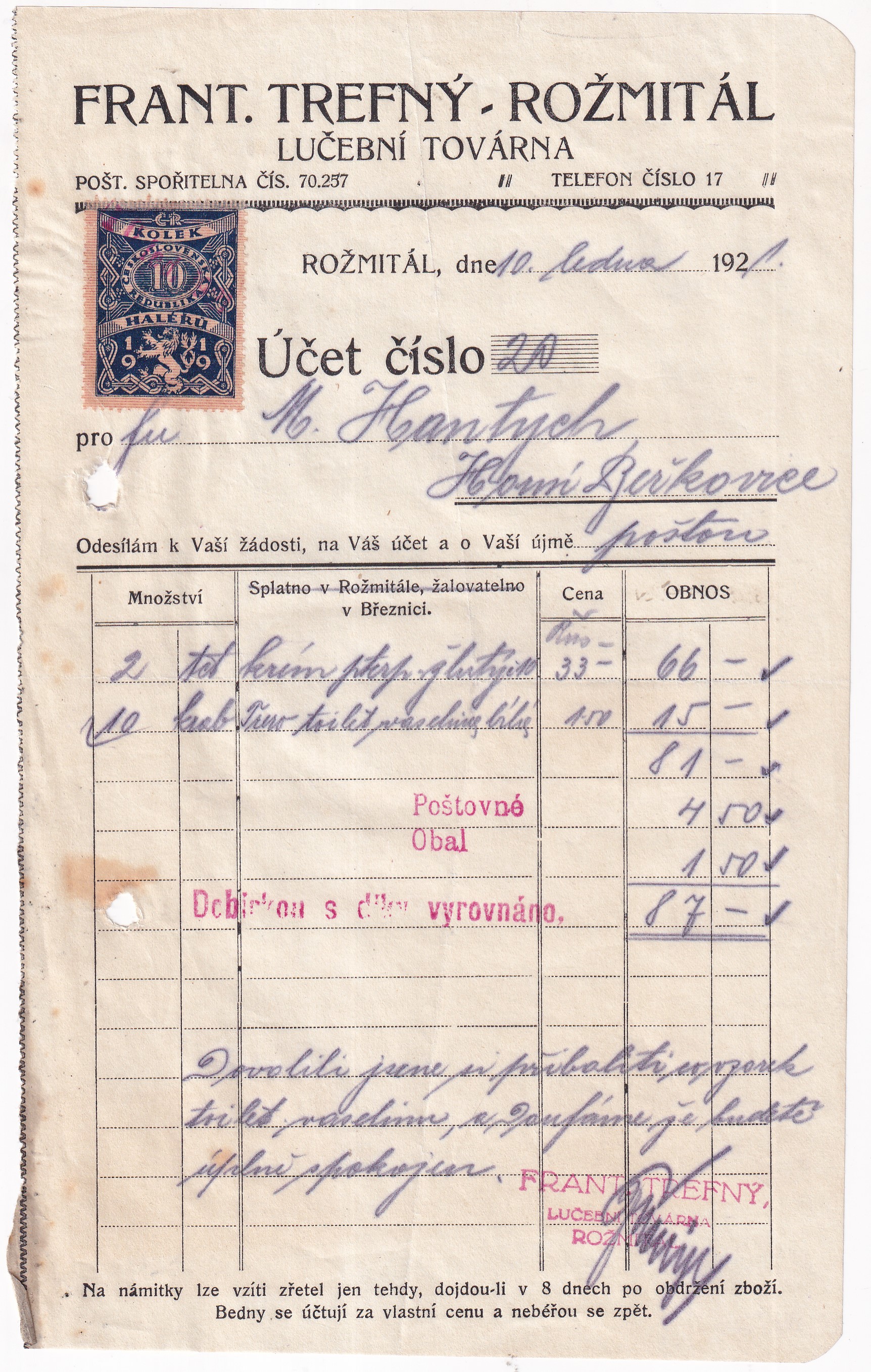 HomeObchodÚčtyÚčet, lučební továrna, Příbram, 1921