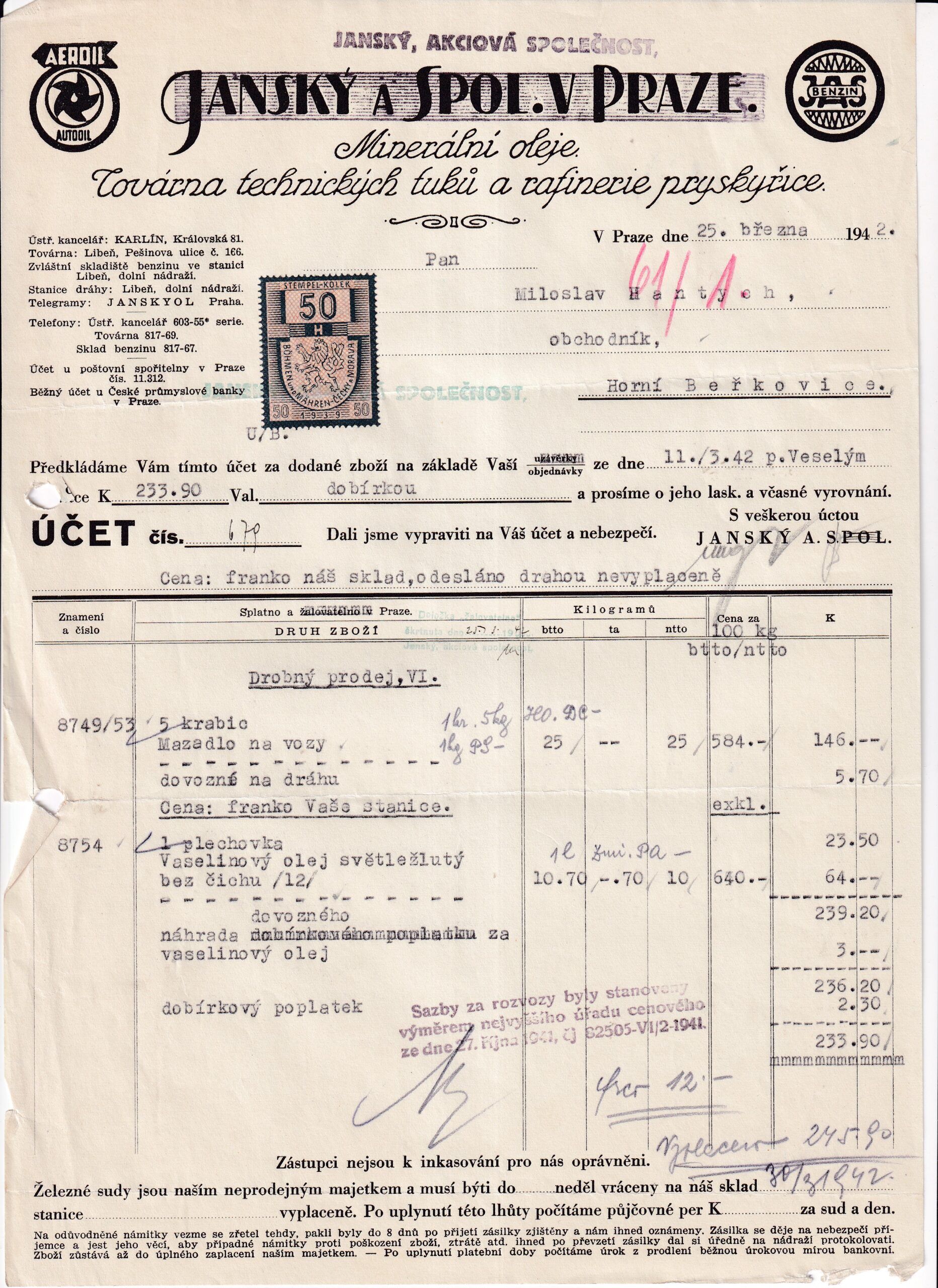 HomeObchodÚčtyÚčet, Minerální oleje, Praha, 1942