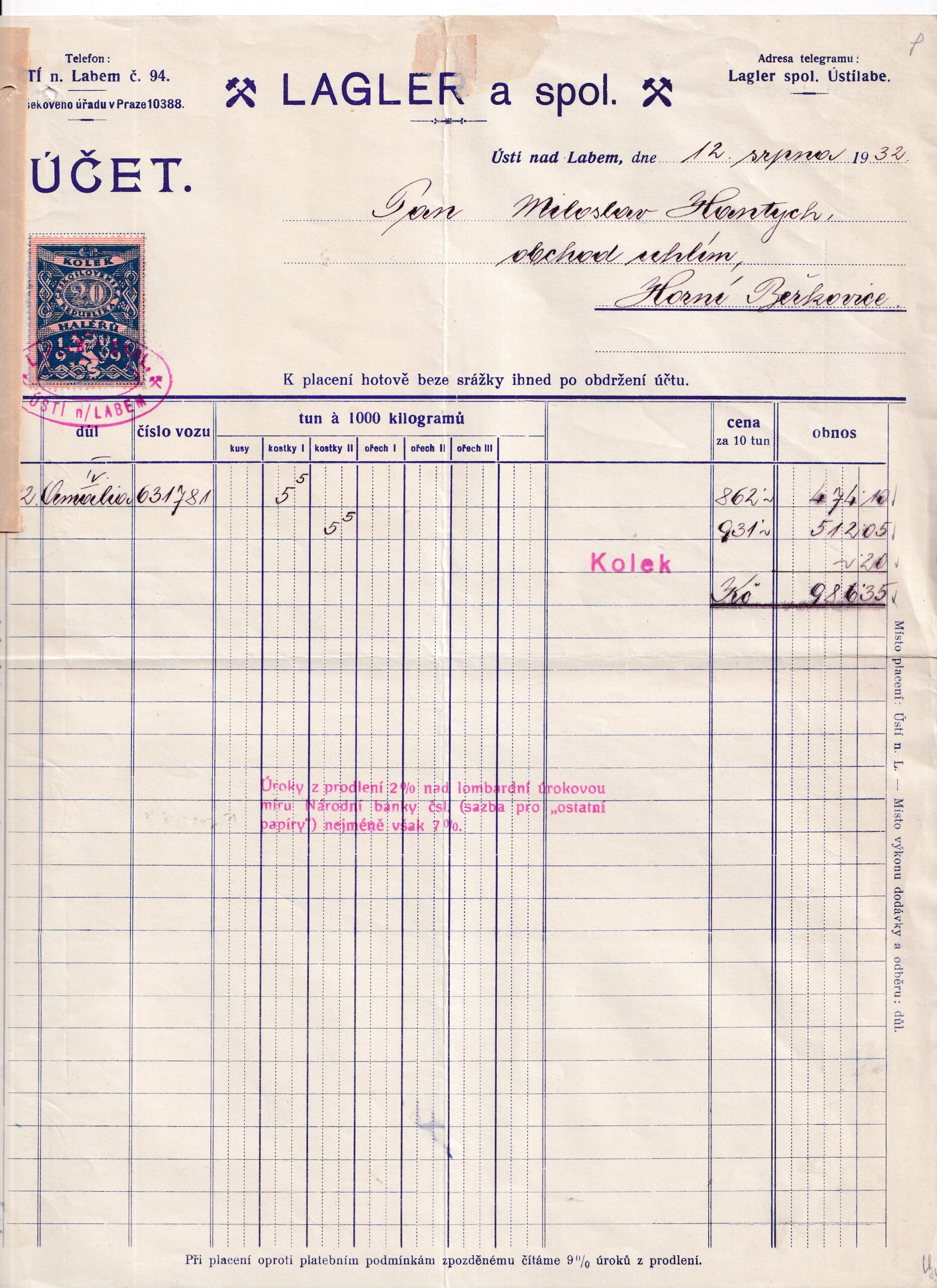HomeObchodÚčtyÚčet, obchod uhlím, Ústí n. L., 1932