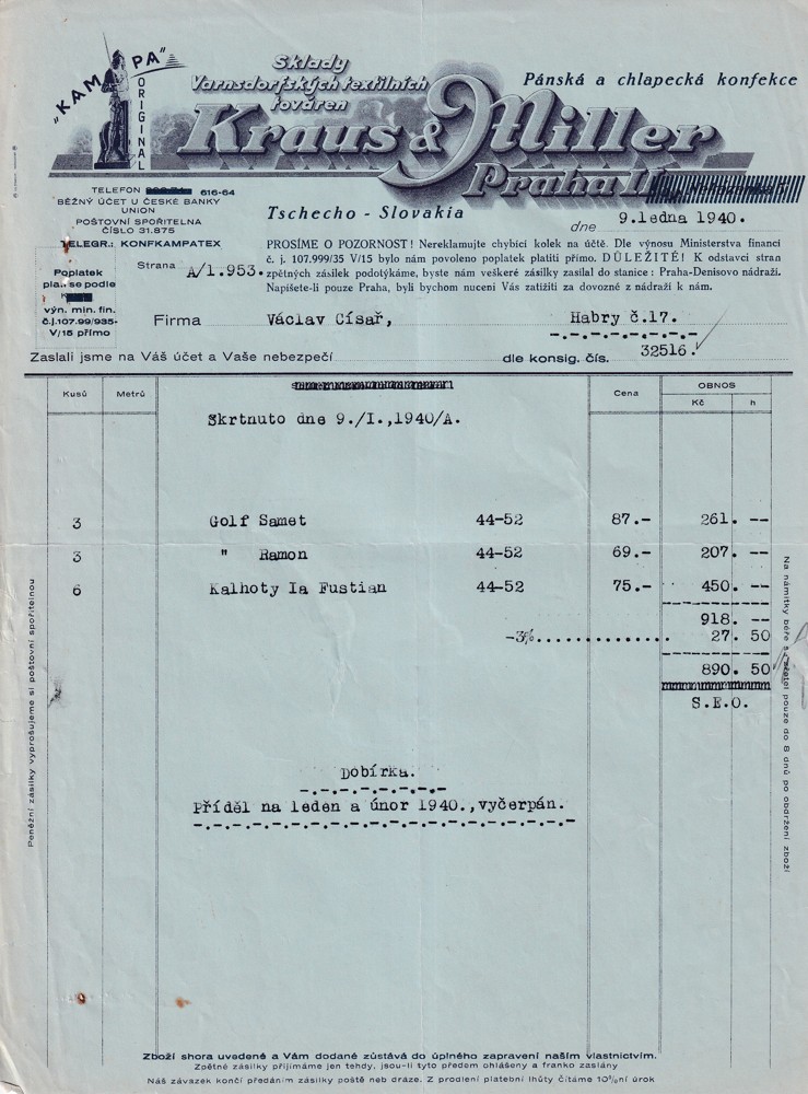 Účet, Pánská a chlapecká konfekce, Praha, 1940