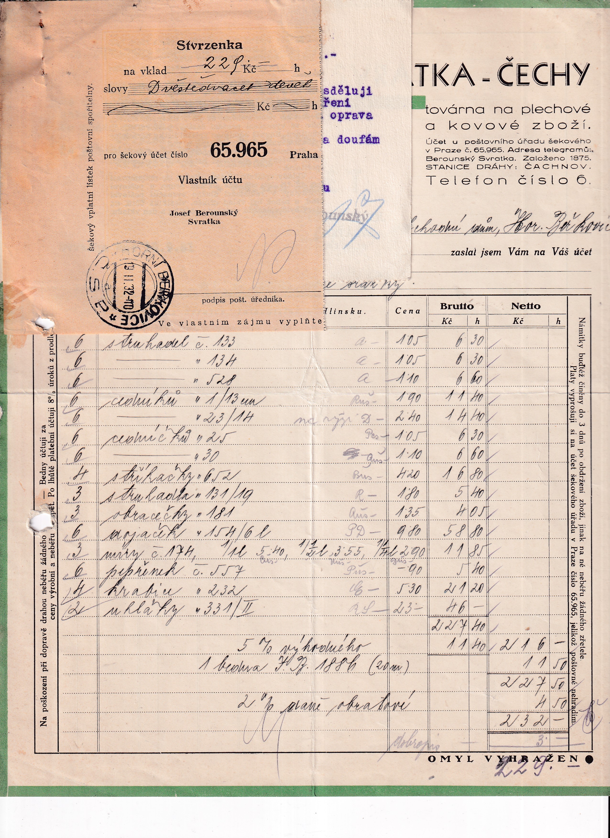 Účet, plechové a kovové zboží, Žďár n. S., 1931