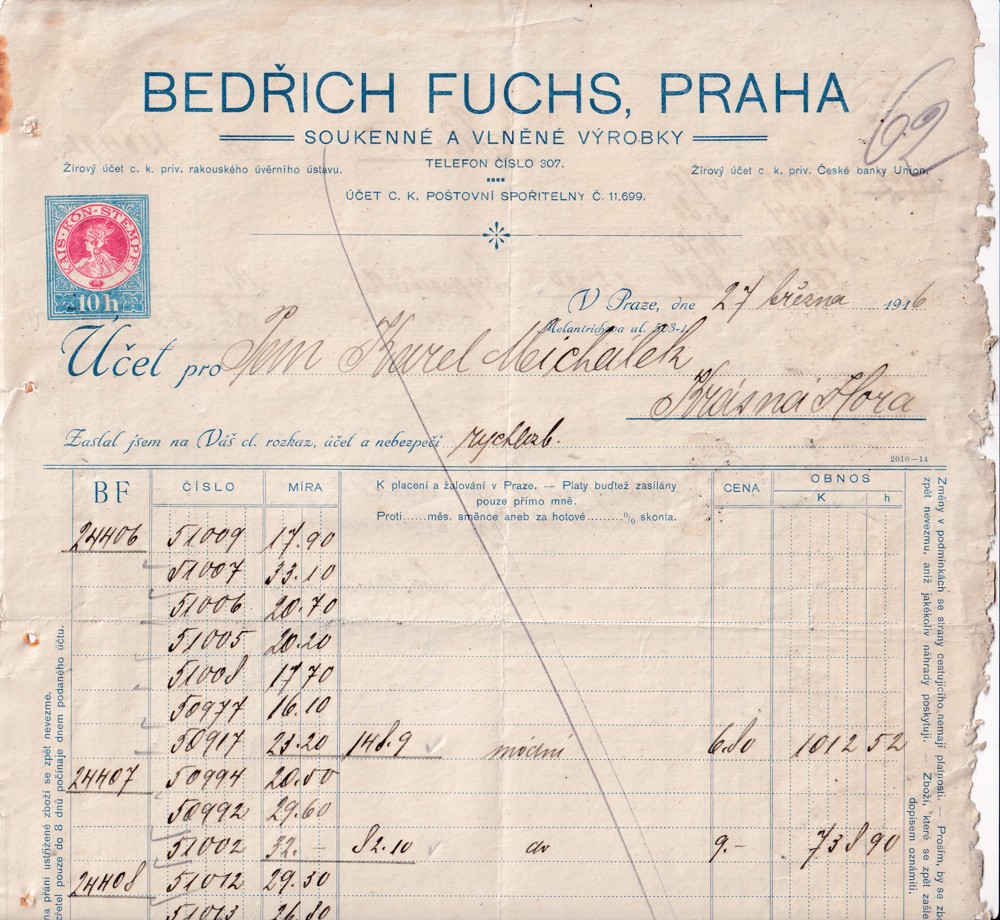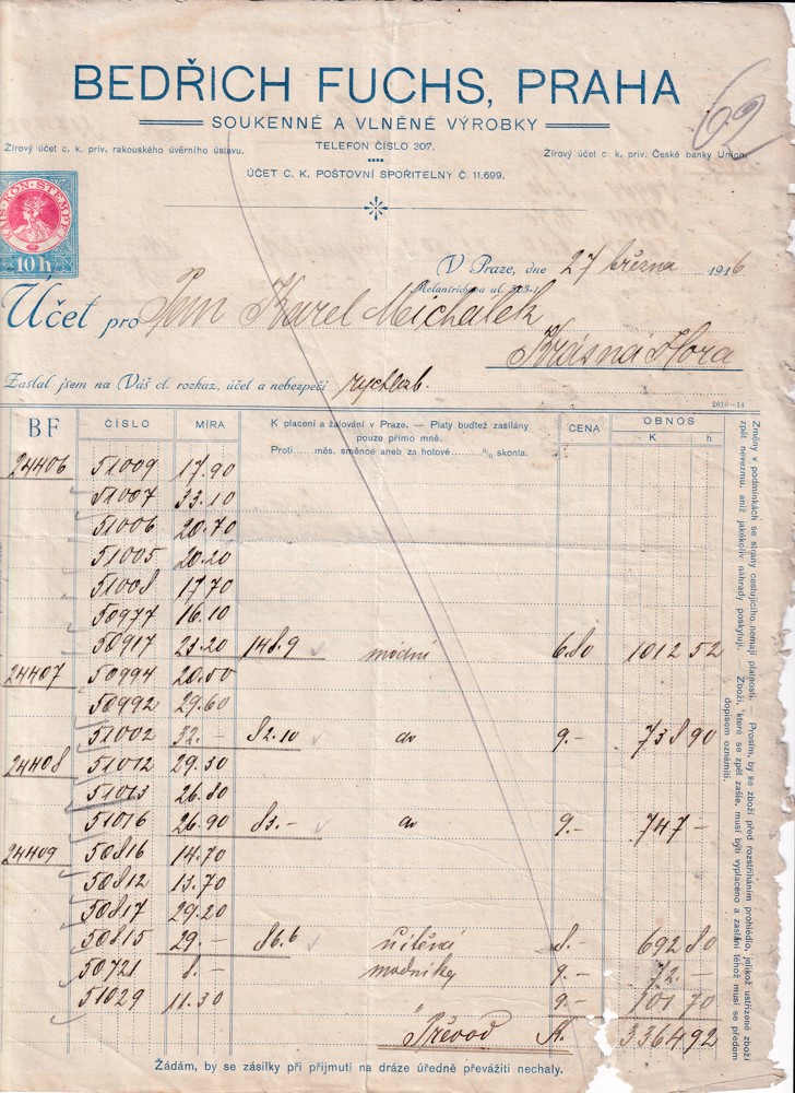 Účet, Soukenné a vlněné výrobky, Praha, 1916
