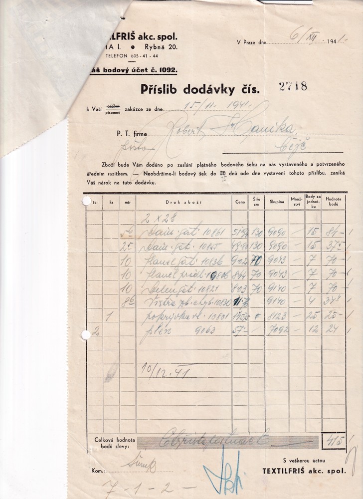 HomeObchodÚčtyÚčet, Textilfriš, a.s., Praha, 1941