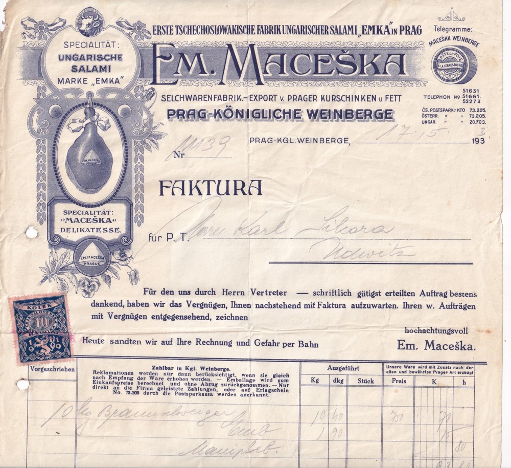 Účet, Továrna na uzeniny, Praha, 1933