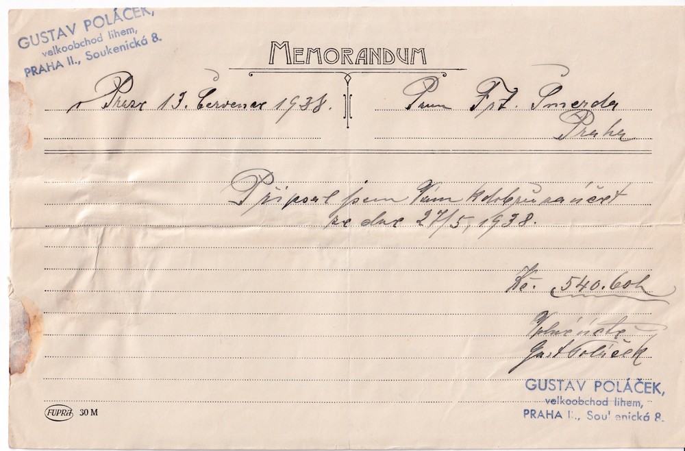 Účet, Velkoobchod lihem, Praha, 1938