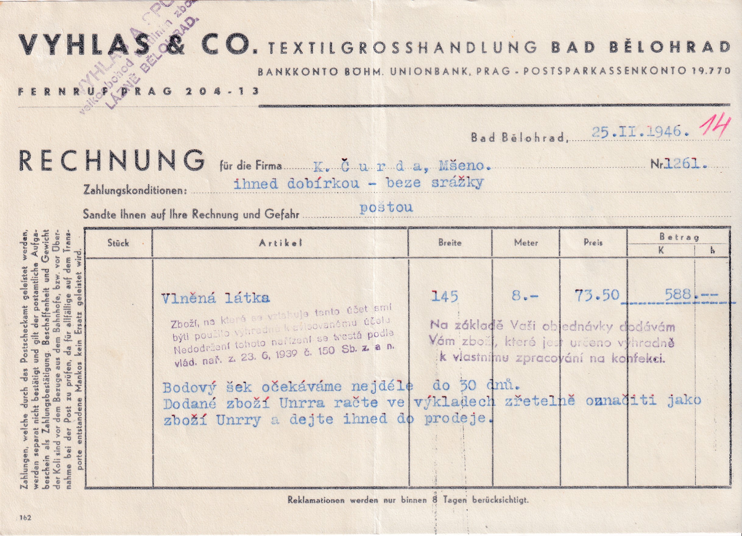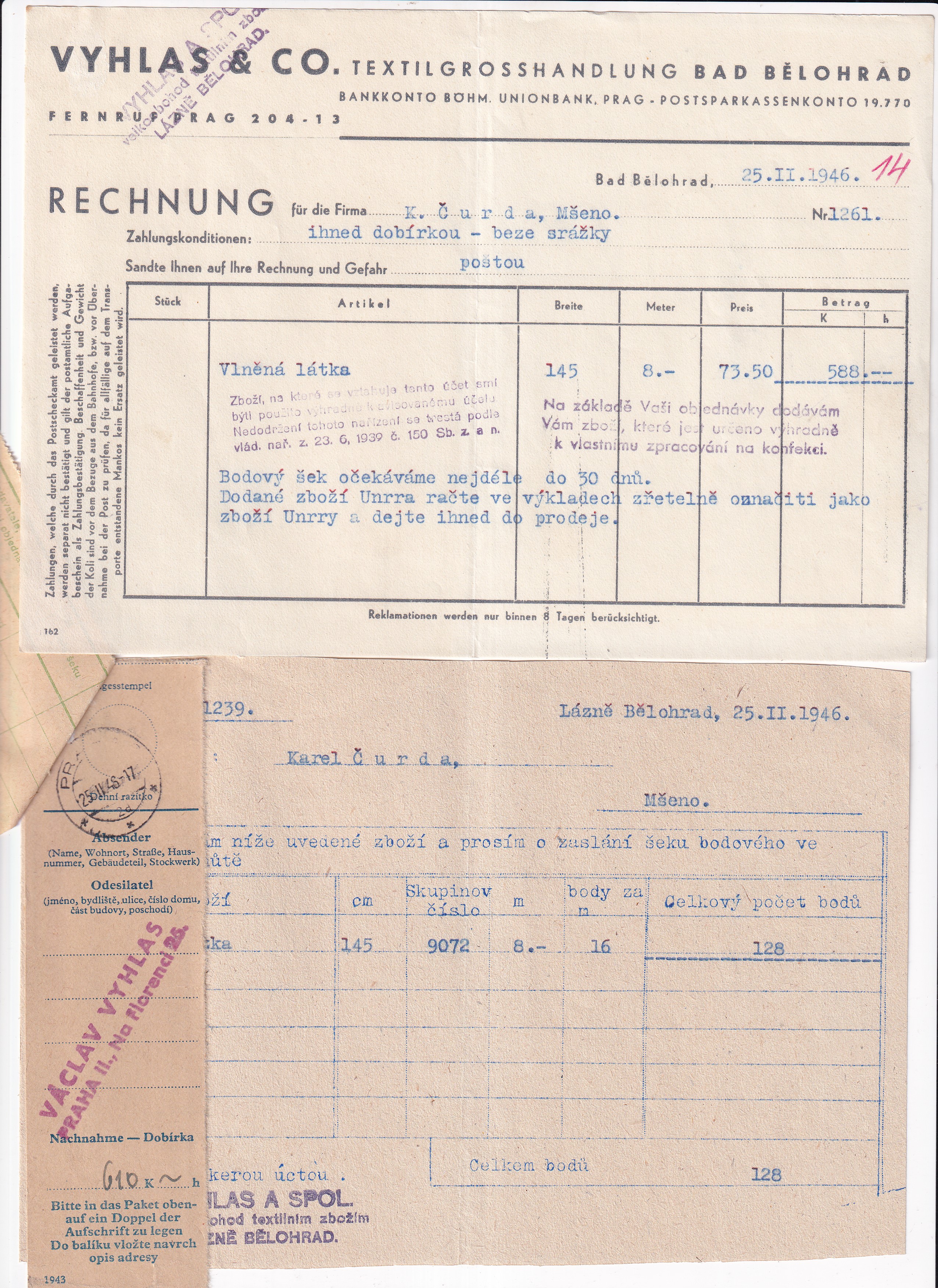 Účet, Velkoobchod textil, Lázně Bělohrad, 1946