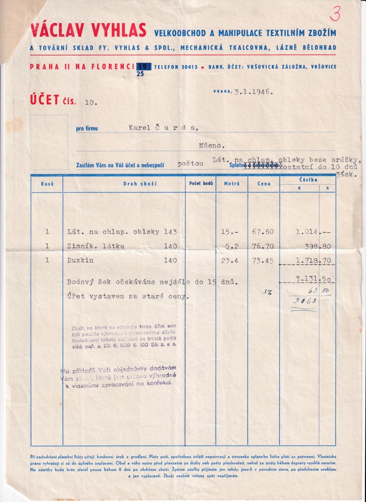 Účet, Velkoobchod textilním zbožím, Praha, 1946