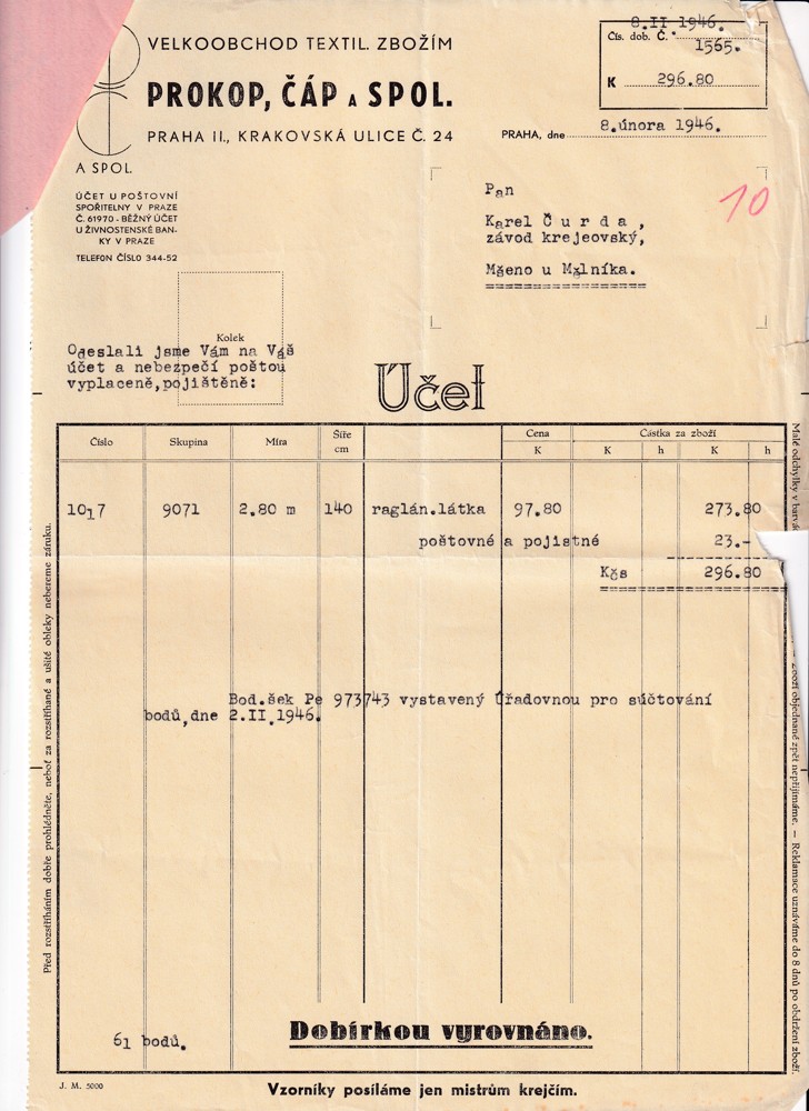 Účet, Velkoobchod textliním zbožím, Praha, 1946