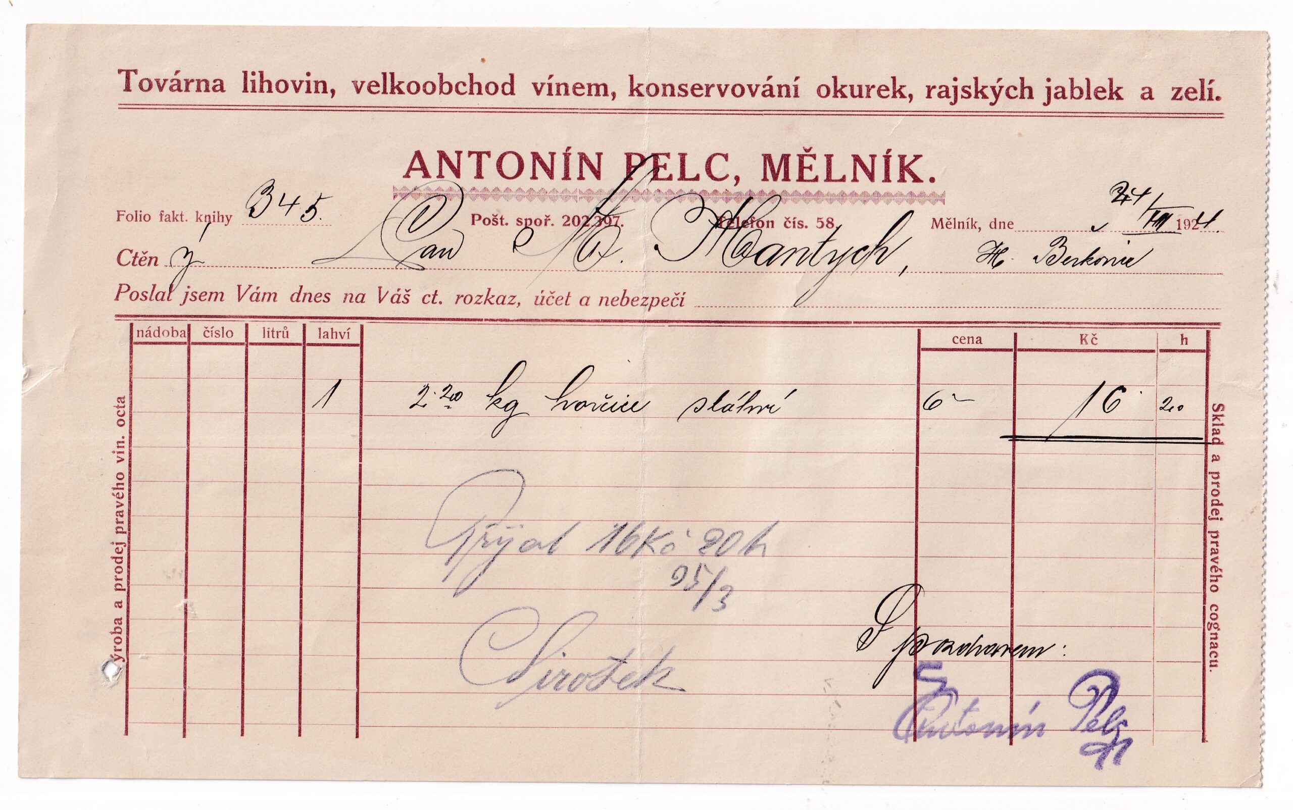 HomeObchodÚčtyÚčet, velkoobchod vínem, zelí, aj., Mělník, 1924
