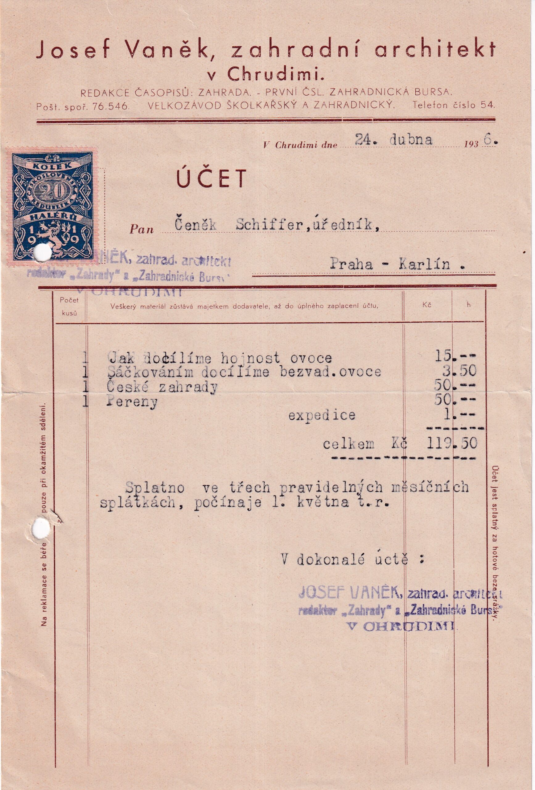 Účet, Zahradní architekt, Chrudim, 1936