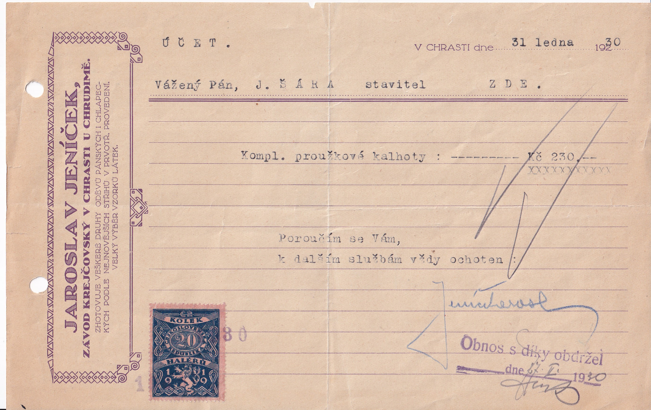 HomeObchodÚčtyÚčet, Závod krejčovský, Chrast, Chrudim, 1930