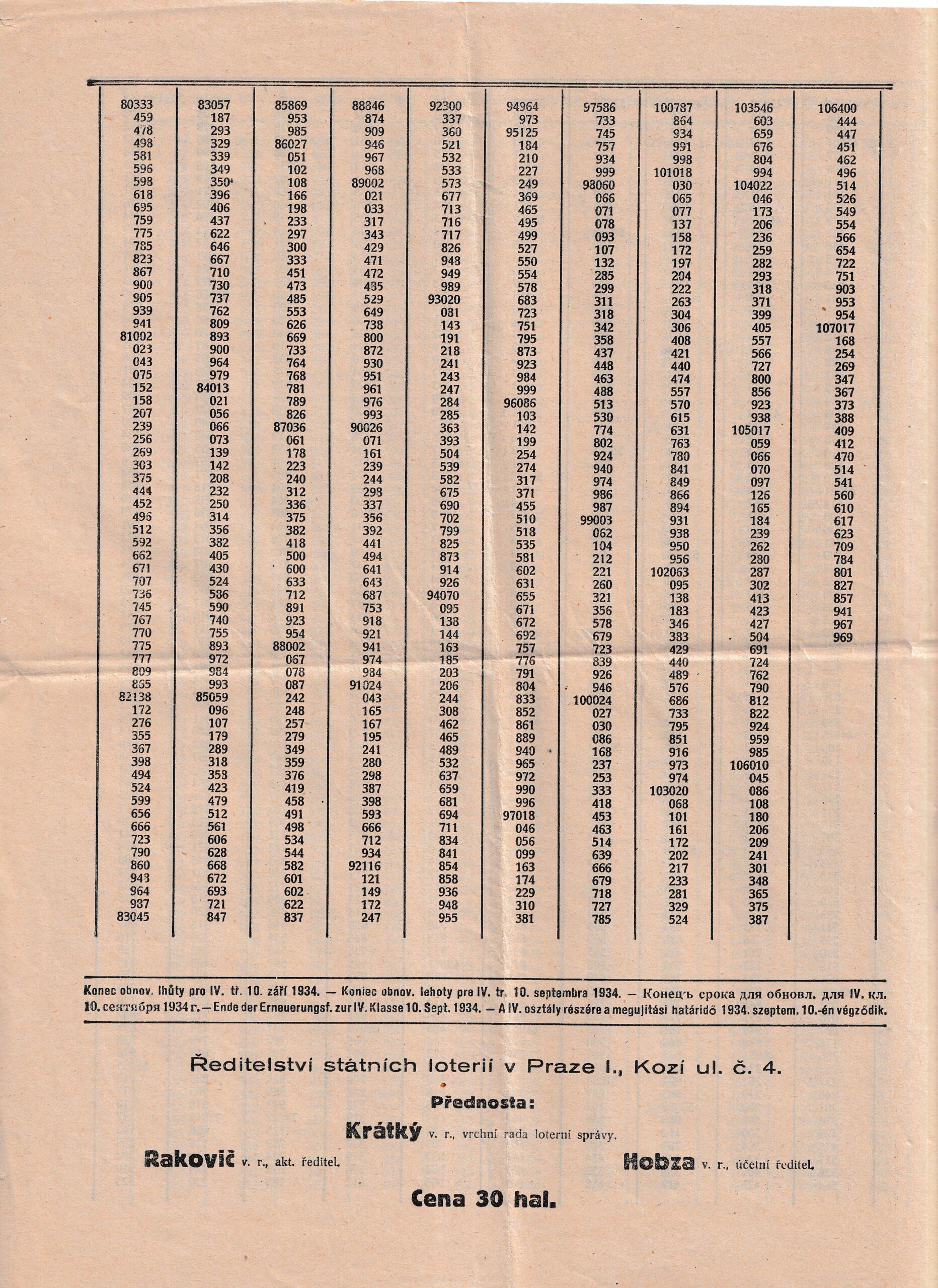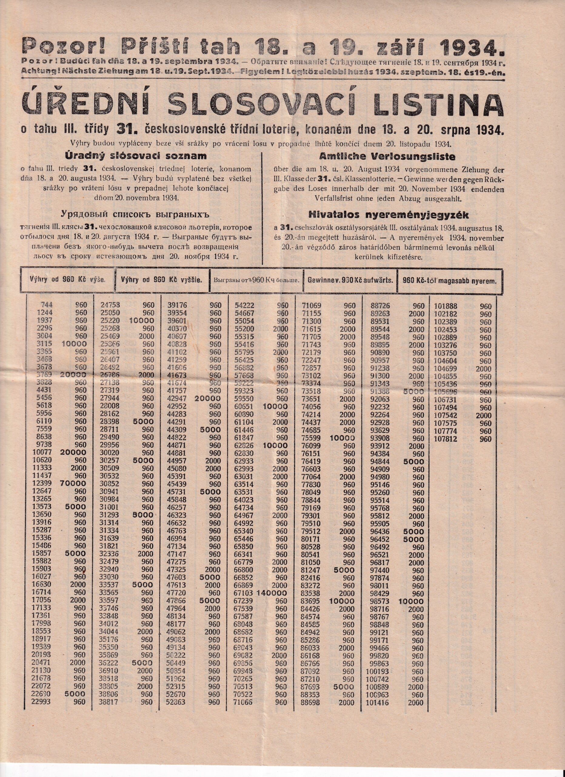Úřední slosovací listina, ředitelství státních loterií Praha srpen1934