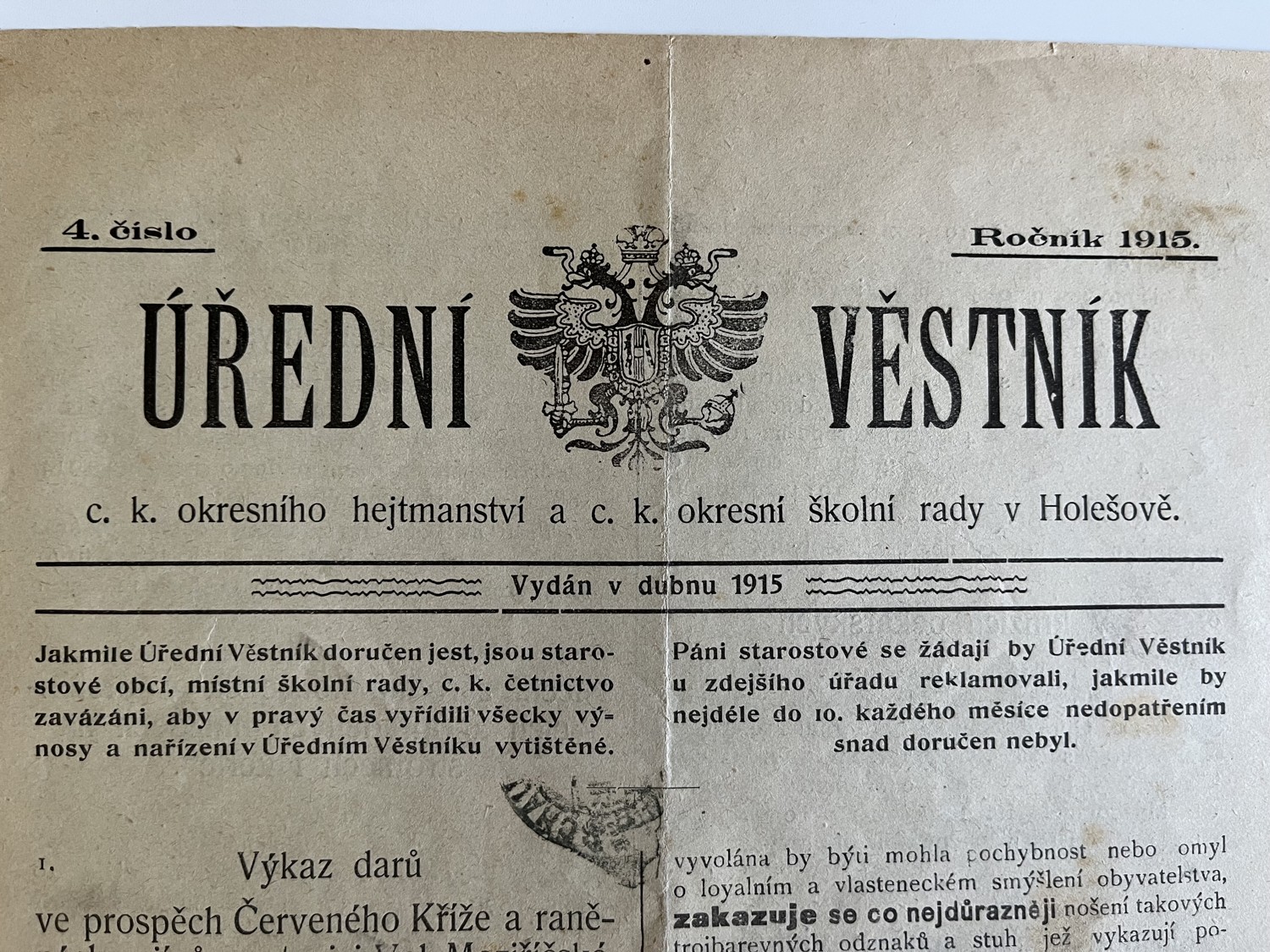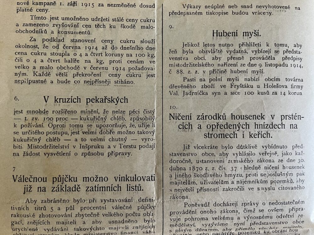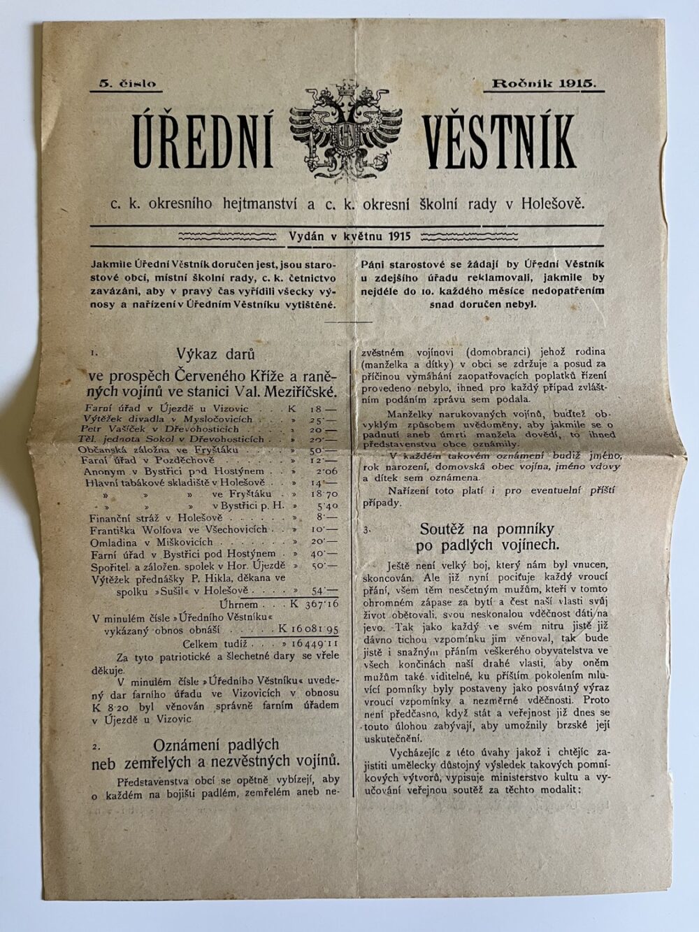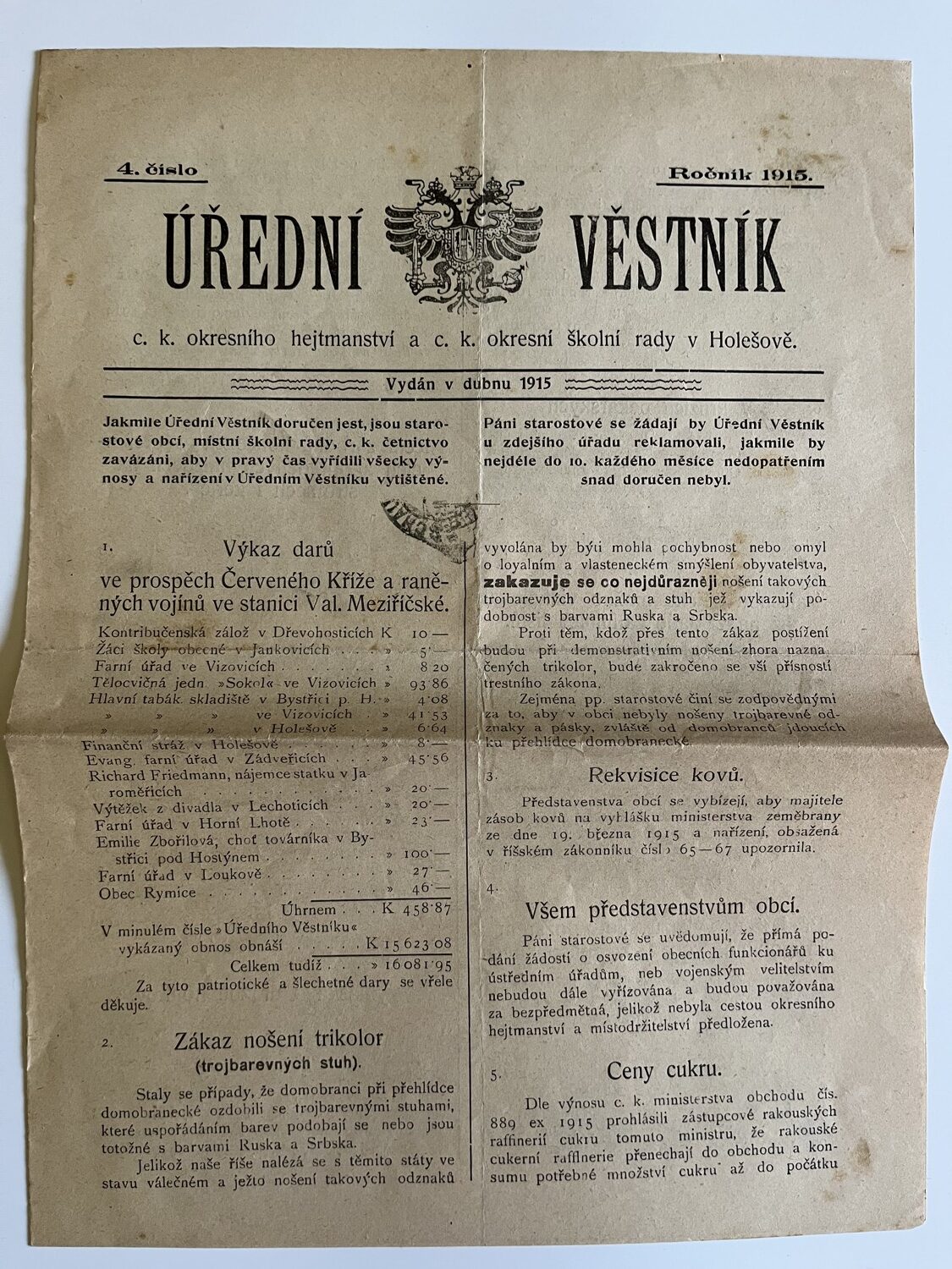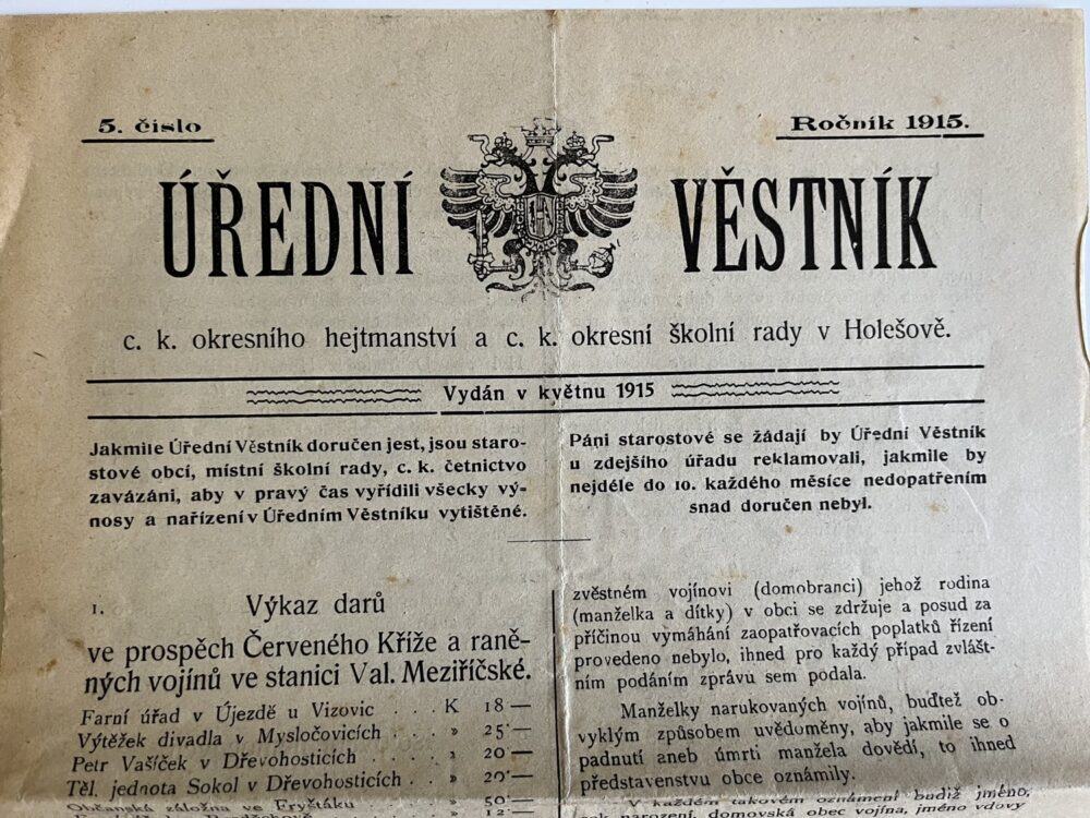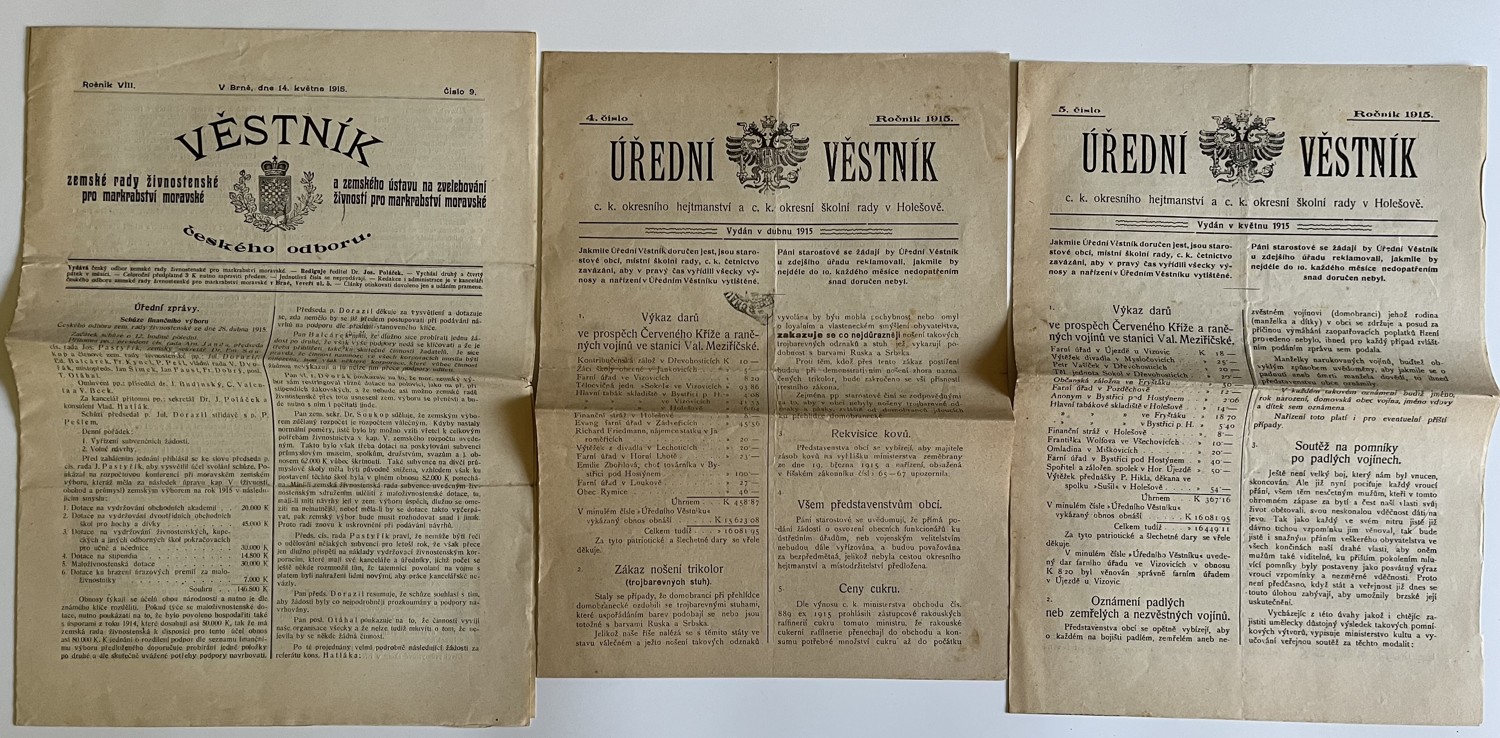 (hhj 26) Úřední věstník c. k. okresní hejtmanství a c. k. školní rady v Holešově, 4.číslo. Vydán v dubnu 1915. Z obsahu: 19 bodů, např. 1. Výkaz darů. 2. Zákaz nošení trikolor. 5. Ceny cukru. 9. Hubení myší. 17. Chov dobytka aj., 4 strany. Úřední věstník c. k. okresní hejtmanství a c. k. školní rady v Holešově, 5.číslo. Vydán v květnu 1915. Z obsahu: 13 bodů, např. 3. Soutěž na pomníky po padlých vojínech. 4. Péče o uprchlíky. 6. Isolování nemocných. 11. Ničení škodlivého hmyzu. 13. Vyhláška aj., 4 strany. Věstník českého odboru – zemské rady žinvostenské pro markrabství moravské a zemského ústavu na zvelebování živností pro markrabství moravské. Ročník VIII. V Brně, dne 14.května 1915, číslo 9., 8 stran.
