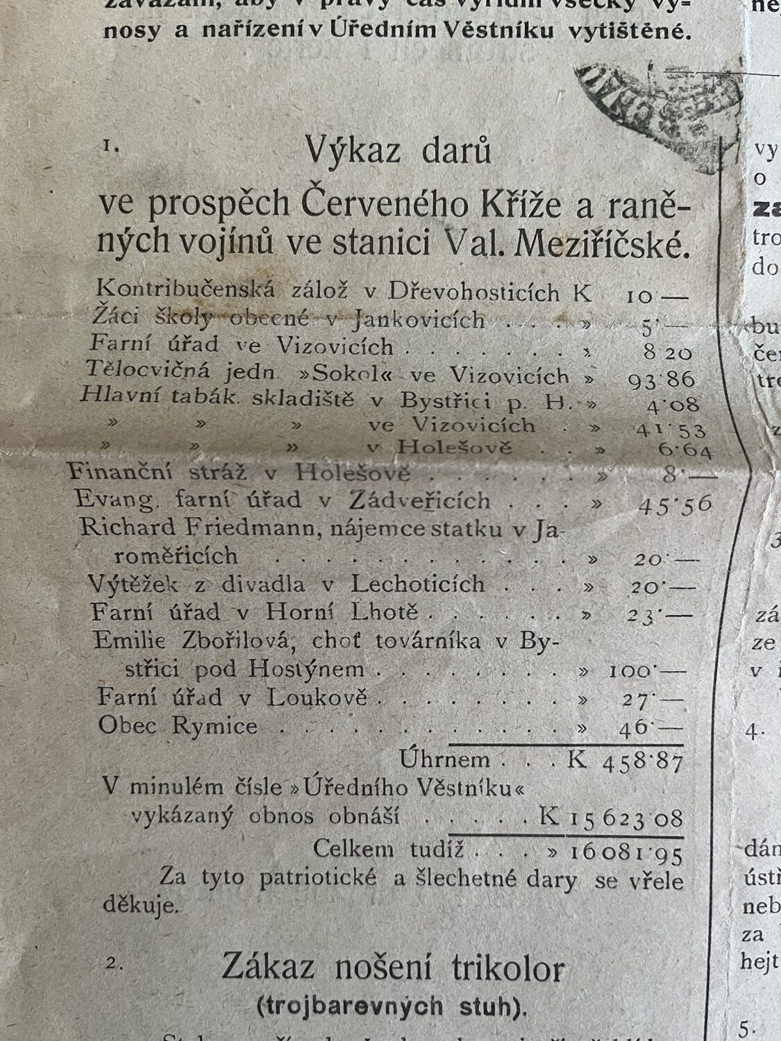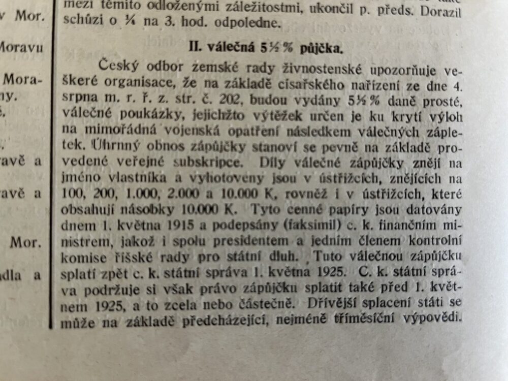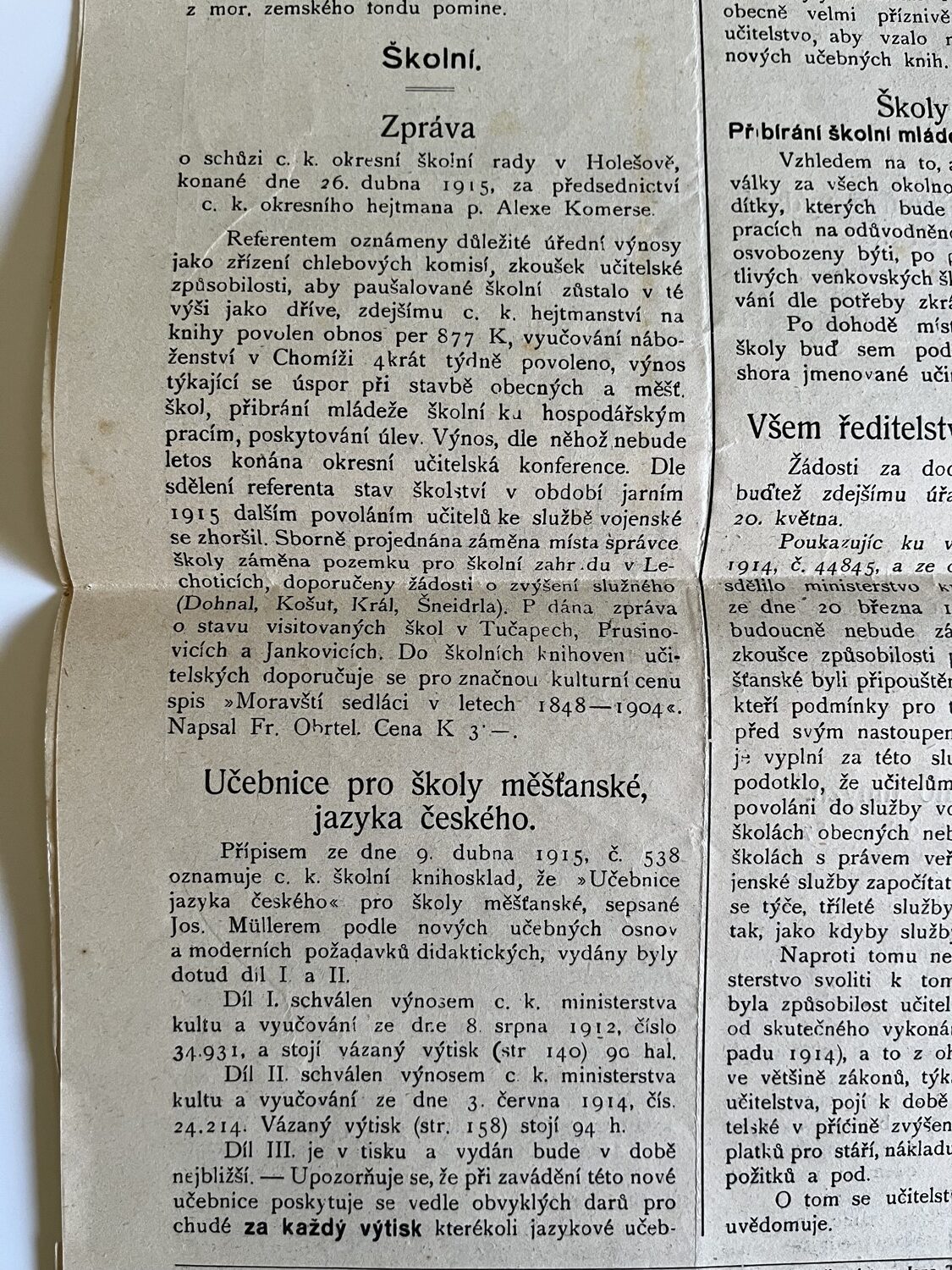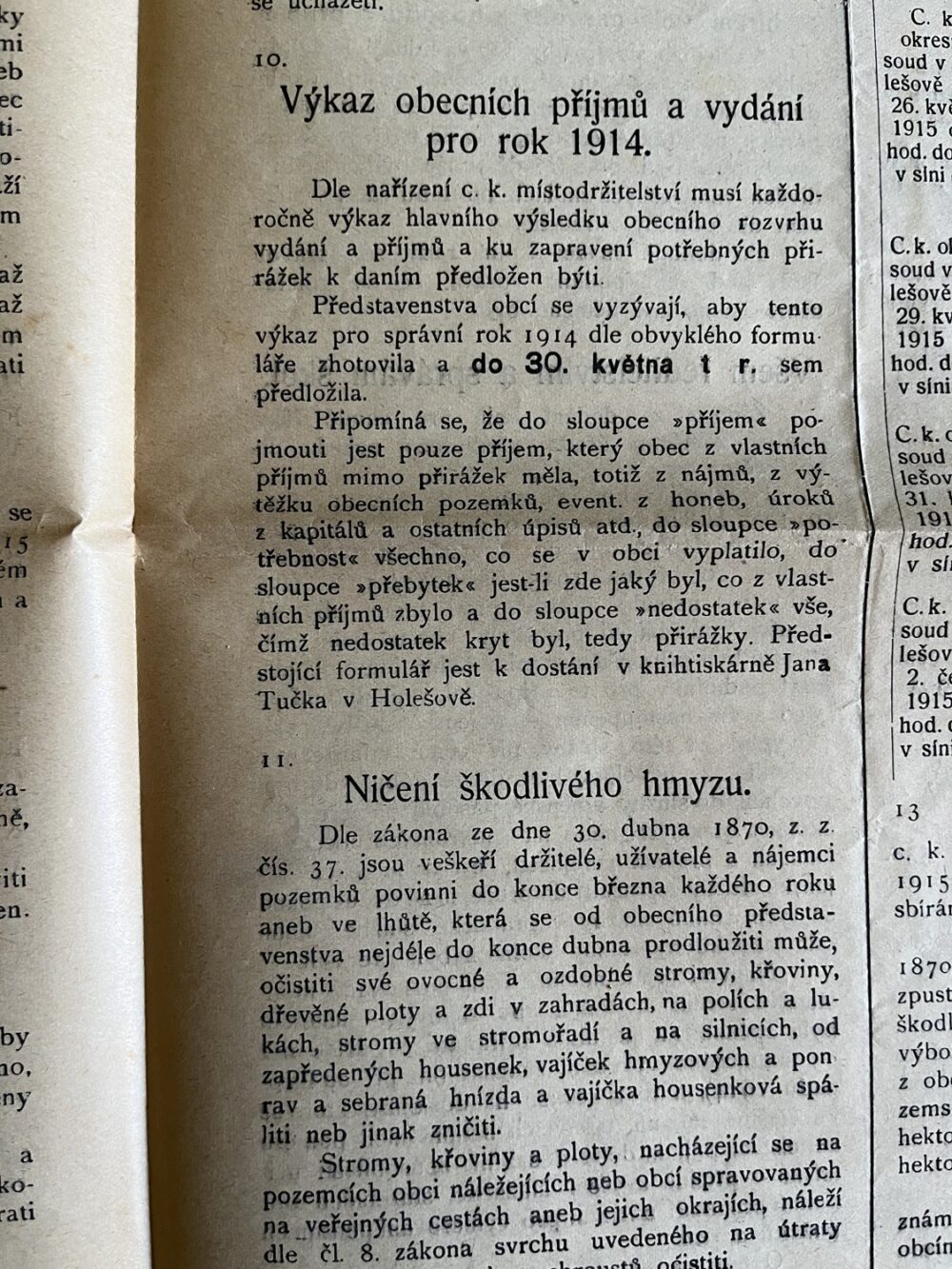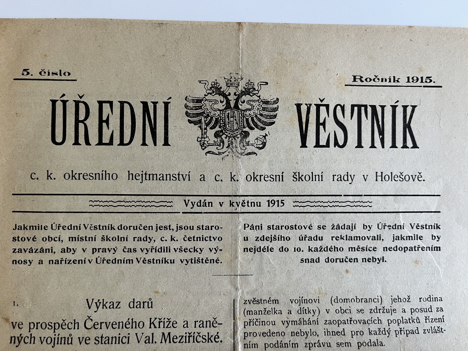(hhj 26) Úřední věstník c. k. okresní hejtmanství a c. k. školní rady v Holešově, 4.číslo. Vydán v dubnu 1915. Z obsahu: 19 bodů, např. 1. Výkaz darů. 2. Zákaz nošení trikolor. 5. Ceny cukru. 9. Hubení myší. 17. Chov dobytka aj., 4 strany. Úřední věstník c. k. okresní hejtmanství a c. k. školní rady v Holešově, 5.číslo. Vydán v květnu 1915. Z obsahu: 13 bodů, např. 3. Soutěž na pomníky po padlých vojínech. 4. Péče o uprchlíky. 6. Isolování nemocných. 11. Ničení škodlivého hmyzu. 13. Vyhláška aj., 4 strany. Věstník českého odboru – zemské rady žinvostenské pro markrabství moravské a zemského ústavu na zvelebování živností pro markrabství moravské. Ročník VIII. V Brně, dne 14.května 1915, číslo 9., 8 stran.
