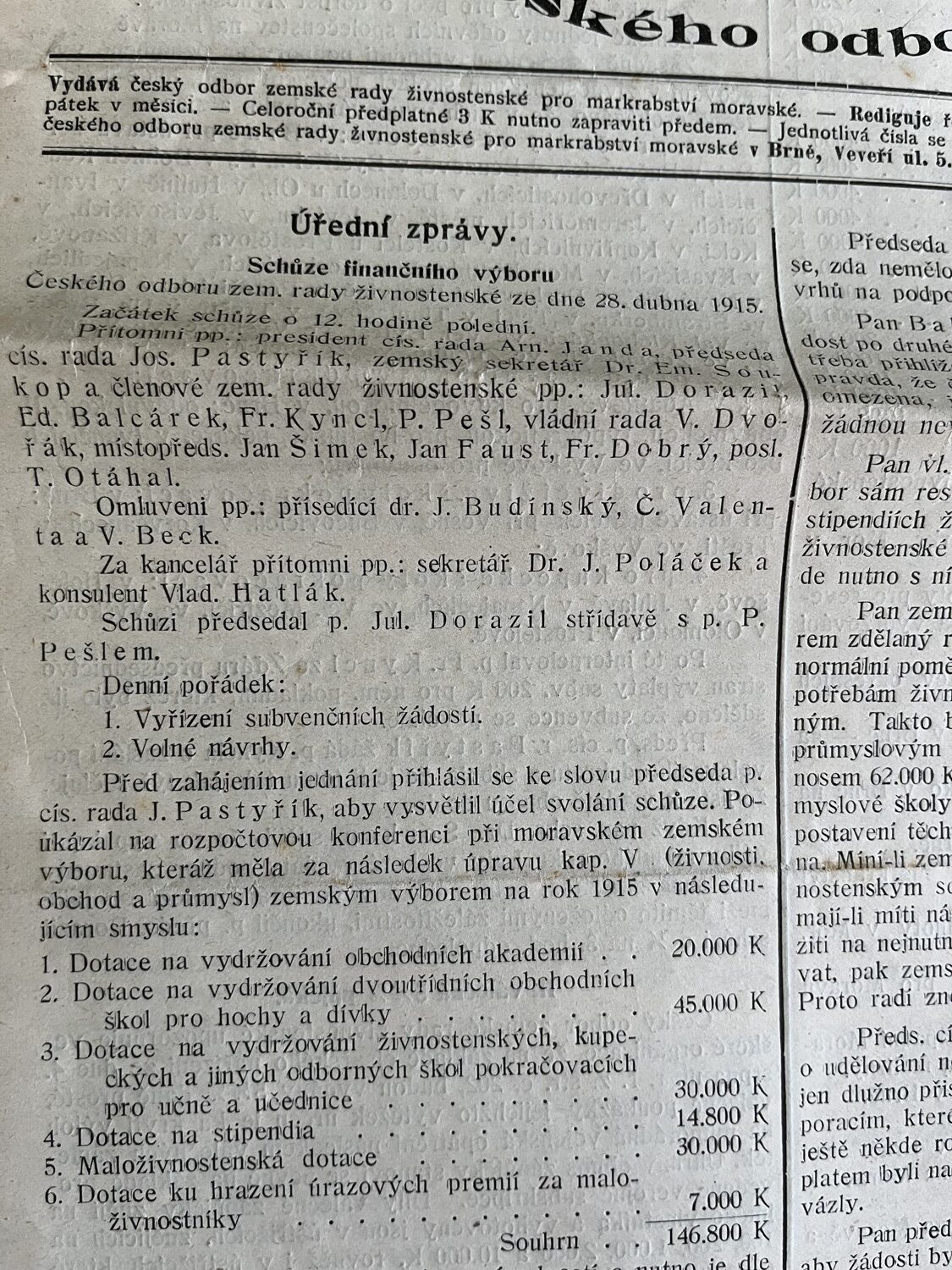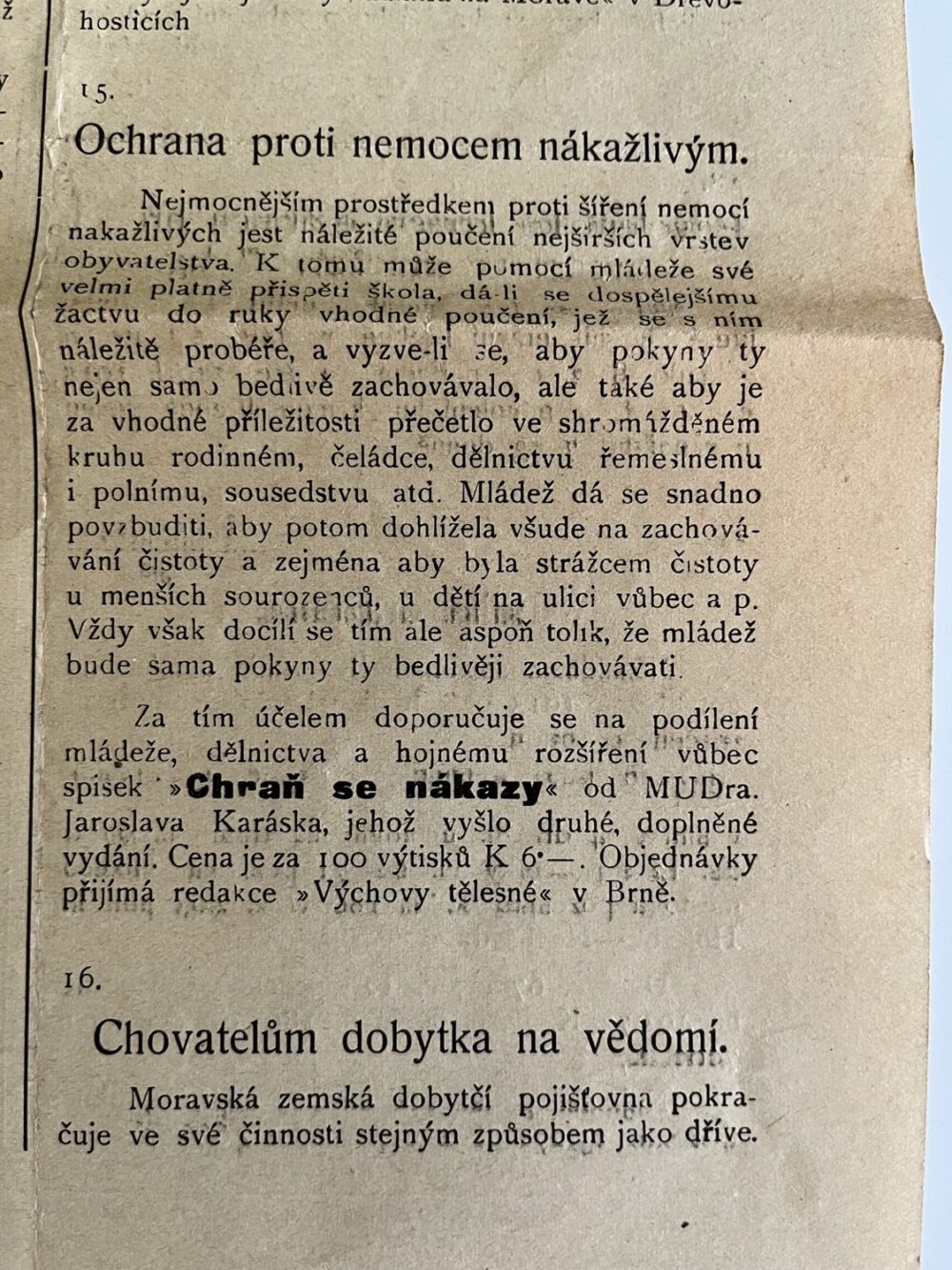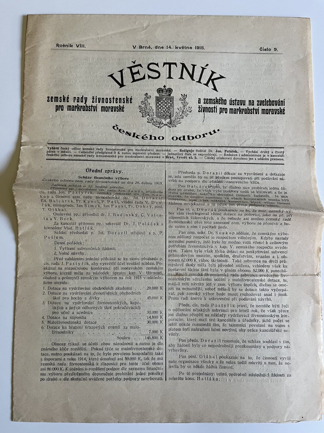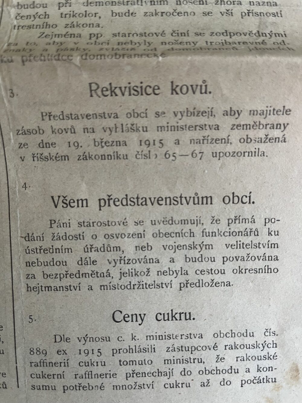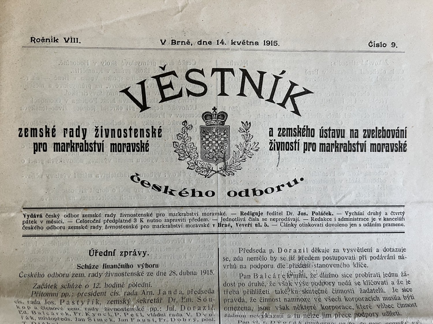 (hhj 26) Úřední věstník c. k. okresní hejtmanství a c. k. školní rady v Holešově, 4.číslo. Vydán v dubnu 1915. Z obsahu: 19 bodů, např. 1. Výkaz darů. 2. Zákaz nošení trikolor. 5. Ceny cukru. 9. Hubení myší. 17. Chov dobytka aj., 4 strany. Úřední věstník c. k. okresní hejtmanství a c. k. školní rady v Holešově, 5.číslo. Vydán v květnu 1915. Z obsahu: 13 bodů, např. 3. Soutěž na pomníky po padlých vojínech. 4. Péče o uprchlíky. 6. Isolování nemocných. 11. Ničení škodlivého hmyzu. 13. Vyhláška aj., 4 strany. Věstník českého odboru – zemské rady žinvostenské pro markrabství moravské a zemského ústavu na zvelebování živností pro markrabství moravské. Ročník VIII. V Brně, dne 14.května 1915, číslo 9., 8 stran.