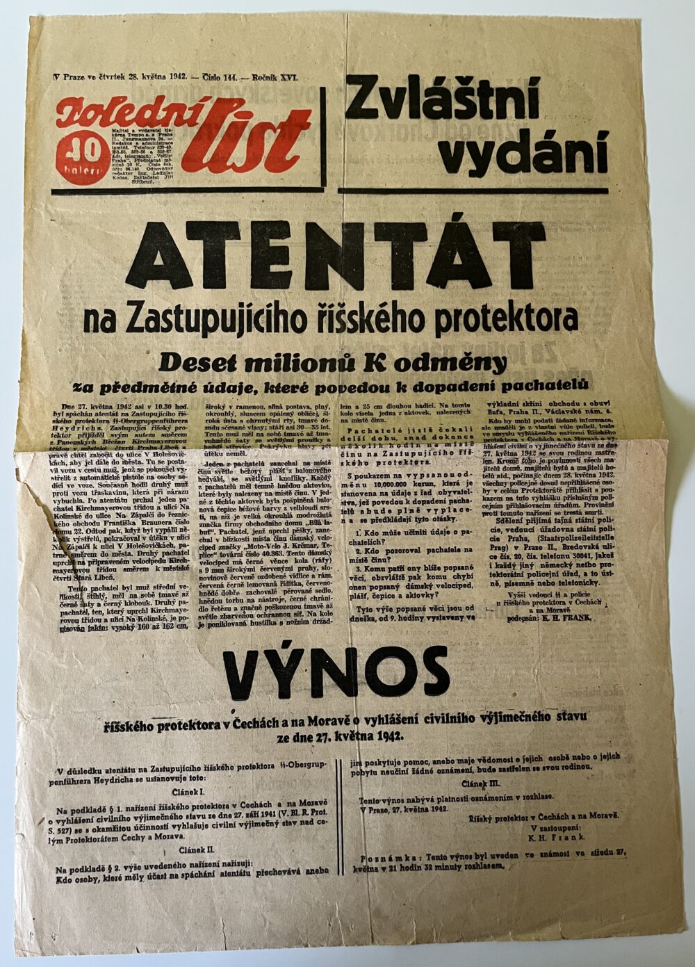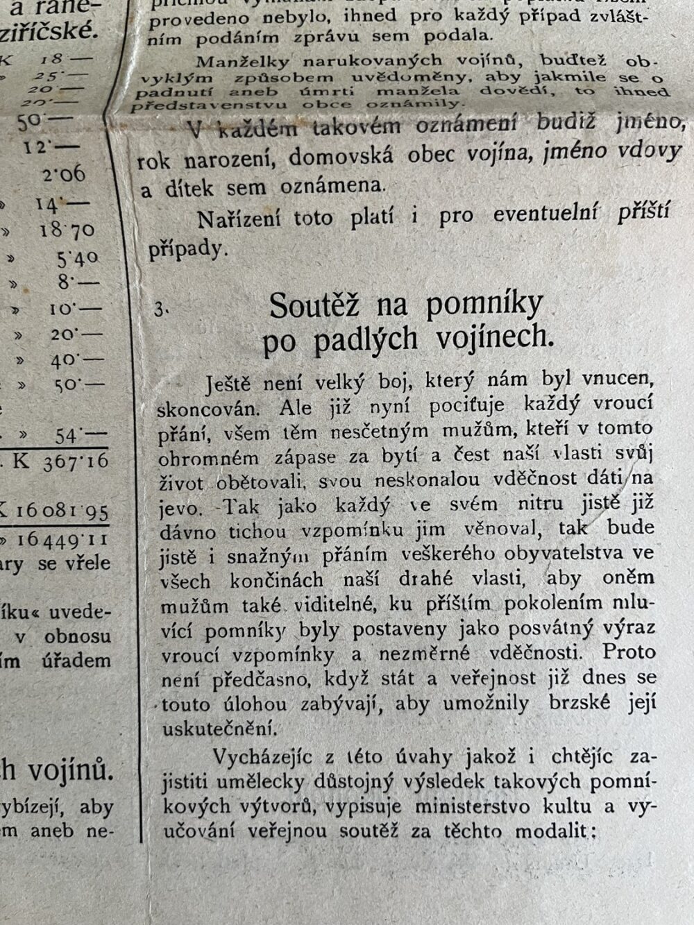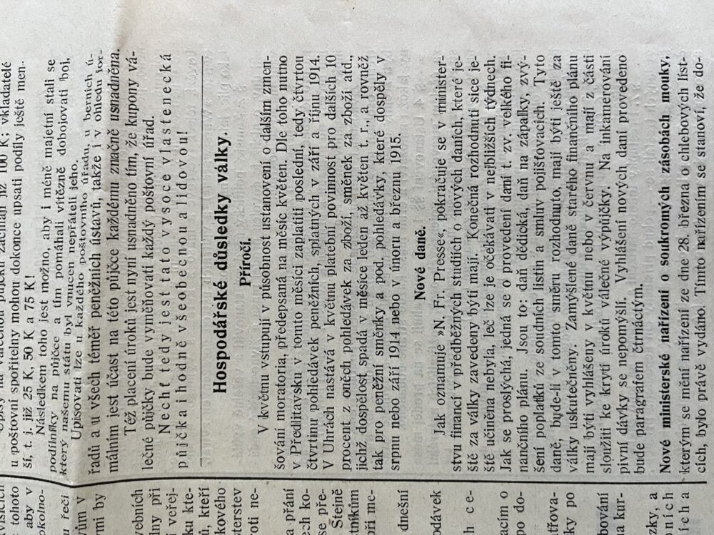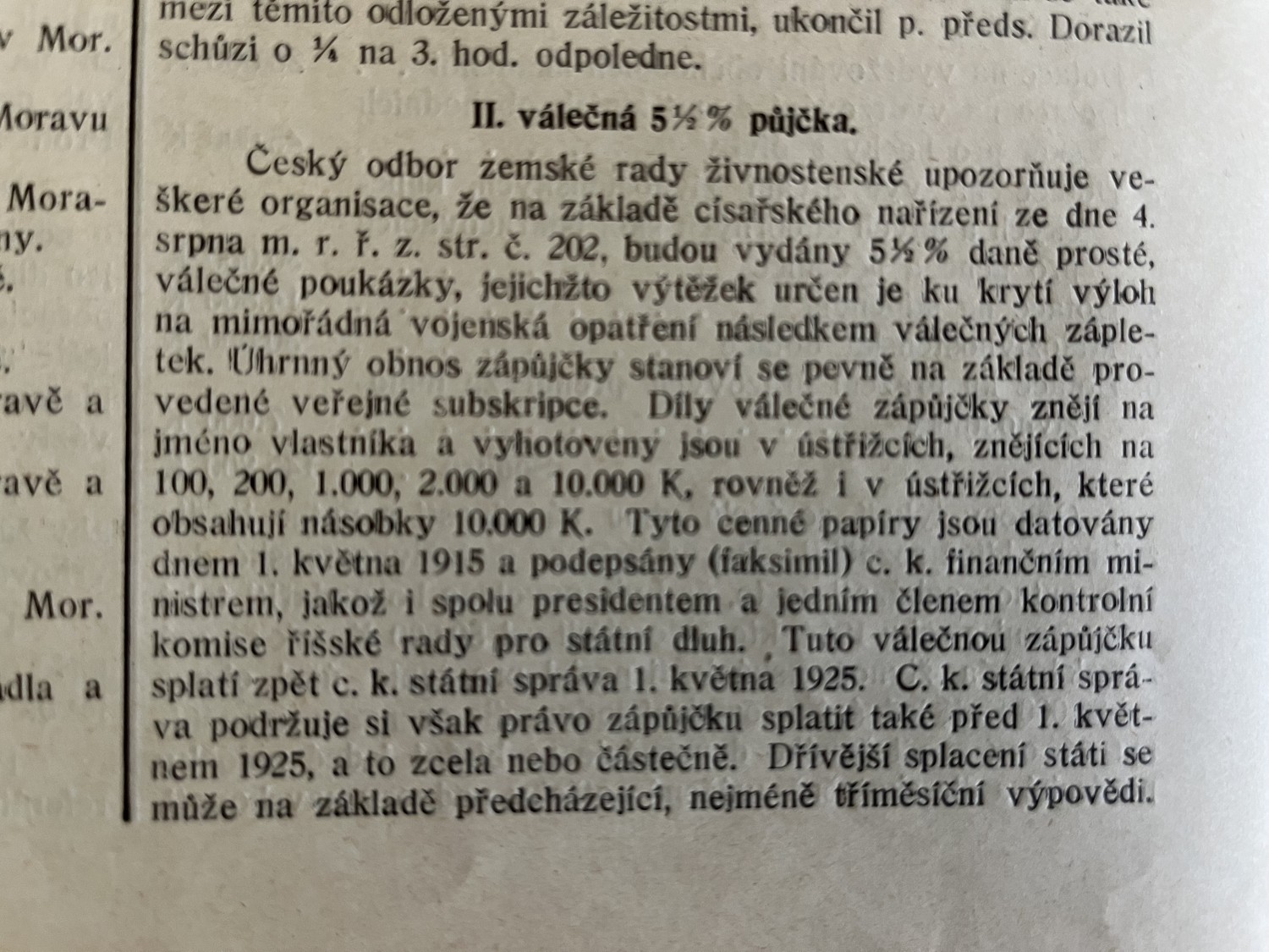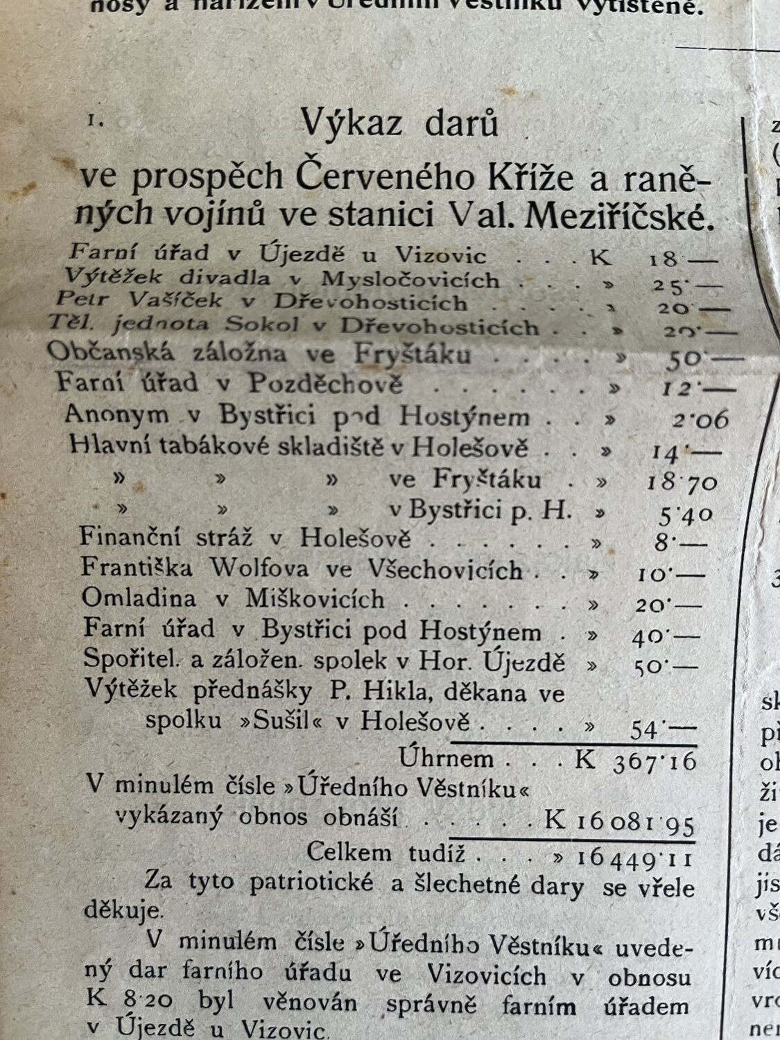 (hhj 26) Úřední věstník c. k. okresní hejtmanství a c. k. školní rady v Holešově, 4.číslo. Vydán v dubnu 1915. Z obsahu: 19 bodů, např. 1. Výkaz darů. 2. Zákaz nošení trikolor. 5. Ceny cukru. 9. Hubení myší. 17. Chov dobytka aj., 4 strany. Úřední věstník c. k. okresní hejtmanství a c. k. školní rady v Holešově, 5.číslo. Vydán v květnu 1915. Z obsahu: 13 bodů, např. 3. Soutěž na pomníky po padlých vojínech. 4. Péče o uprchlíky. 6. Isolování nemocných. 11. Ničení škodlivého hmyzu. 13. Vyhláška aj., 4 strany. Věstník českého odboru – zemské rady žinvostenské pro markrabství moravské a zemského ústavu na zvelebování živností pro markrabství moravské. Ročník VIII. V Brně, dne 14.května 1915, číslo 9., 8 stran.