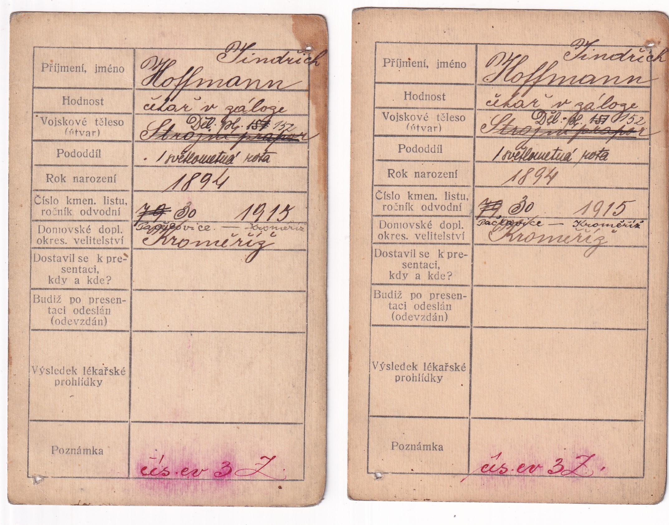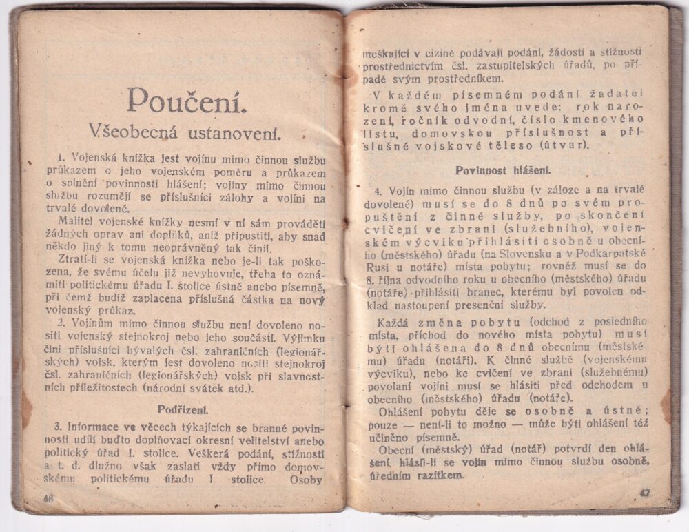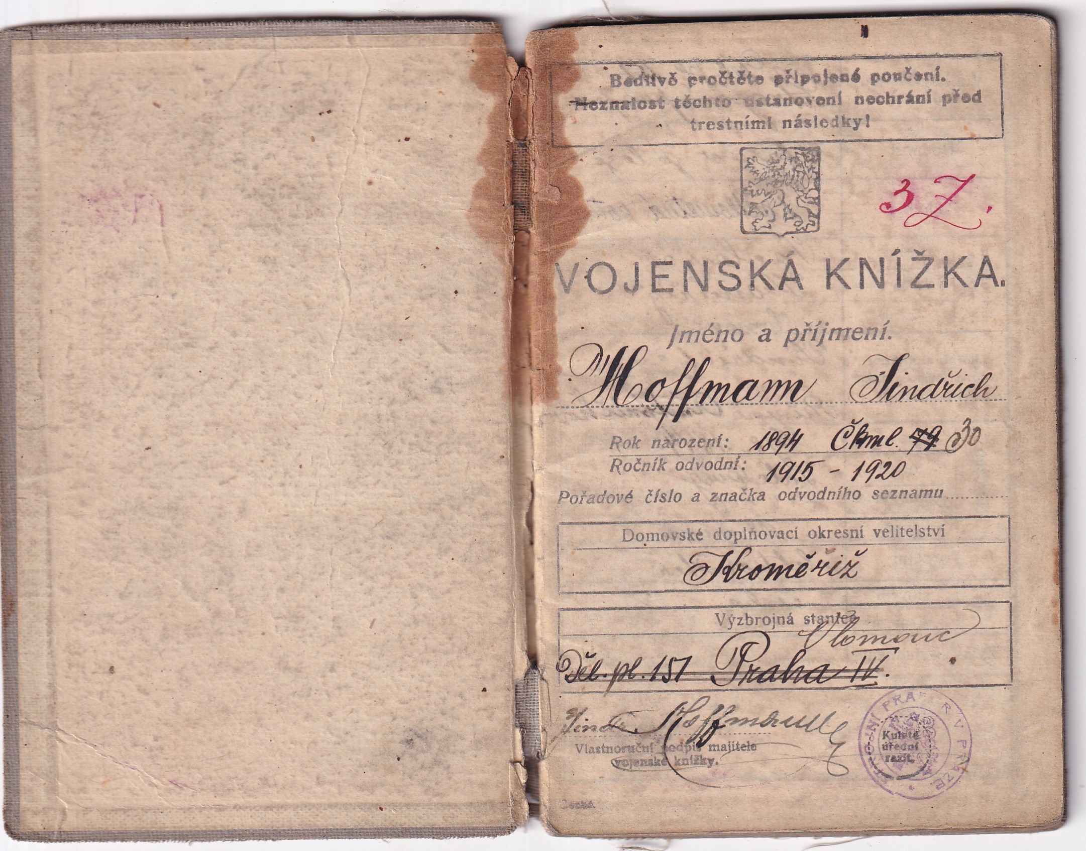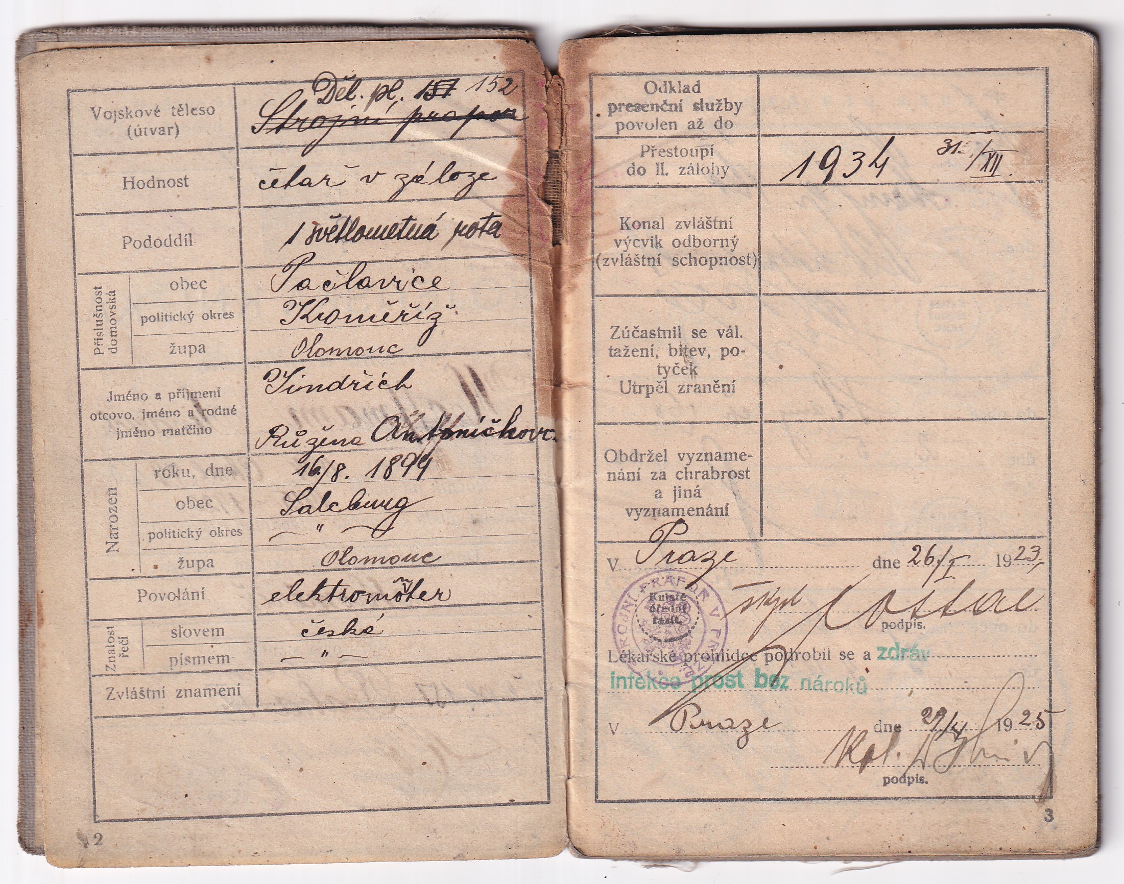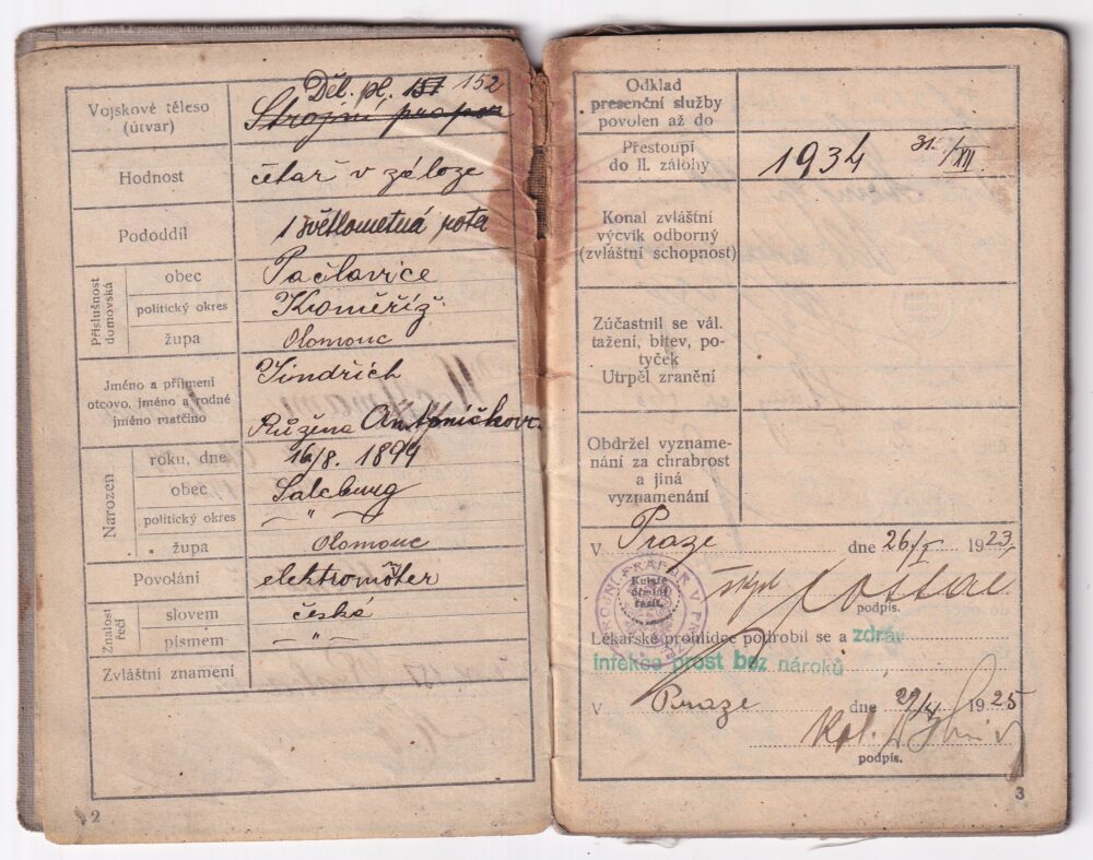 19 (K3-2) Rozměr 9 x 14 cm. Vojenská knížka – Domovské doplňovací okresní velitelství Kroměříž. Četař v záloze. Razítka. počet stran 52 + ě x kartička k lékařské prohlídce 8,5 x 13,5 cm.