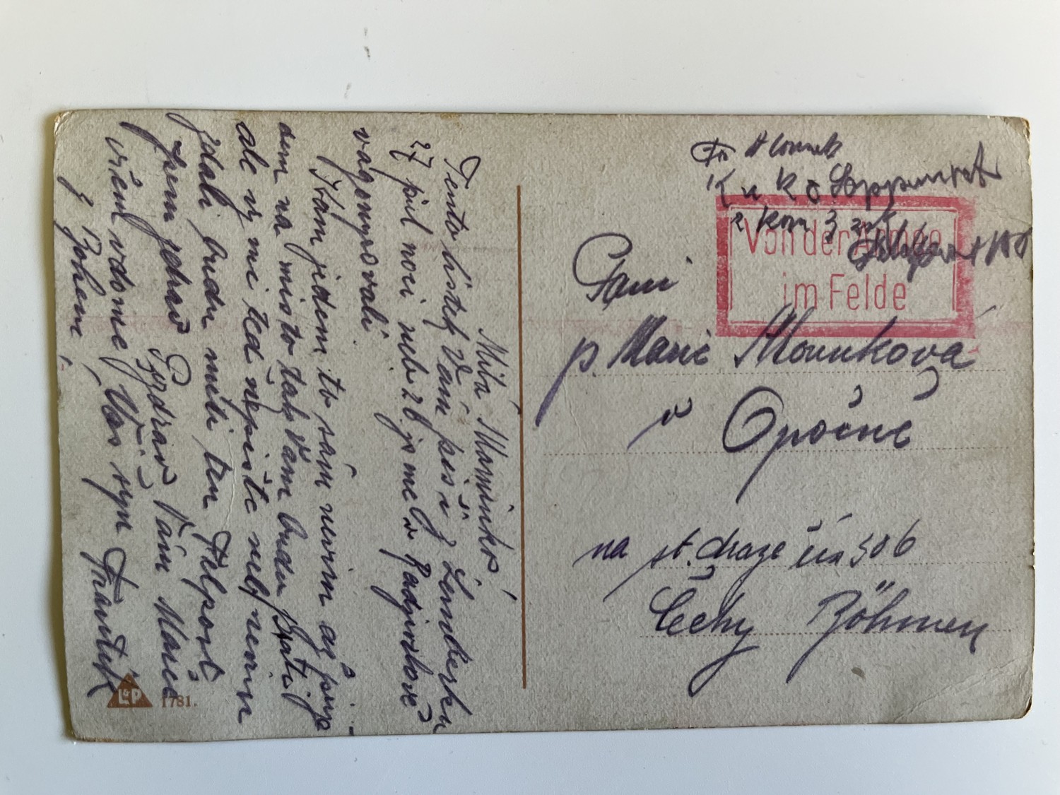 (hhl 45) MF prošlá. Razítko Von Der Armee im Felde – Z armády v poli. Adresát v Opočně (okres Rychnov nad Kněžnou)