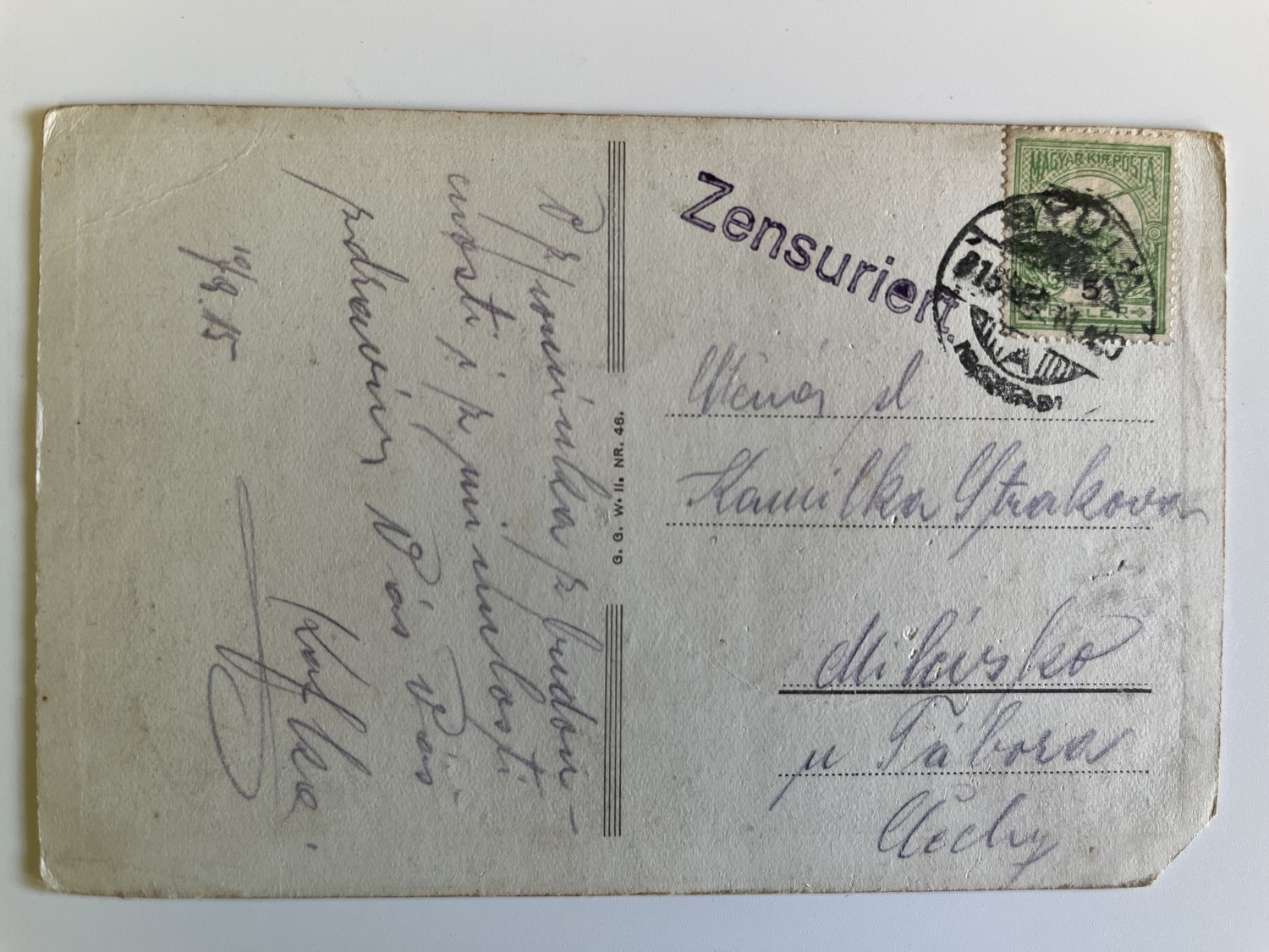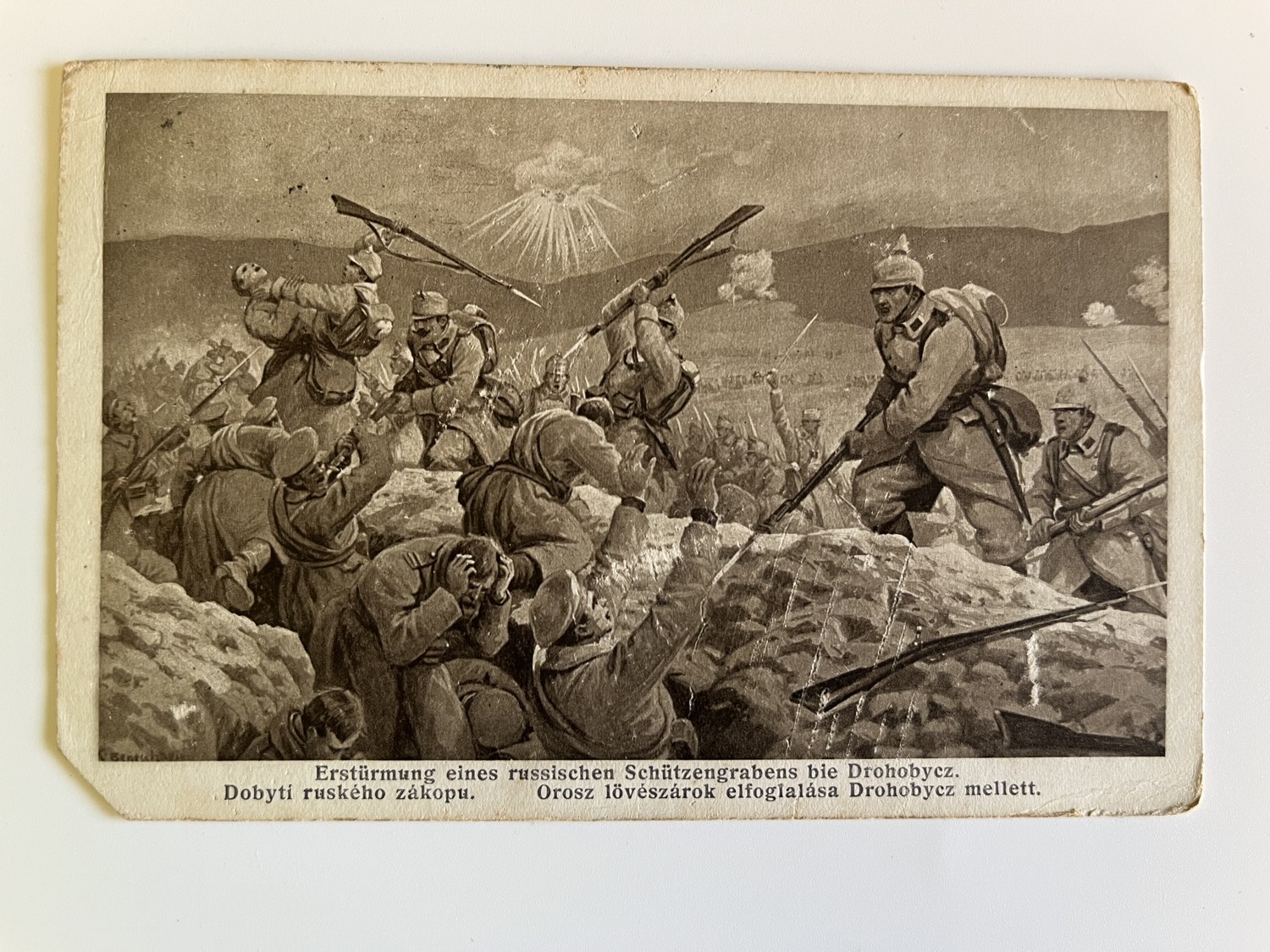 (hhl 83) MF pohlednice prošlá, 1915. Vojáci, bitva, bojiště, pušky, výzbroj, výstroj.